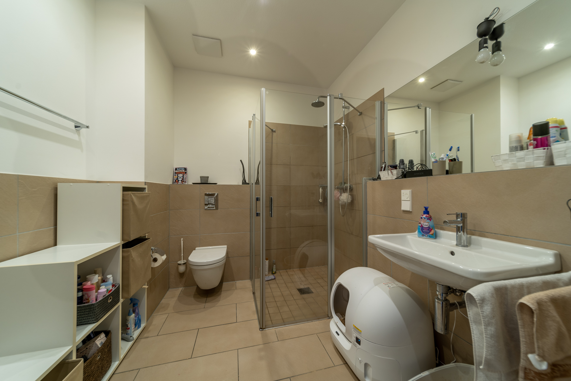Das Badezimmer bietet neben ausreichend Platz eine Dusche und eine Handtuchheizung.