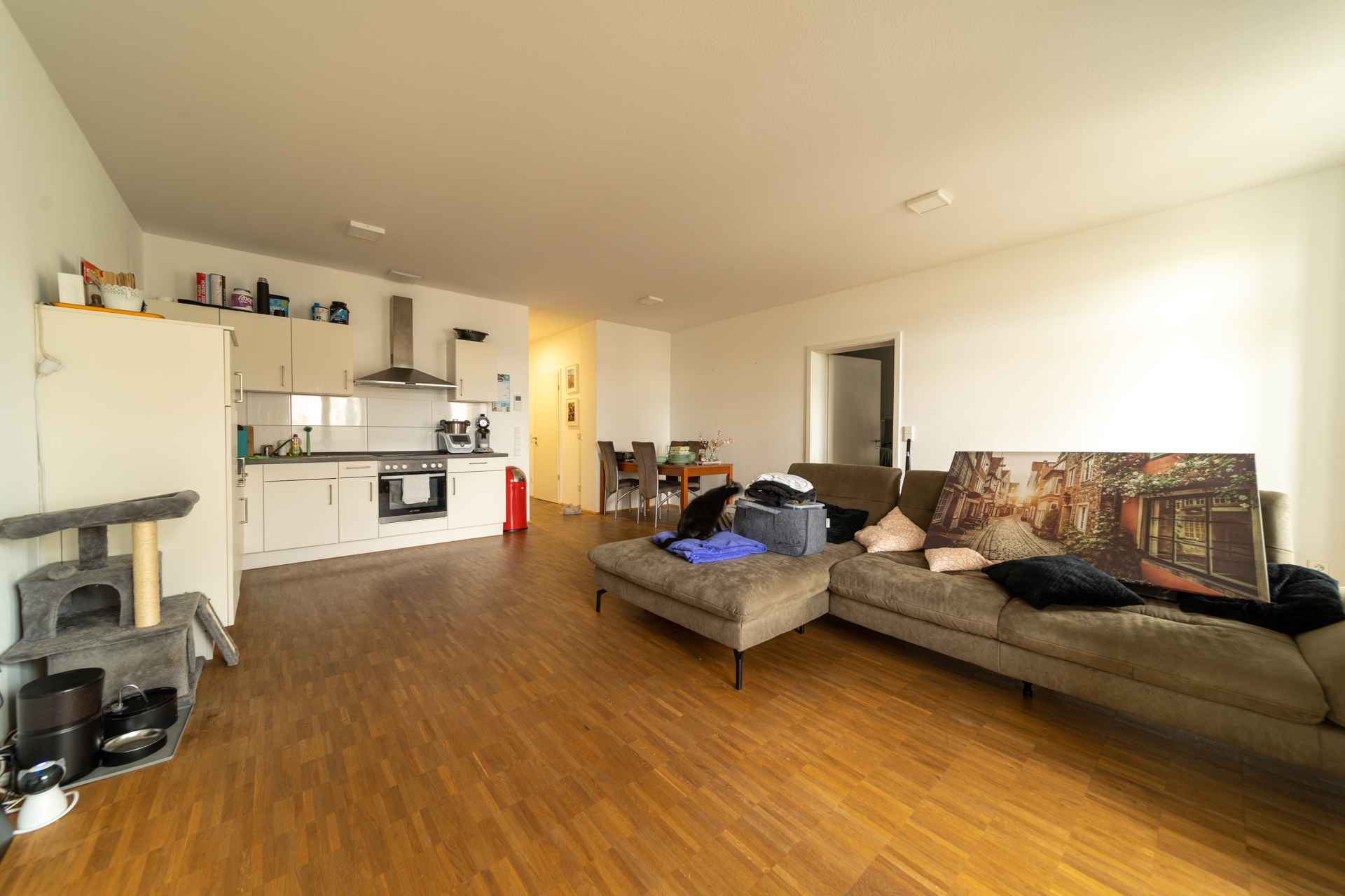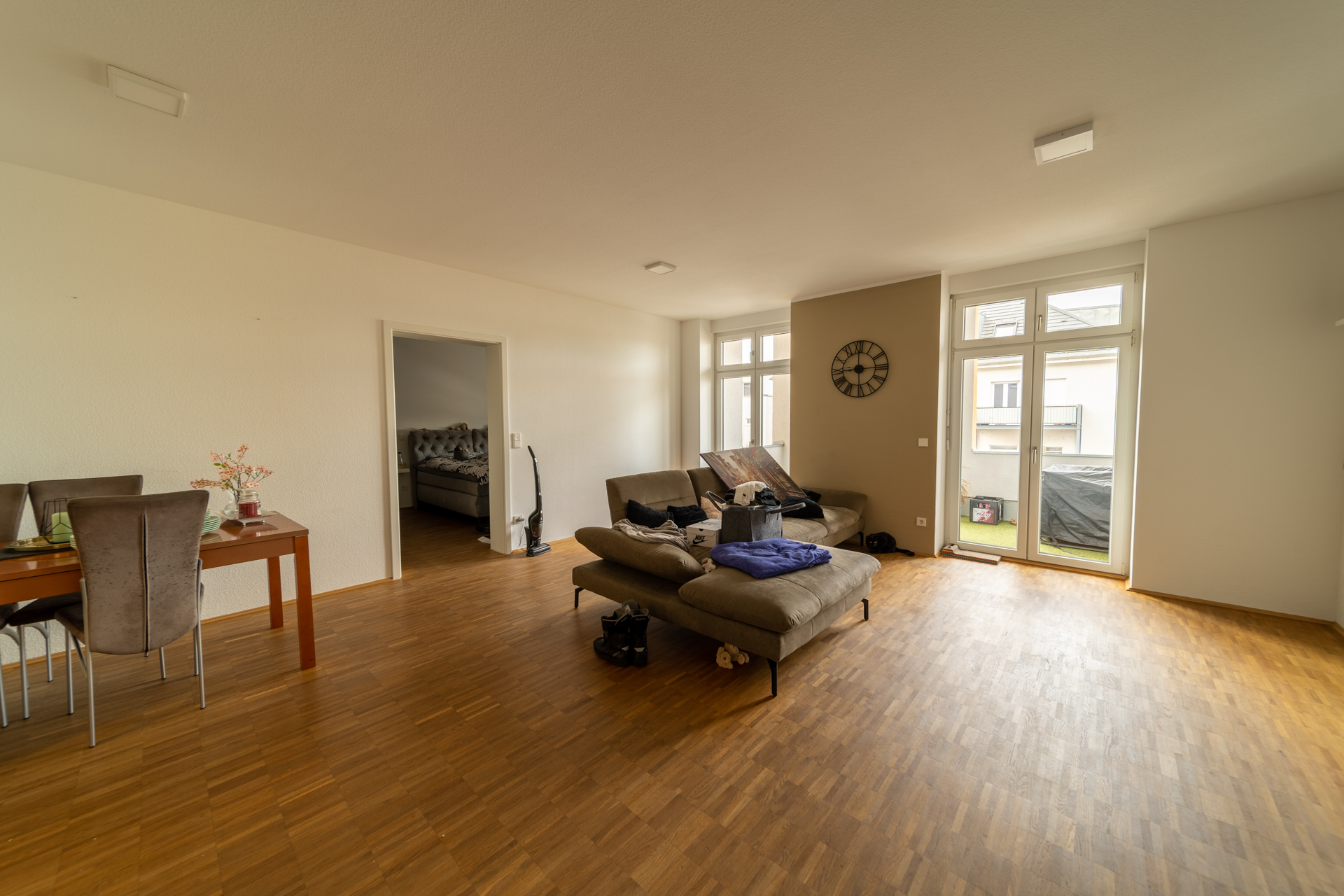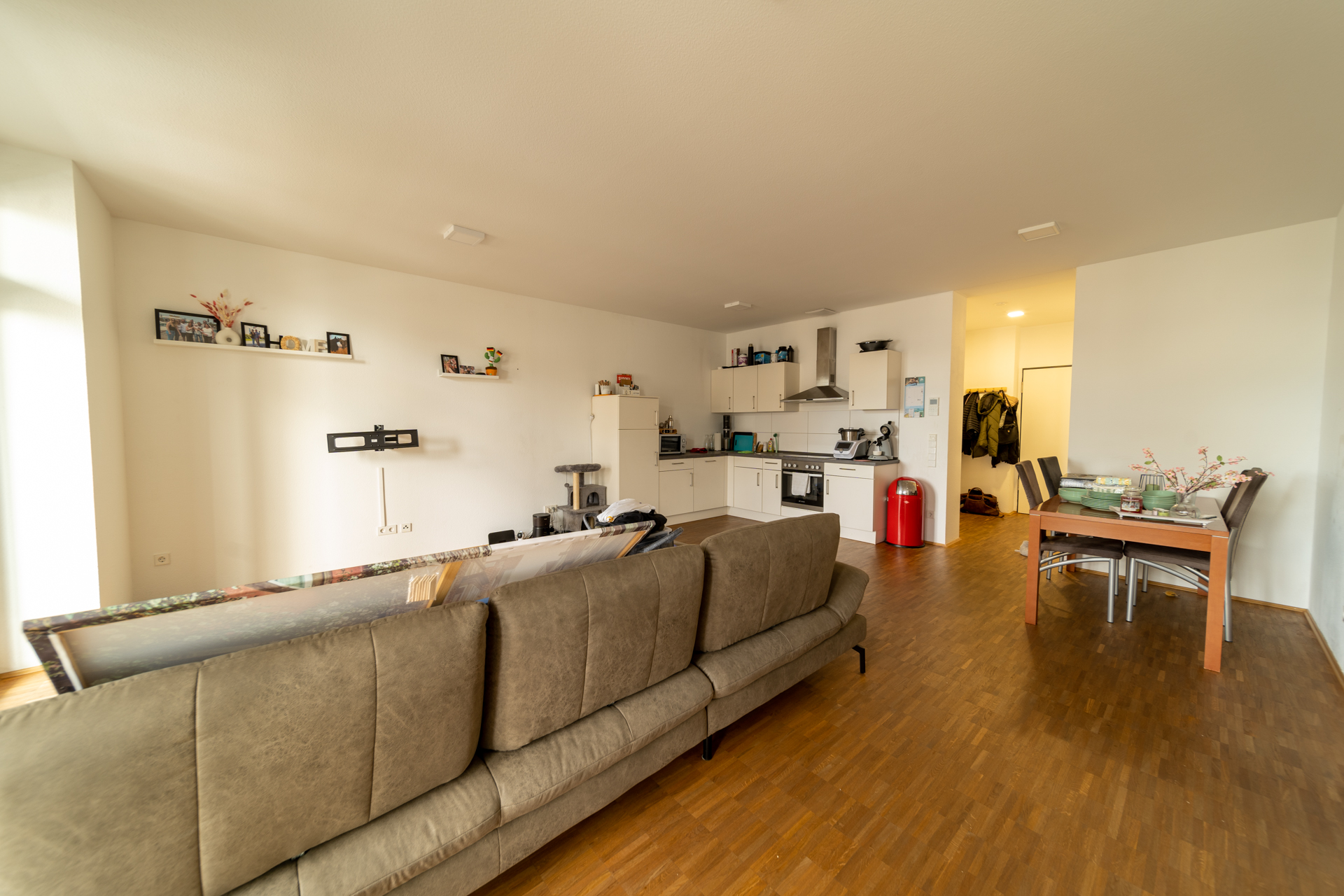 Das Herzstück der knapp 74 m2 großen Wohnung ist das Wohnzimmer mit offener Wohnküche. Von hier aus gelangen Sie direkt auf die überdachte Loggia, die Ihnen einen Rückzugsort im Freien bietet – ideal, um den Tag entspannt ausklingen zu lassen.