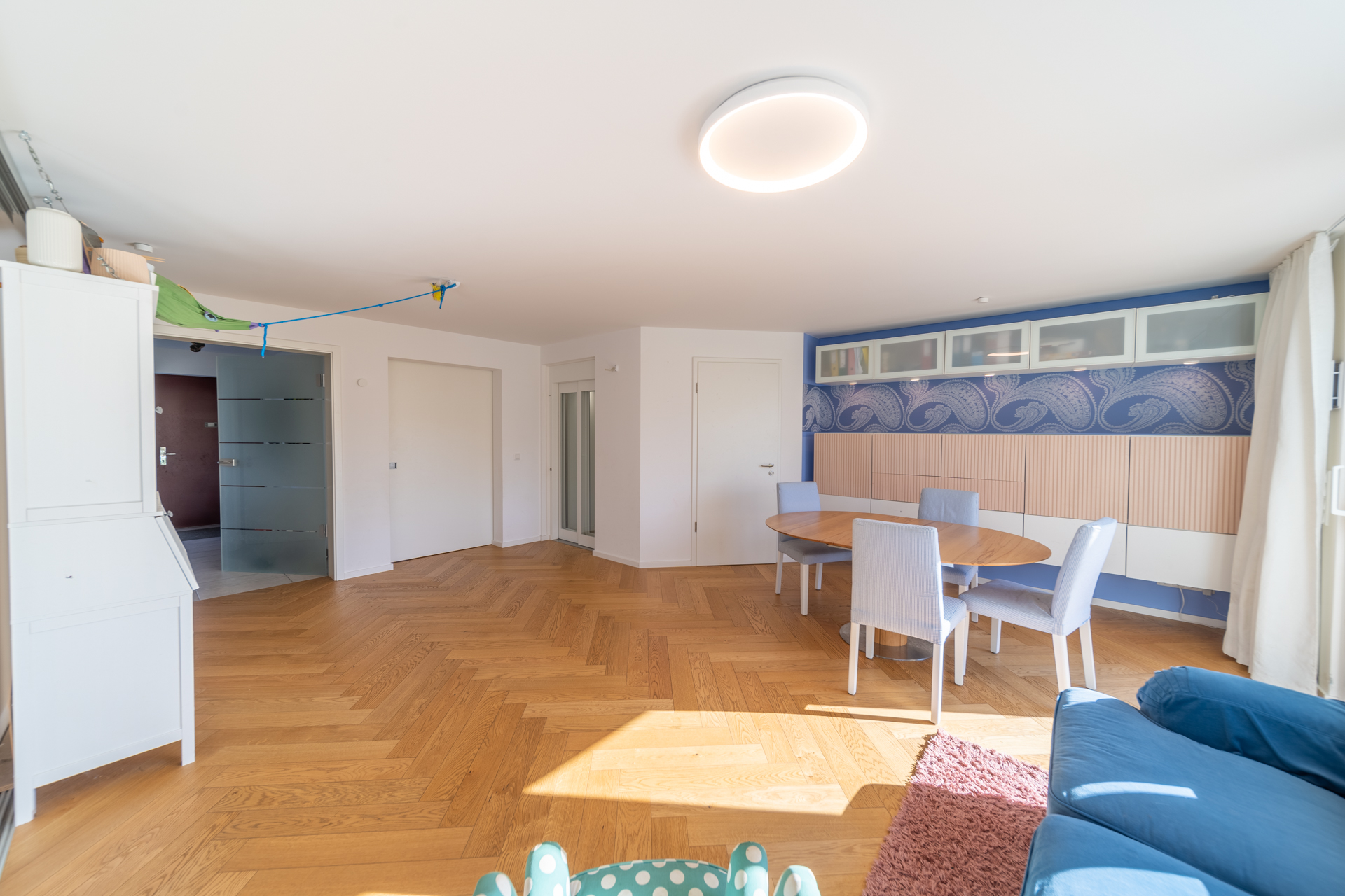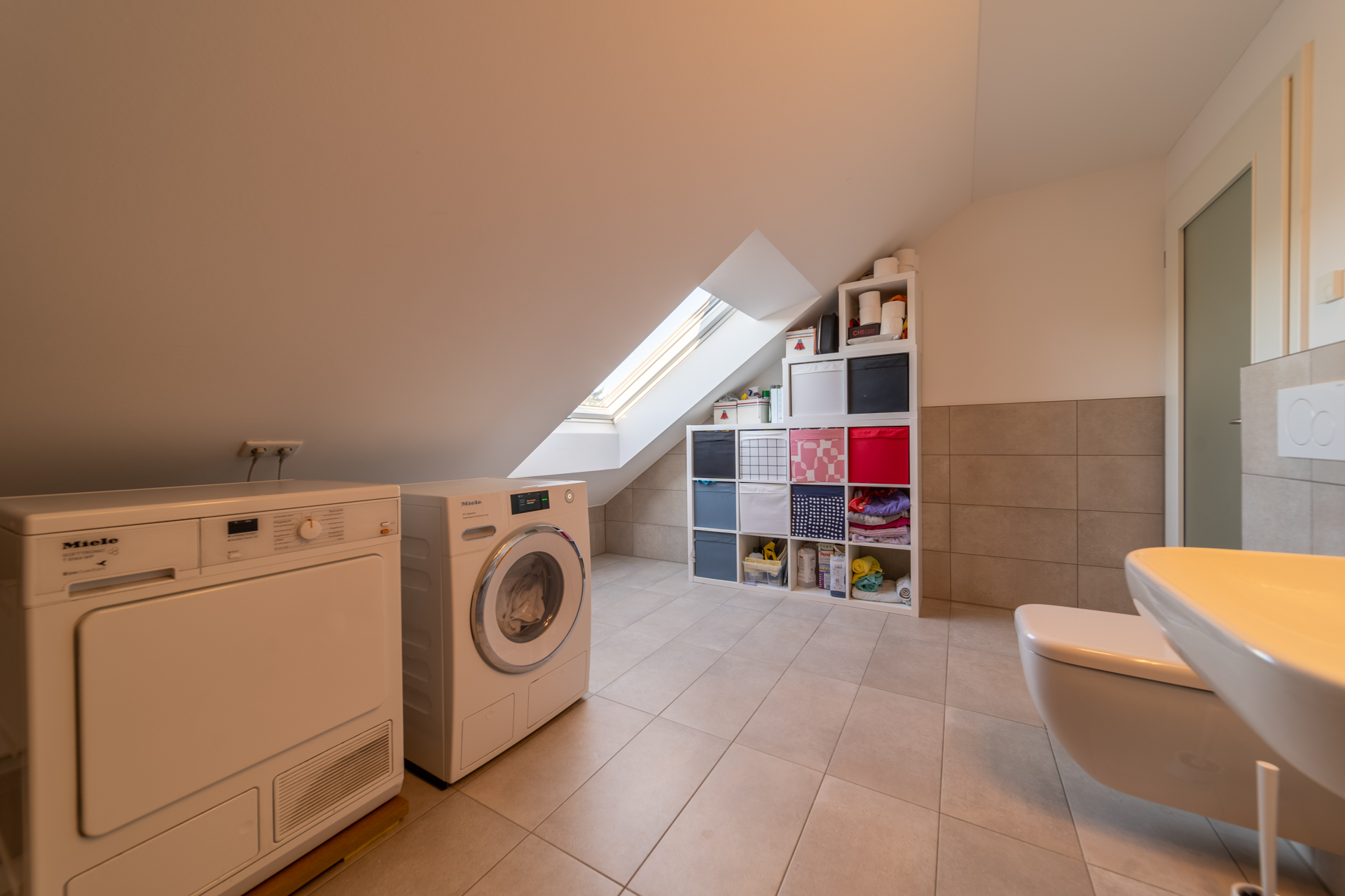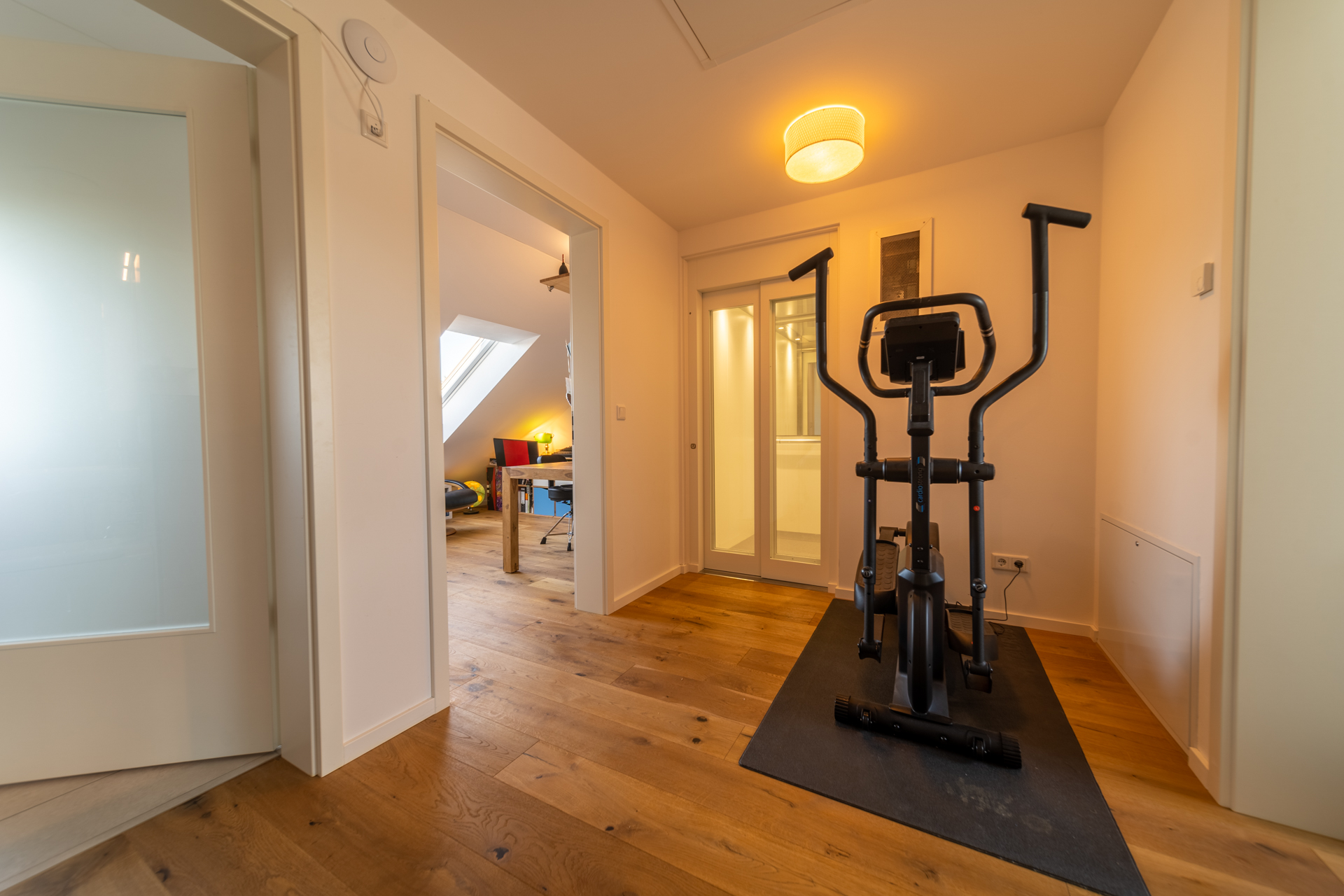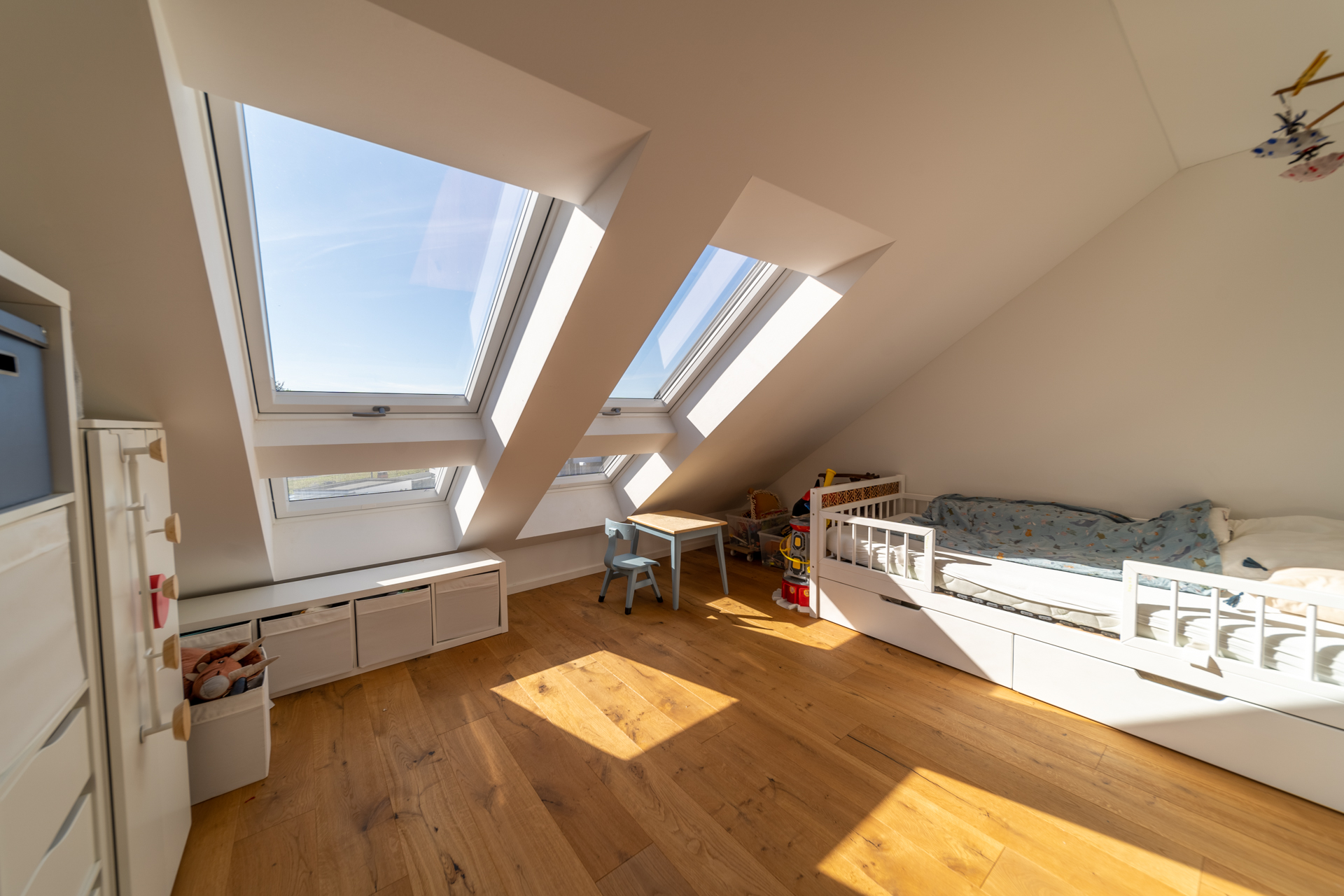 Im Dachgeschoss befinden sich drei weitere Zimmer sowie ein Bad mit ebenerdig gefliester Dusche und Anschlüssen für Waschmaschine und Trockner. Die Schlafzimmer verfügen über verlängerte Dachfenster, die auch hier viel Tageslicht in die Räume bringen. Der offene Flurbereich bietet zusätzlichen Platz für individuelle Nutzung – aktuell als Sportfläche gestaltet. Auch im Dachgeschoss wurde Landhausdielenparkett in Eiche verlegt.