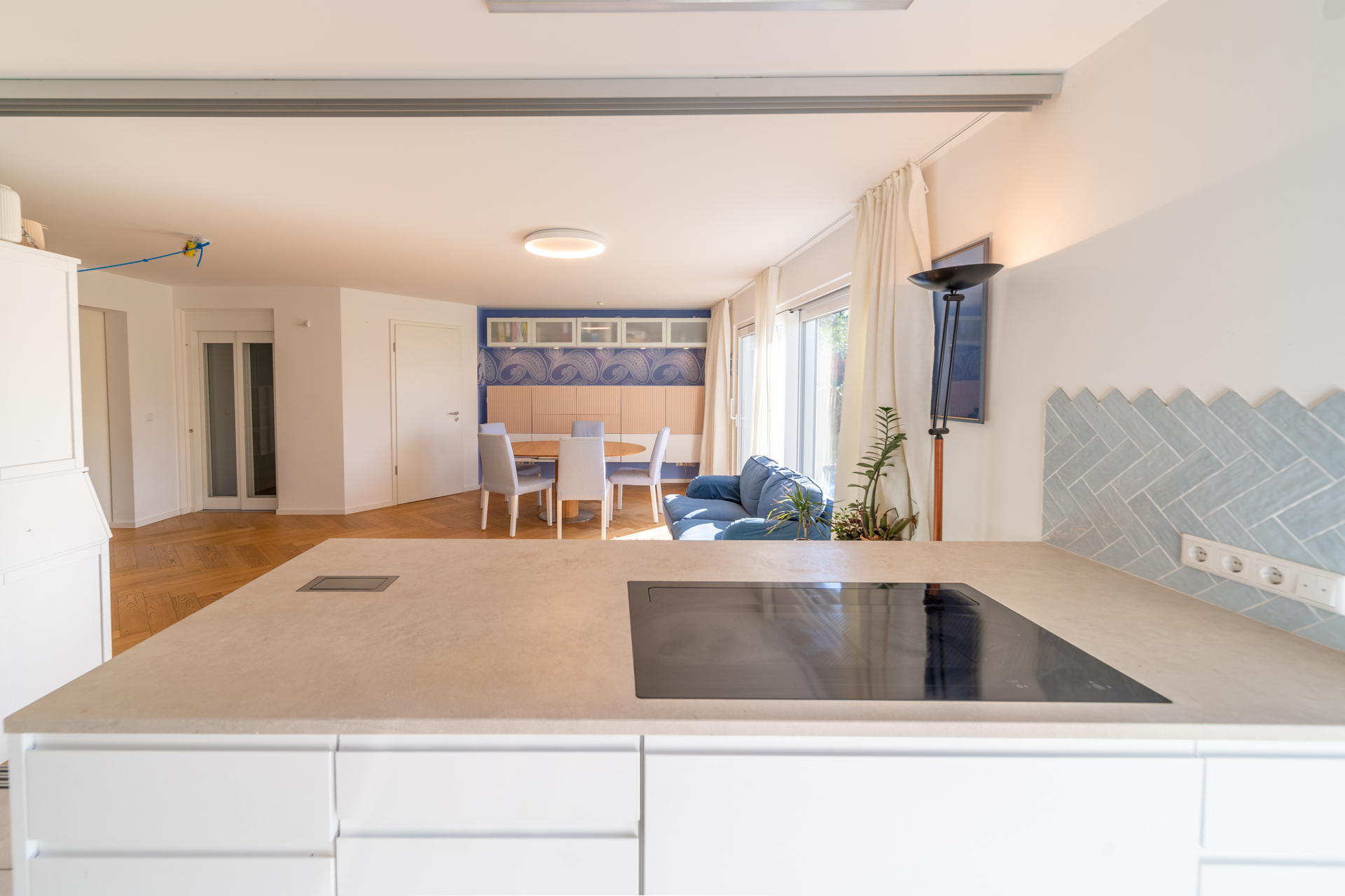 Auch technisch ist das Haus ideal für die Zukunft ausgestattet: Alle Räume verfügen über CAT-Netzwerkverkabelung, die im Haustechnikraum zusammenlaufen. Elektrische Rollläden sorgen für Komfort – sogar im Dachgeschoss -, im Erdgeschoss zur Gartenseite wurden Raffstores verbaut. Die Heizungsversorgung erfolgt über eine Erdwärmepumpe und liefert über die Fußbodenheizung im Winter angenehme Wärme und sorgt im Sommer für kühlere Temperaturen. Die Wärmedämmfenster sind 3-fach verglast und das Haus verfügt über eine dezentrale Lüftungsanlage der Firma Airfox. Der Endenergiebedarf liegt bei A+. Eine Photovoltaikanlage auf beiden Dachseiten erzielte im Jahr 2024 einen Ertrag von rund 11.000 kWh – genug, um Wärmepumpen- und Haushaltsstrom abzudecken und zusätzlich eine Einspeisevergütung zu erzielen (verbrauchsabhängig).