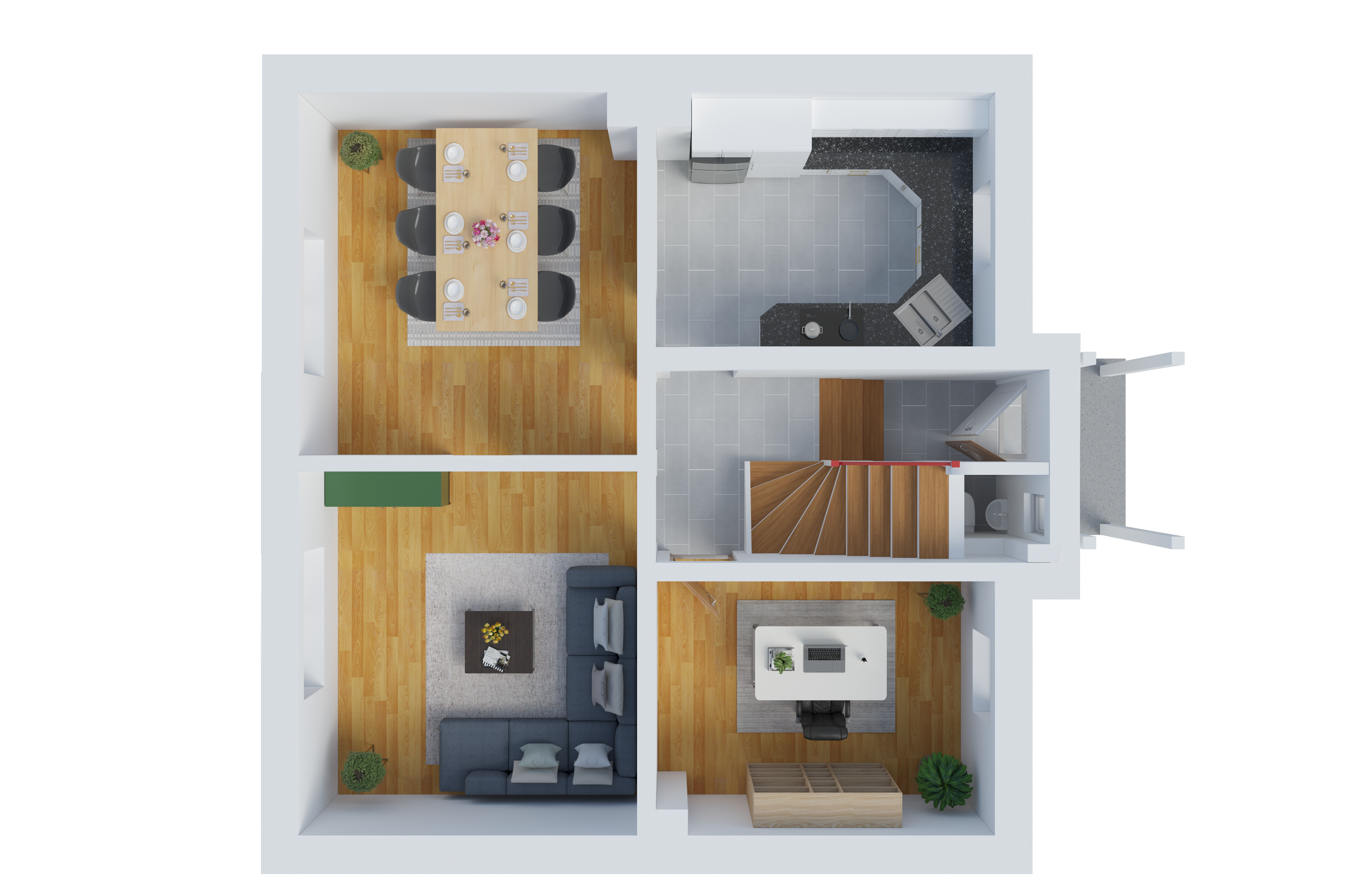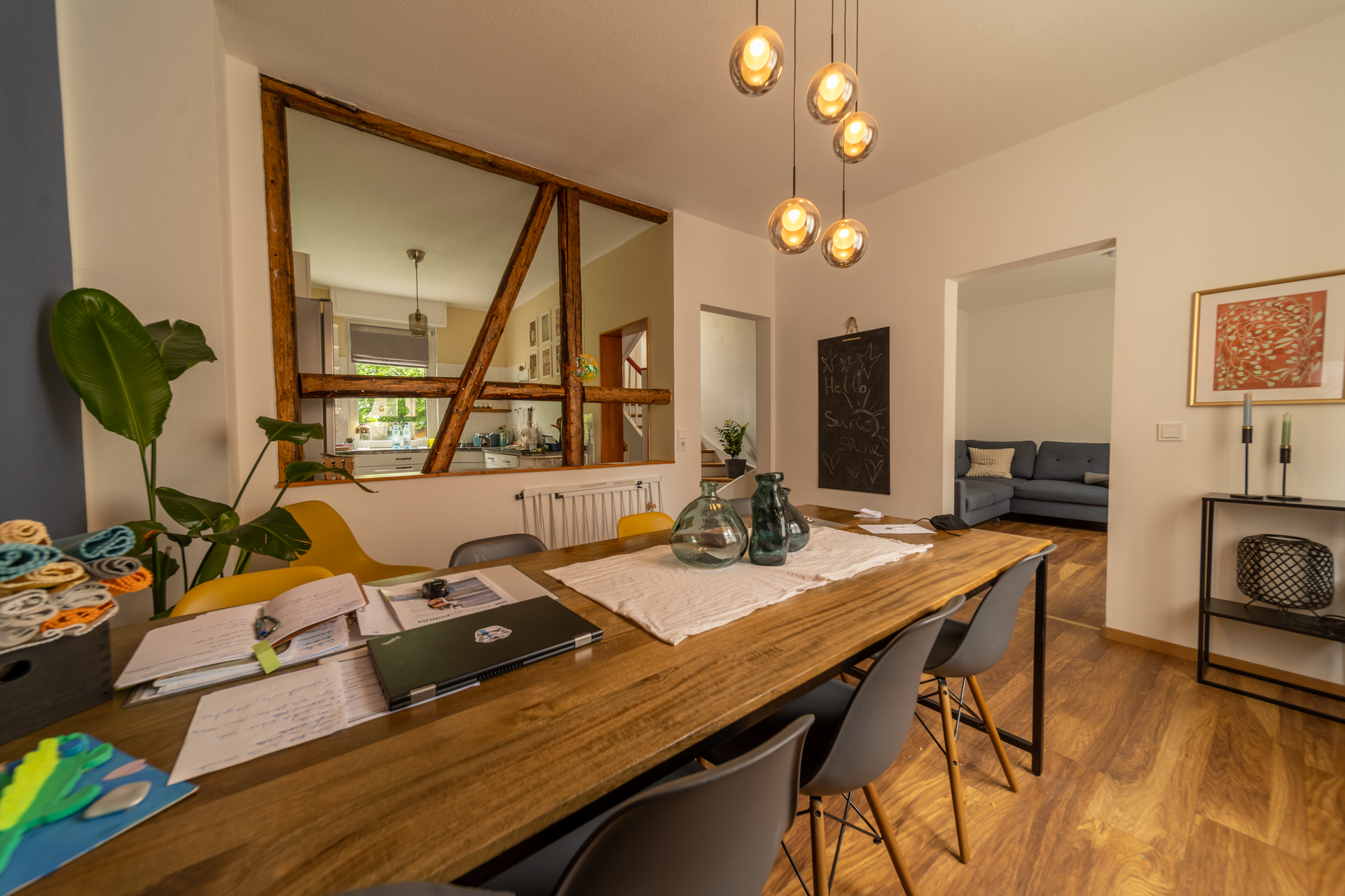 Das Erdgeschoss überzeugt durch eine gelungene Raumaufteilung. Das Wohnzimmer bietet einen direkten Zugang zum angrenzenden Esszimmer. Die Küche ist durch einen mit Holzbalken gestalteten Raumtrenner optisch vom Essbereich getrennt und schafft so eine offene, aber dennoch klar strukturierte Wohnatmosphäre. Die moderne Einbauküche ist im Kaufpreis enthalten. Ein Gäste-WC sowie ein separates Arbeitszimmer runden das Raumangebot im Erdgeschoss ab.