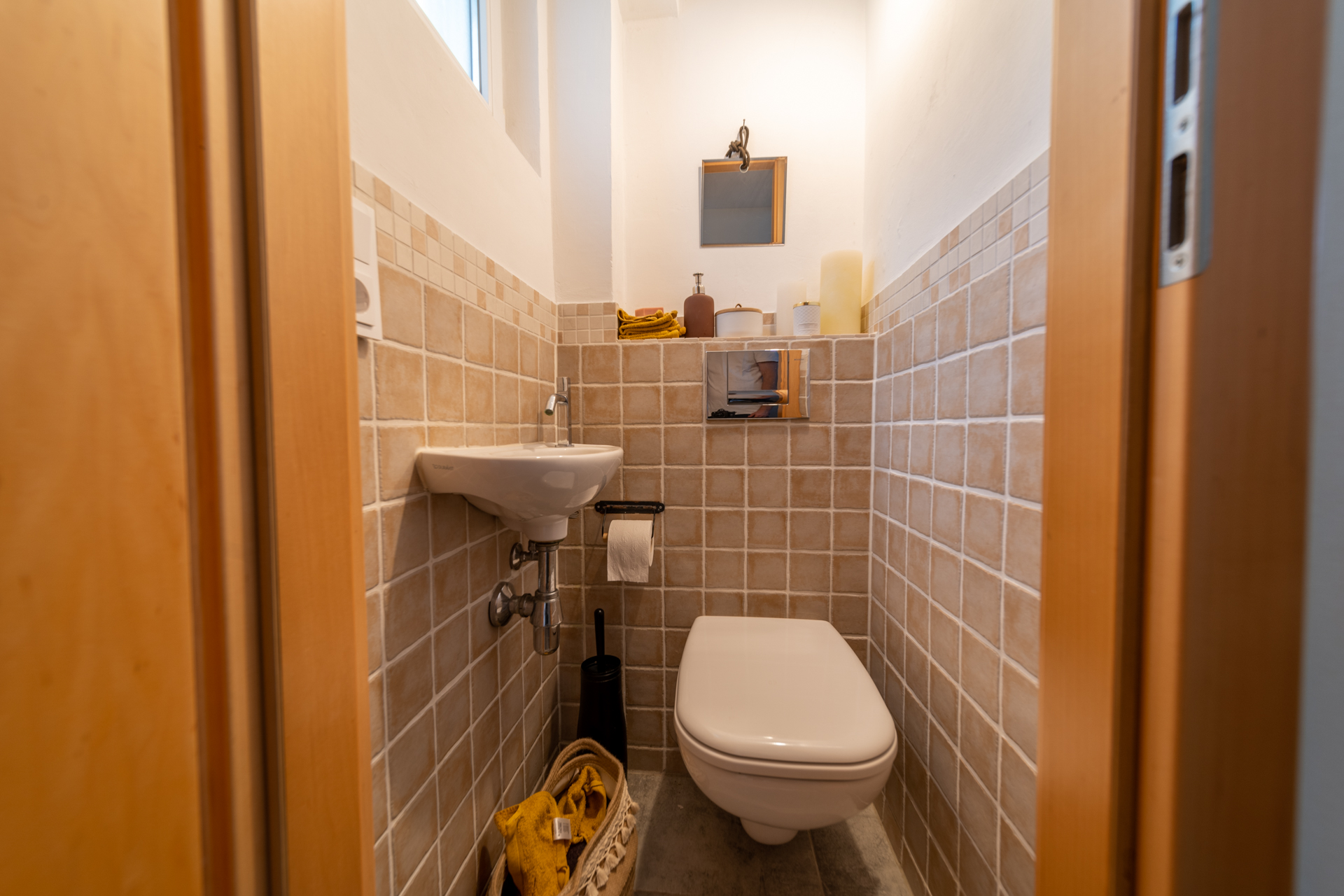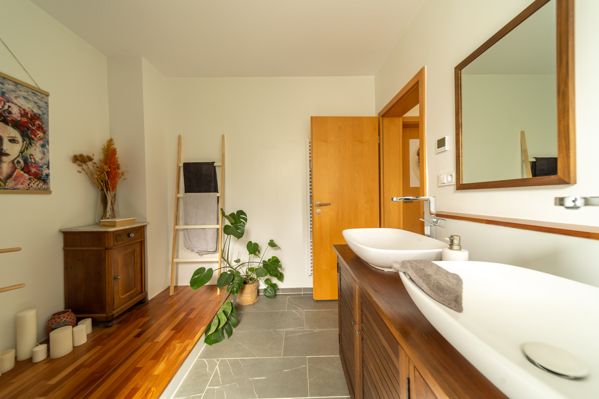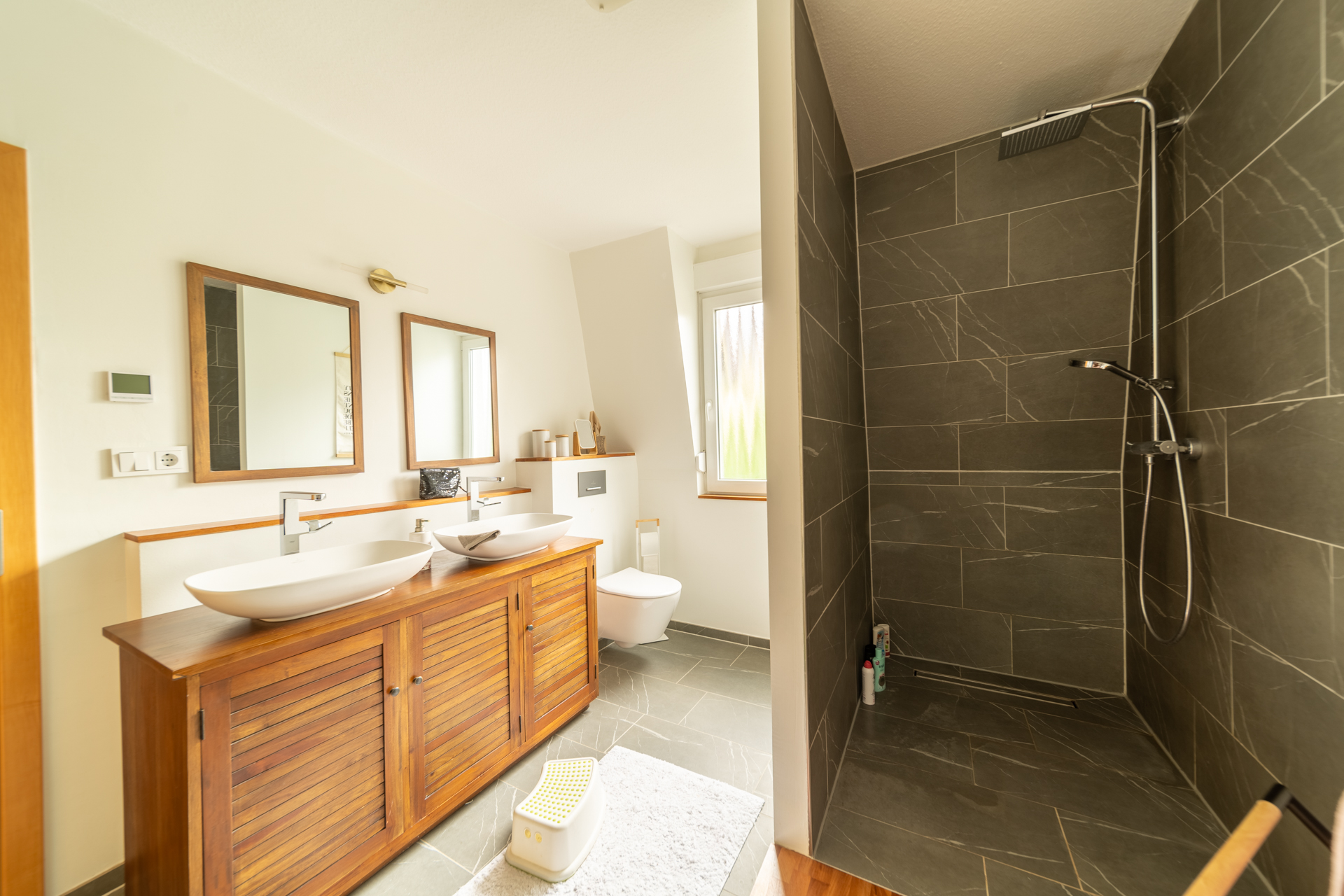 Über eine offene Treppe gelangt man in das Obergeschoss. Dort befinden sich zwei helle Schlaf- oder Kinderzimmer, eine praktische Ankleide sowie ein Badezimmer, das 2022 neu errichtet wurde. Das Tageslichtbad bietet eine großzügige, bodengleiche Dusche, zwei Waschbecken sowie eine angenehme Fußbodenheizung.