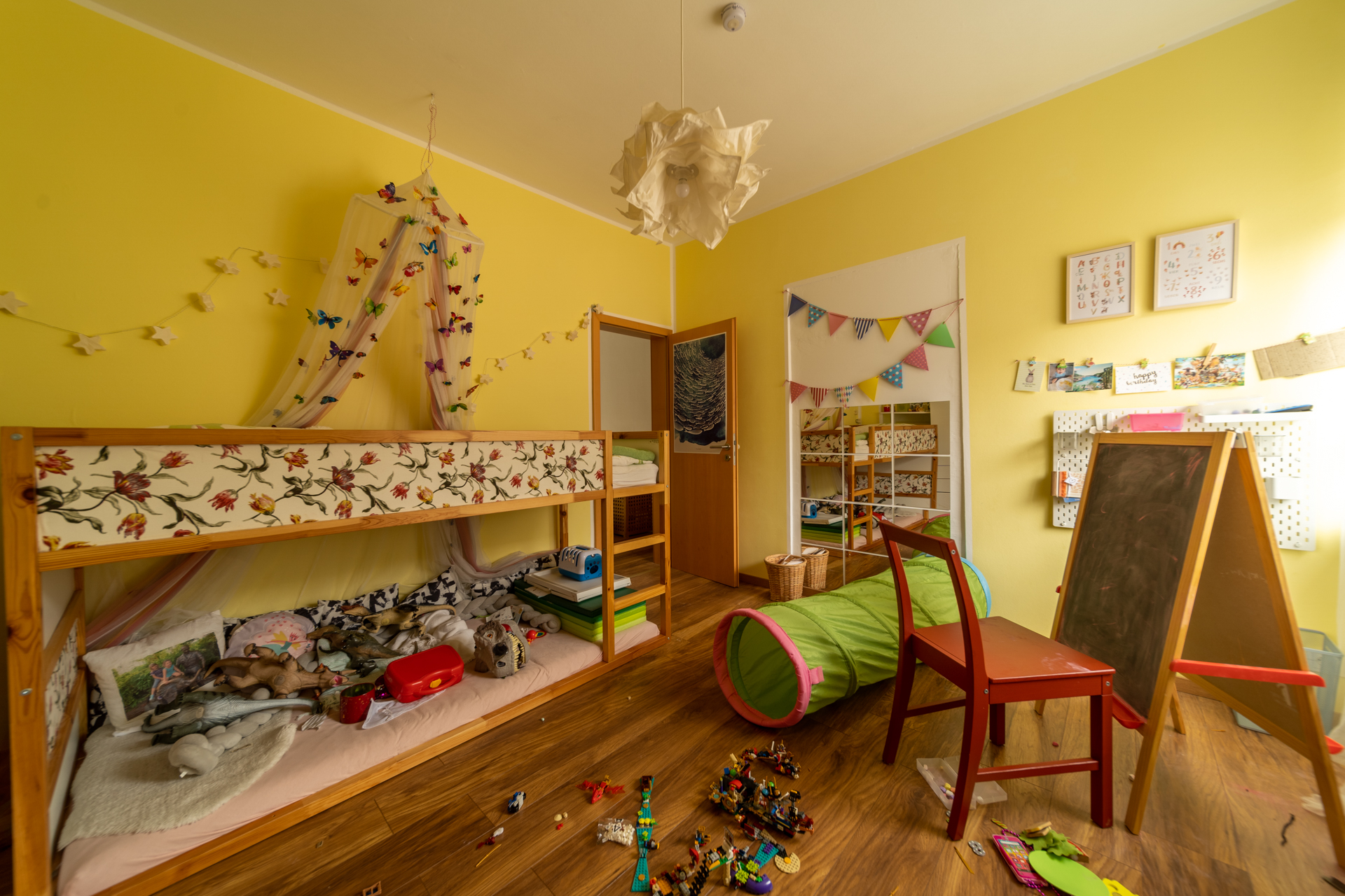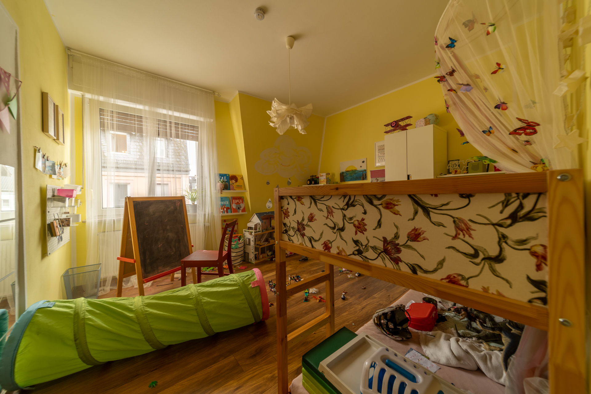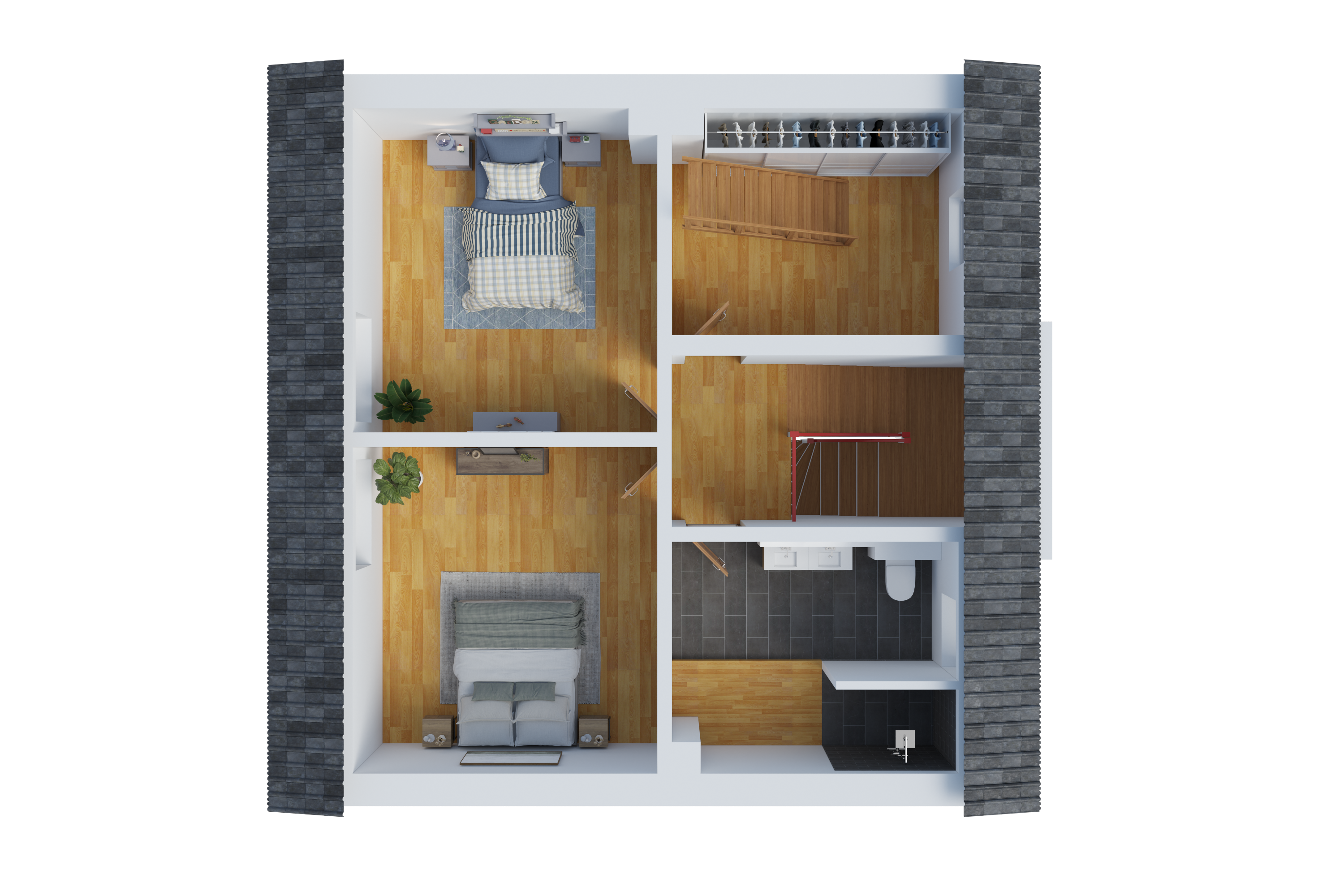 Über eine offene Treppe gelangt man in das Obergeschoss. Dort befinden sich zwei helle Schlaf- oder Kinderzimmer, eine praktische Ankleide sowie ein Badezimmer, das 2022 neu errichtet wurde. Das Tageslichtbad bietet eine großzügige, bodengleiche Dusche, zwei Waschbecken sowie eine angenehme Fußbodenheizung.