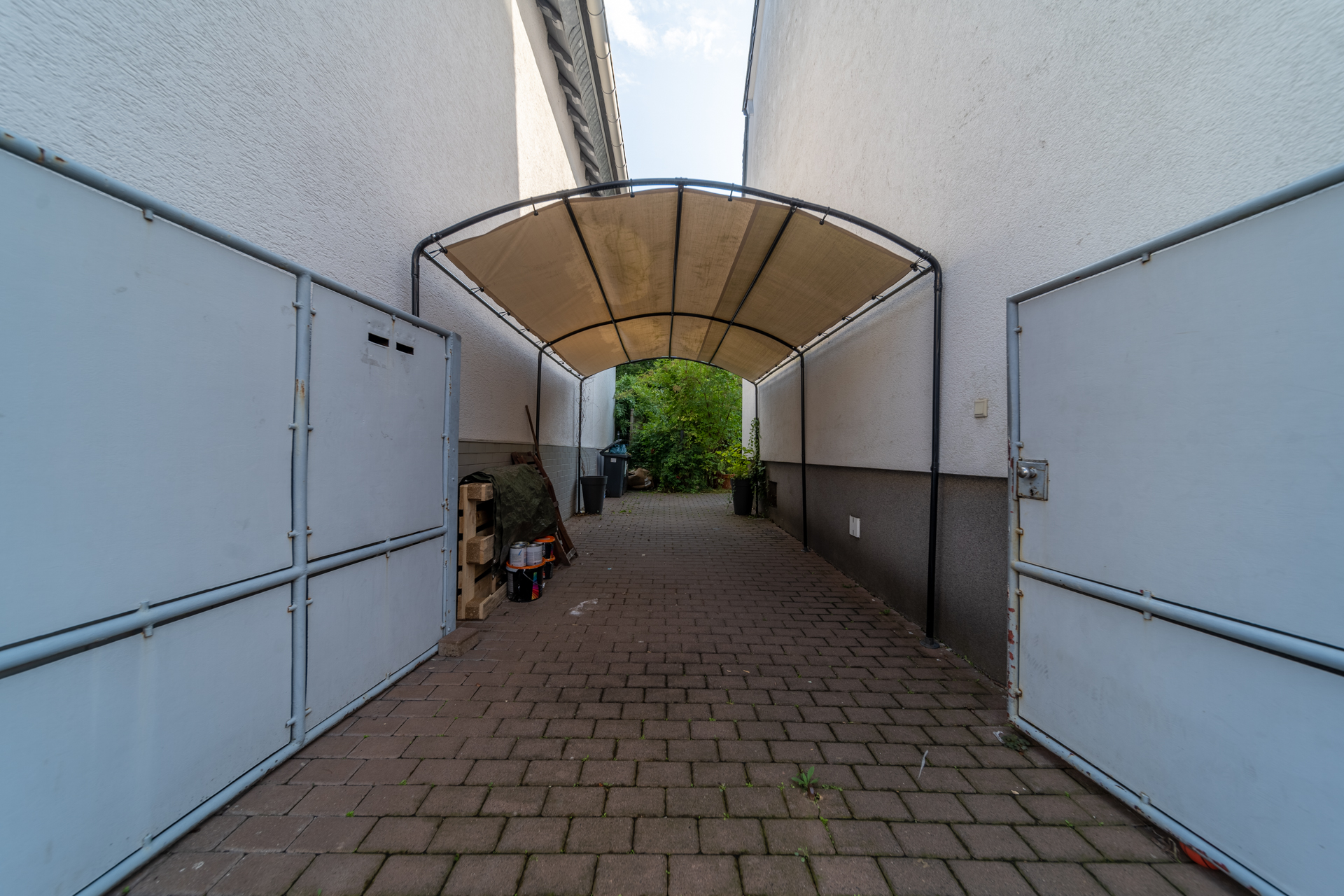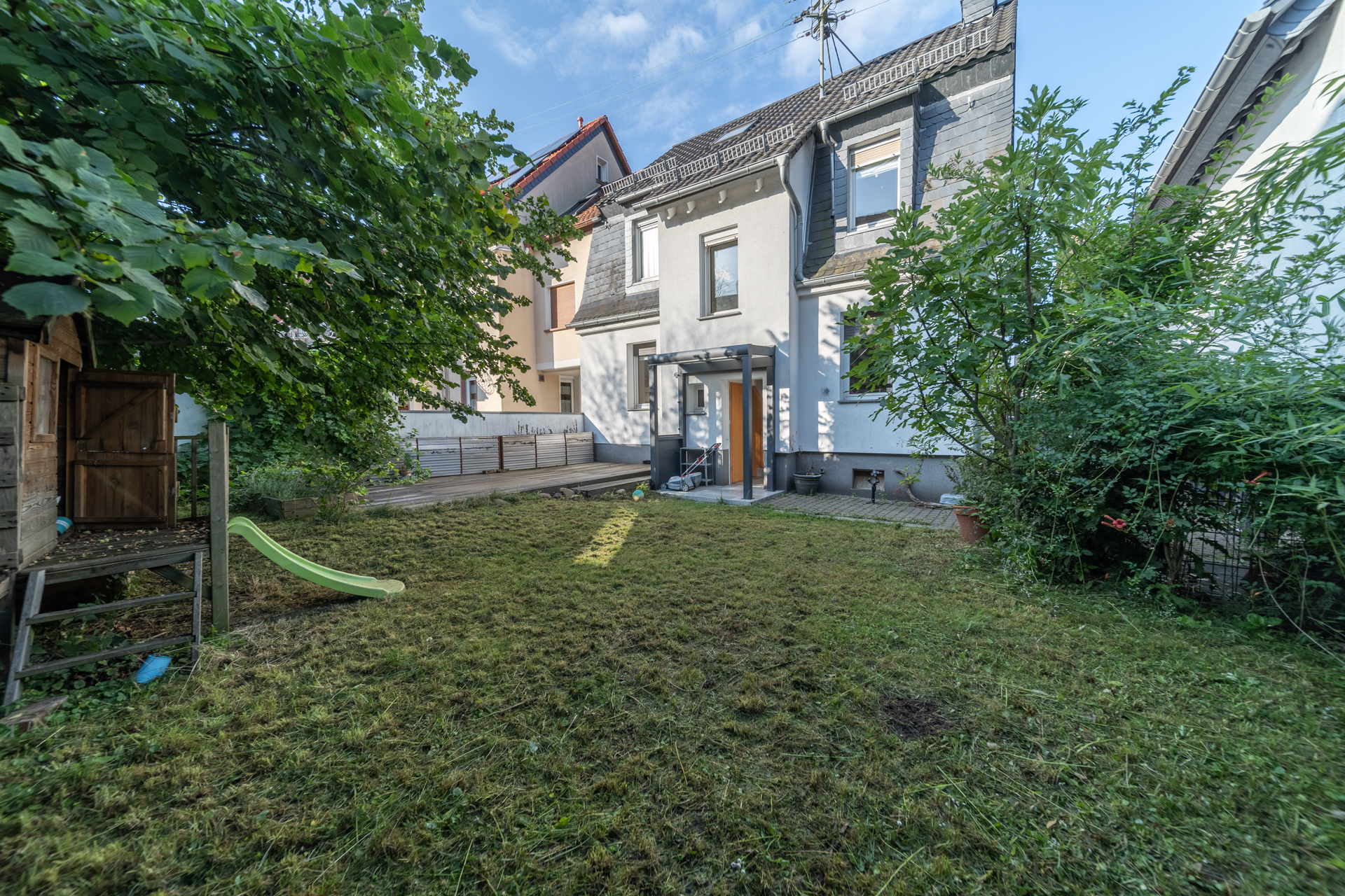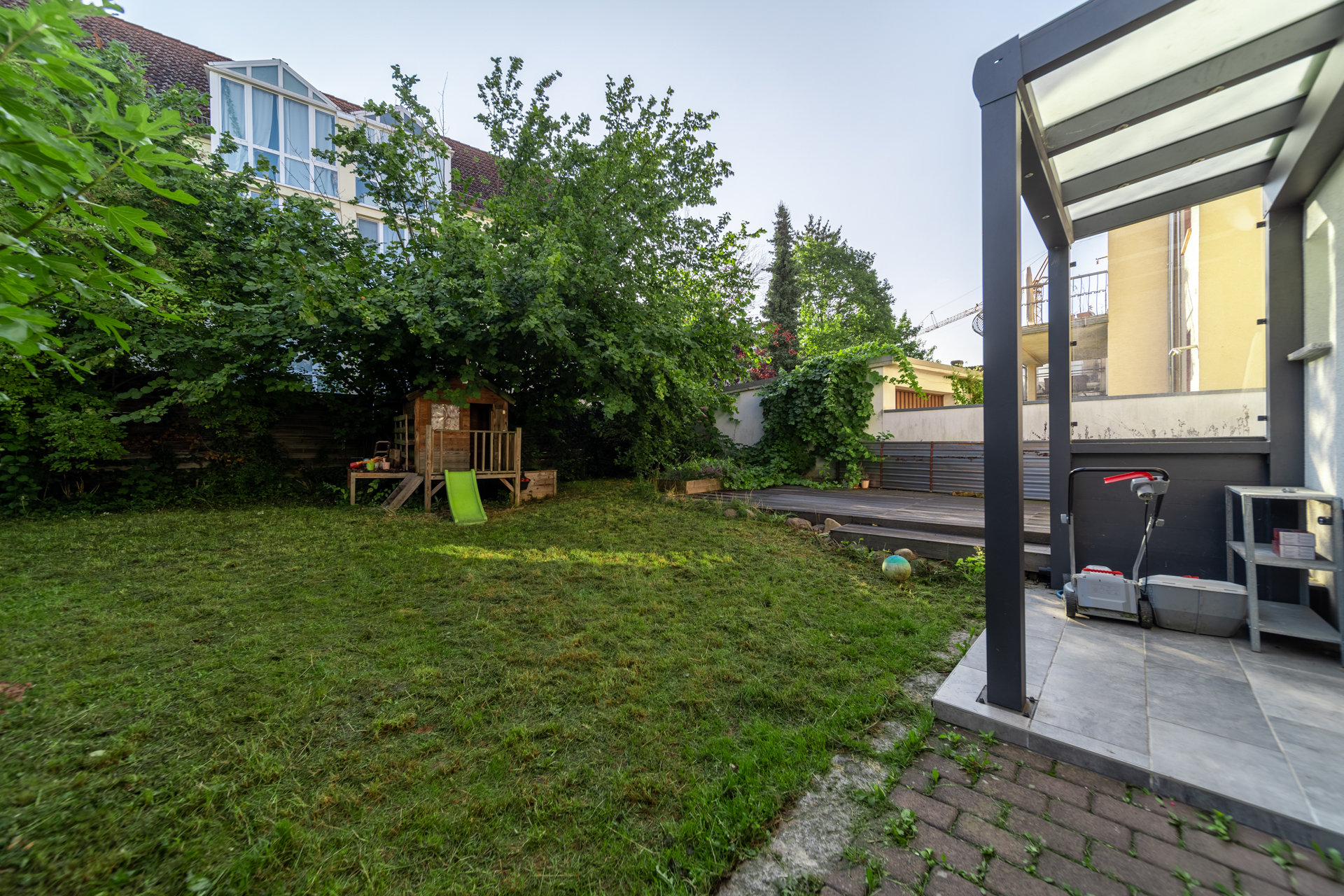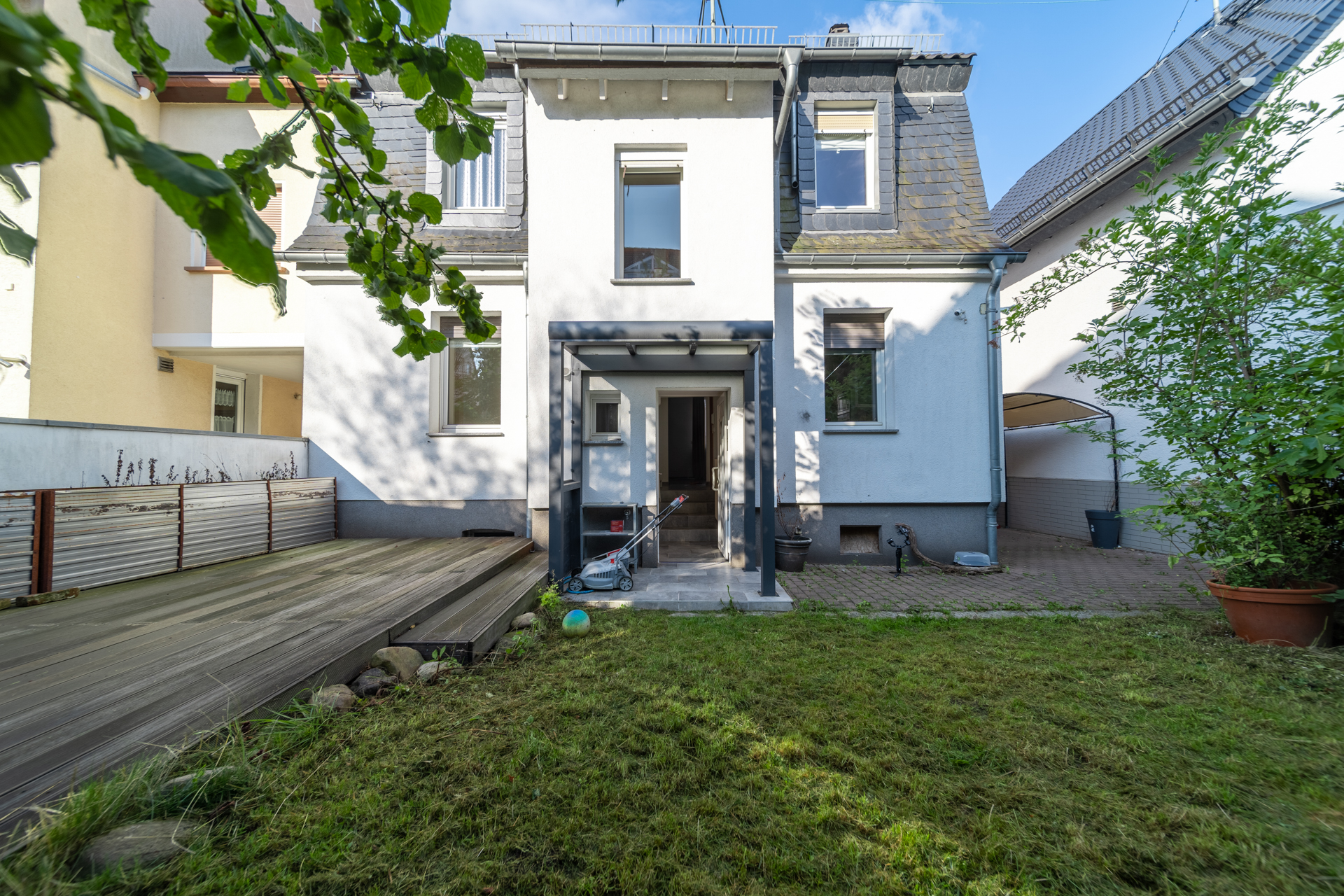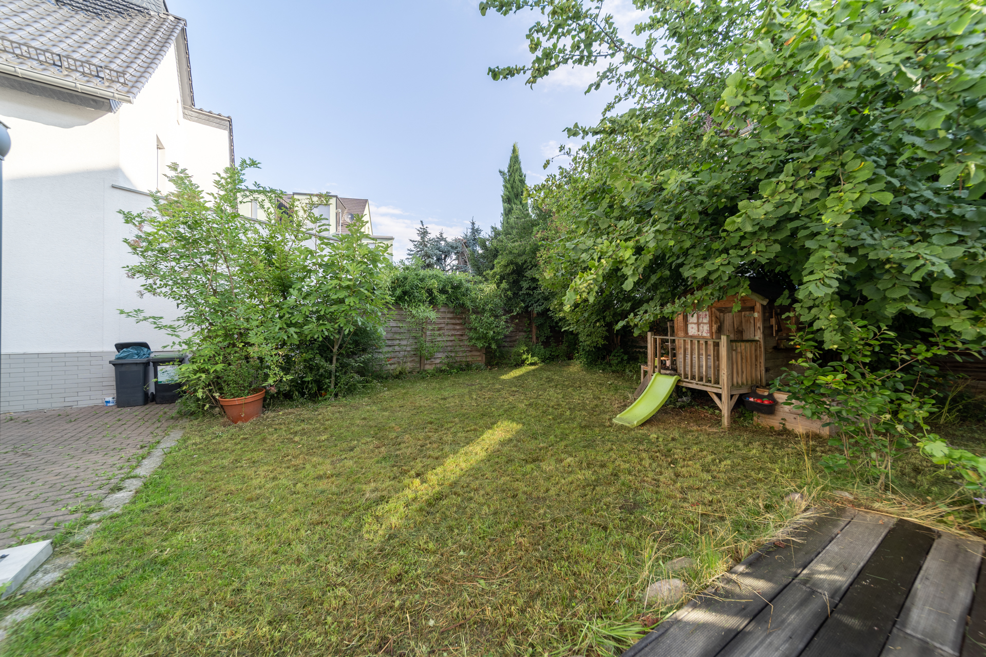 Der Garten auf der Rückseite des Hauses lädt mit einem Terrassenbereich zum Verweilen im Freien ein. Im gepflasterten Hof können Fahrräder bequem abgestellt werden.