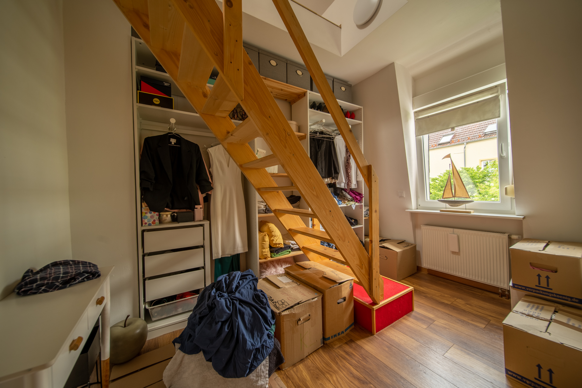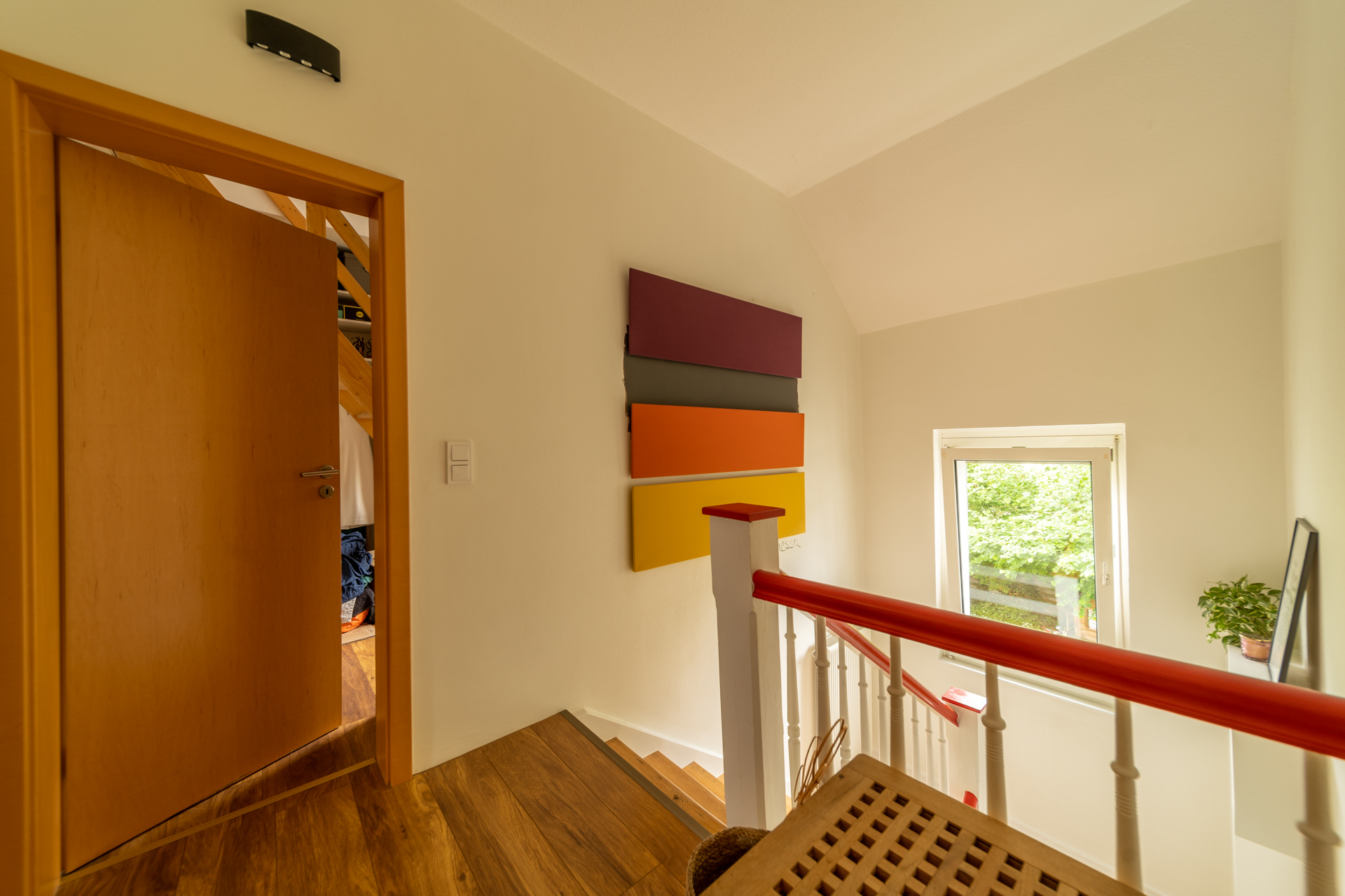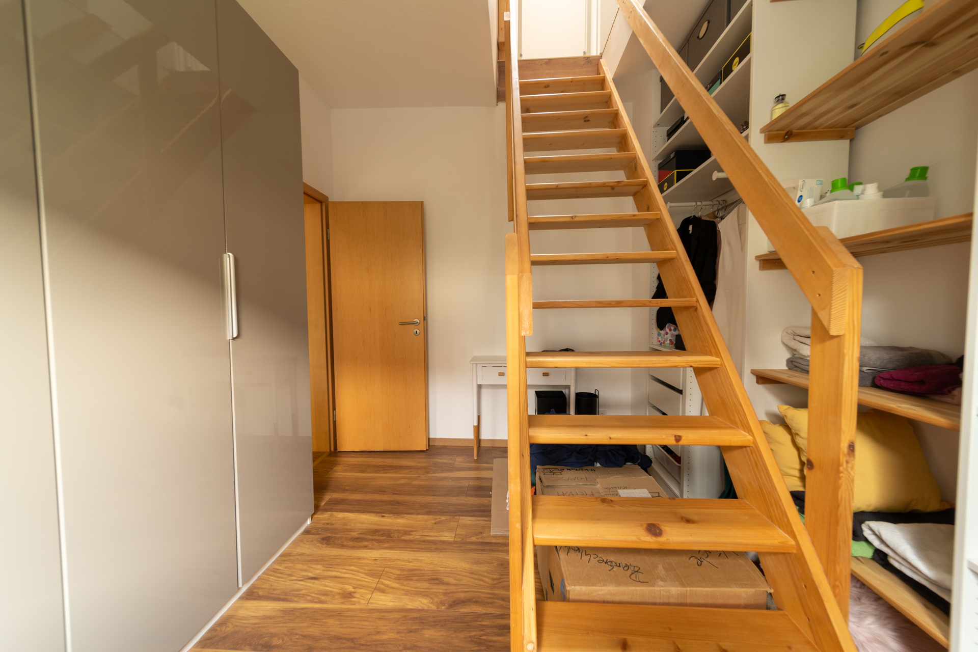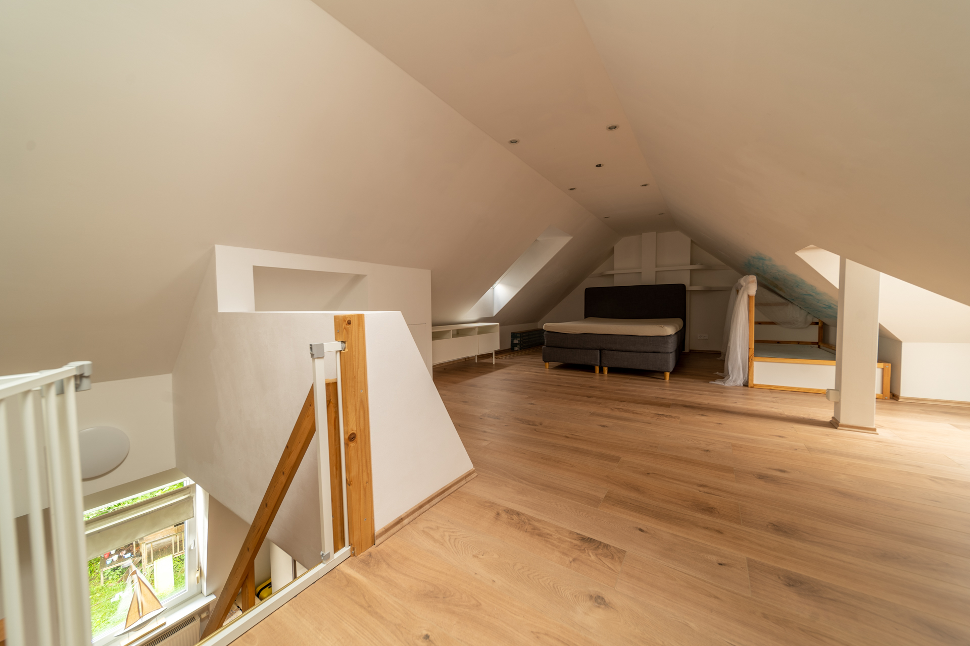Von der Ankleide führt eine Holztreppe ins ausgebaute Dachgeschoss, das zuletzt als Elternschlafzimmer genutzt wurde und zusätzlichen Wohnraum bietet.