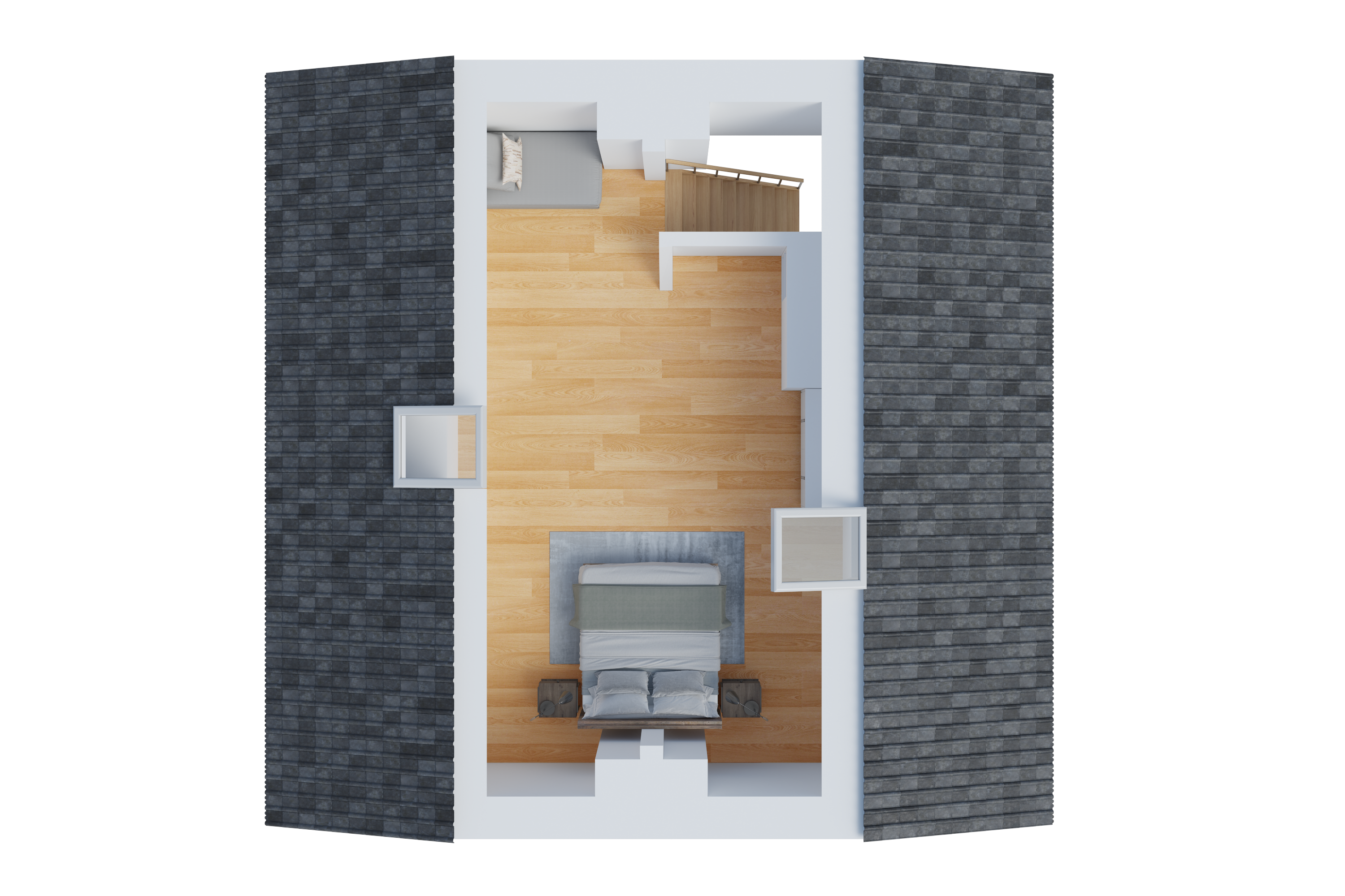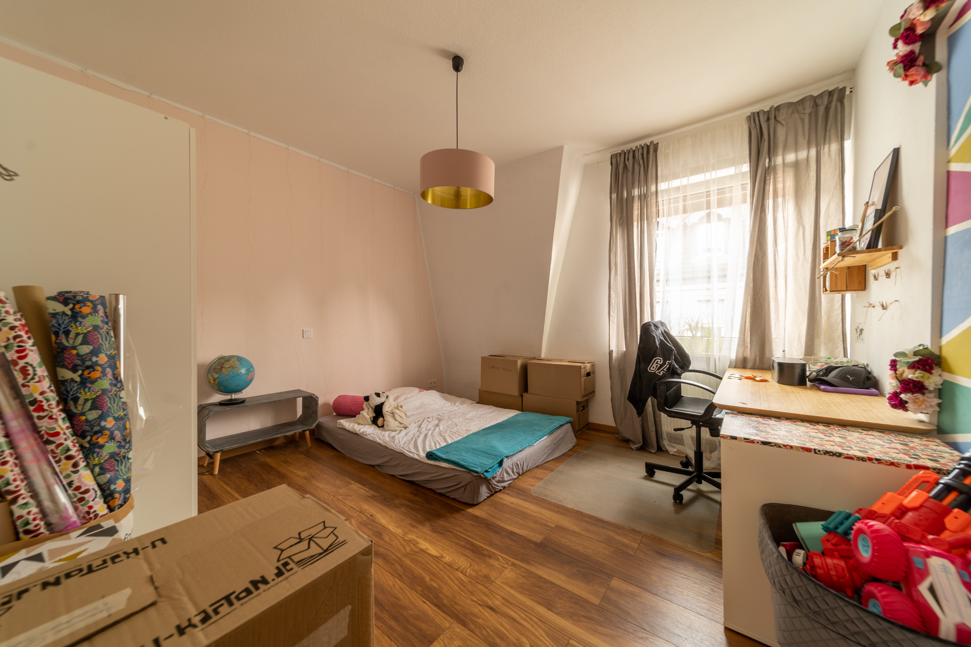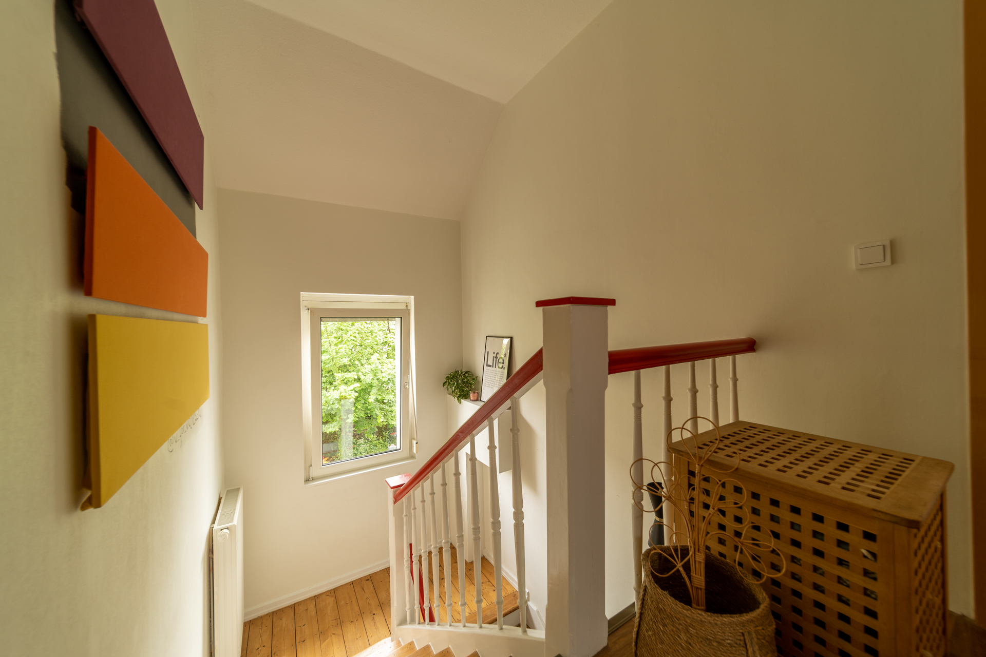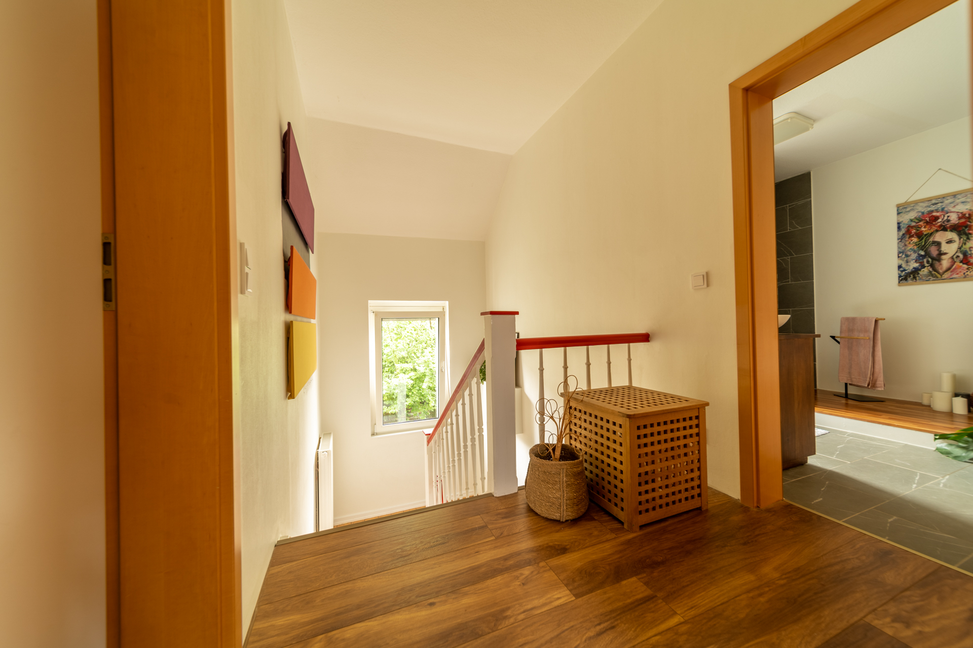 Von der Ankleide führt eine Holztreppe ins ausgebaute Dachgeschoss, das zuletzt als Elternschlafzimmer genutzt wurde und zusätzlichen Wohnraum bietet.