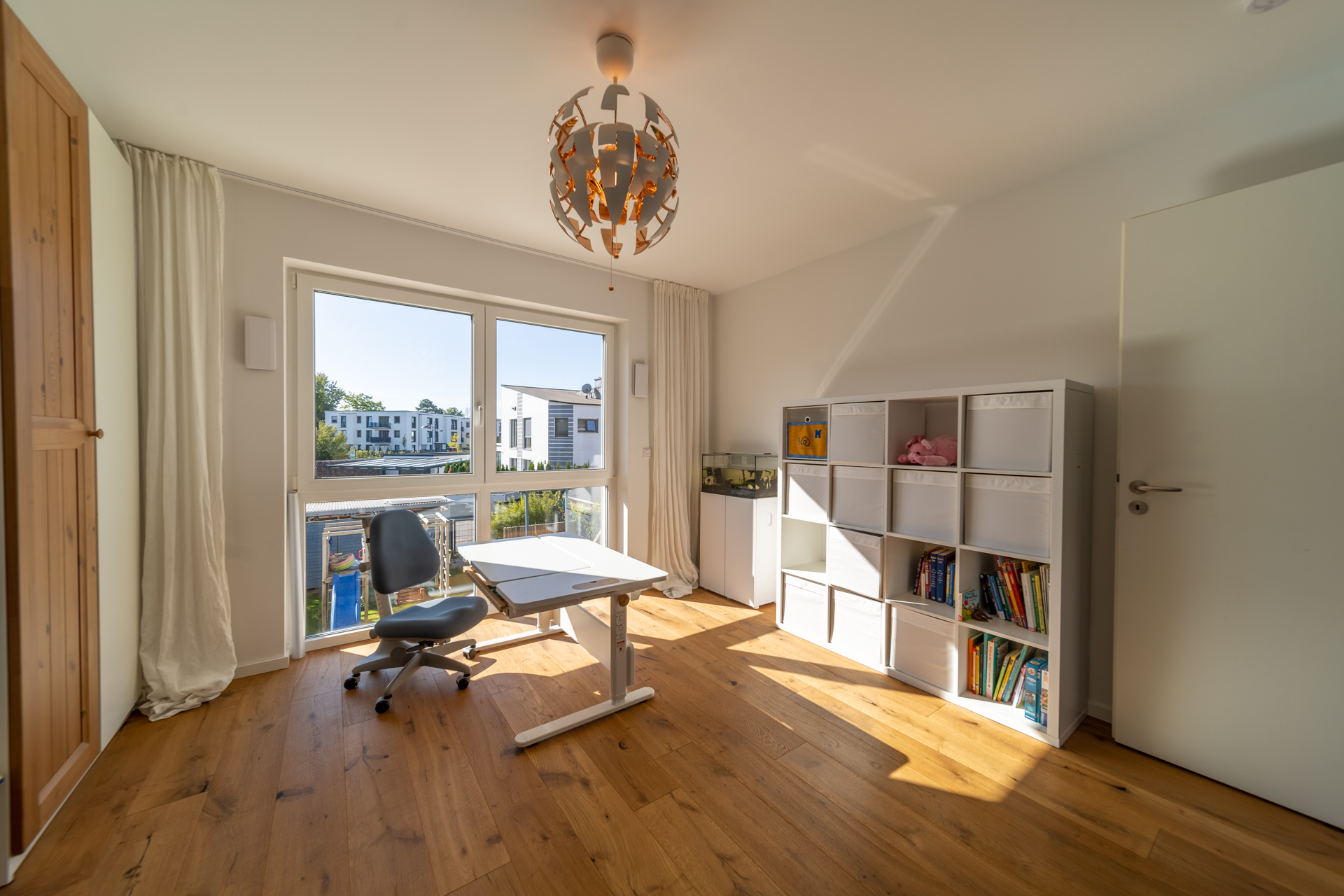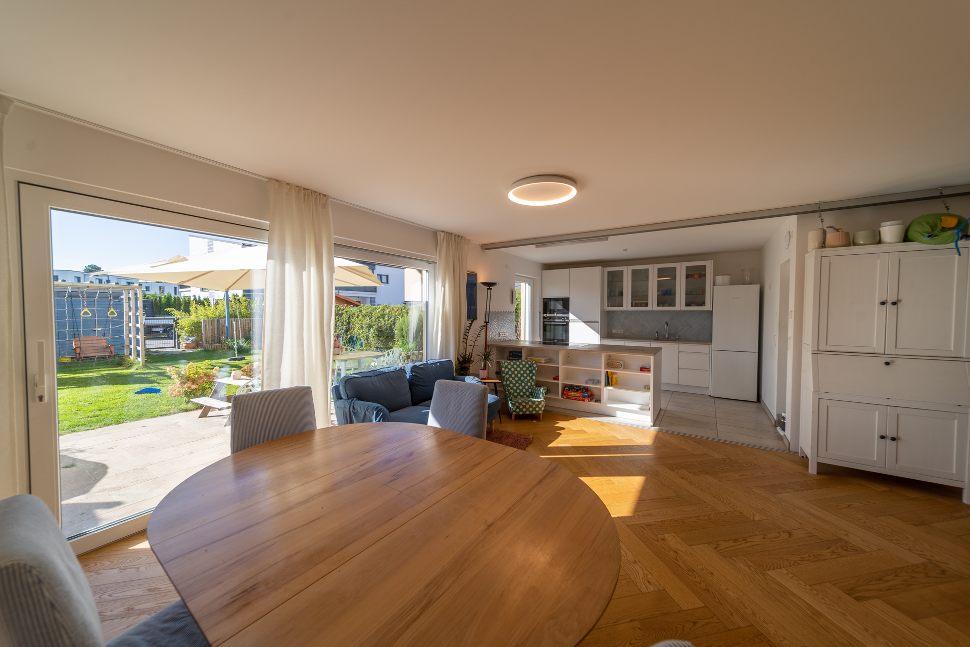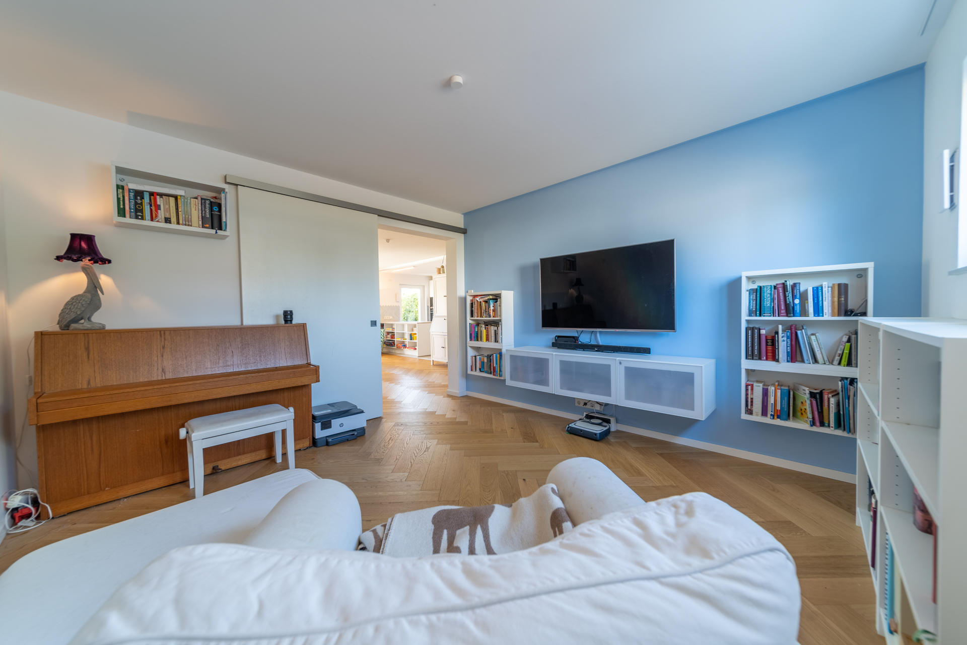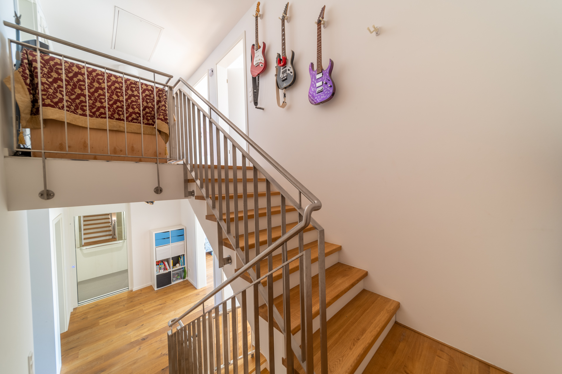 Auch technisch ist das Haus ideal für die Zukunft ausgestattet: Alle Räume verfügen über CAT-Netzwerkverkabelung, die im Haustechnikraum zusammenlaufen. Elektrische Rollläden sorgen für Komfort – sogar im Dachgeschoss -, im Erdgeschoss zur Gartenseite wurden Raffstores verbaut. Die Heizungsversorgung erfolgt über eine Erdwärmepumpe und liefert über die Fußbodenheizung im Winter angenehme Wärme und sorgt im Sommer für kühlere Temperaturen. Die Wärmedämmfenster sind 3-fach verglast und das Haus verfügt über eine dezentrale Lüftungsanlage der Firma Airfox. Der Endenergiebedarf liegt bei A+. Eine Photovoltaikanlage auf beiden Dachseiten erzielte im Jahr 2024 einen Ertrag von rund 11.000 kWh – genug, um Wärmepumpen- und Haushaltsstrom abzudecken und zusätzlich eine Einspeisevergütung zu erzielen (verbrauchsabhängig).