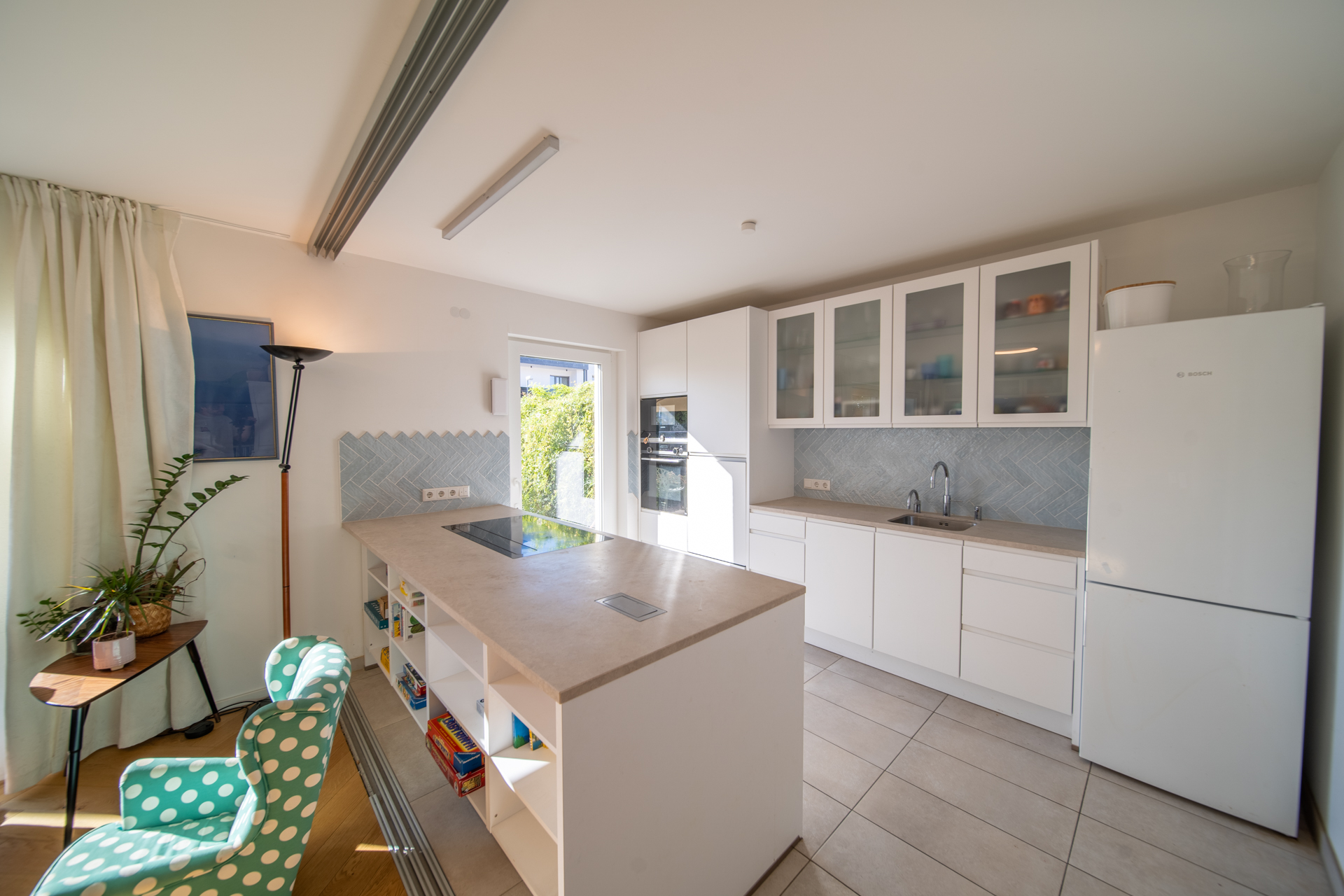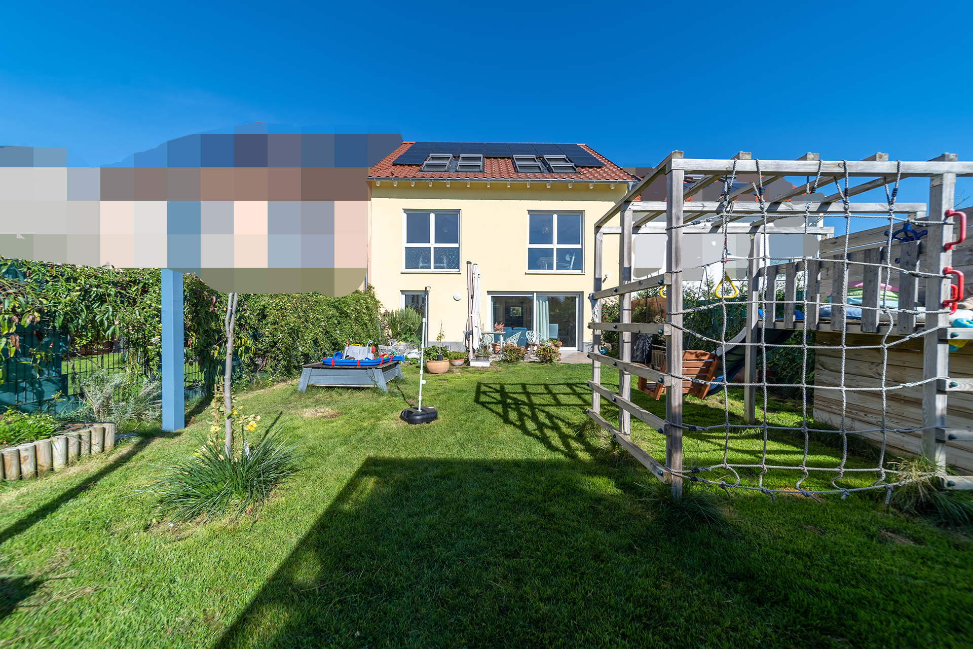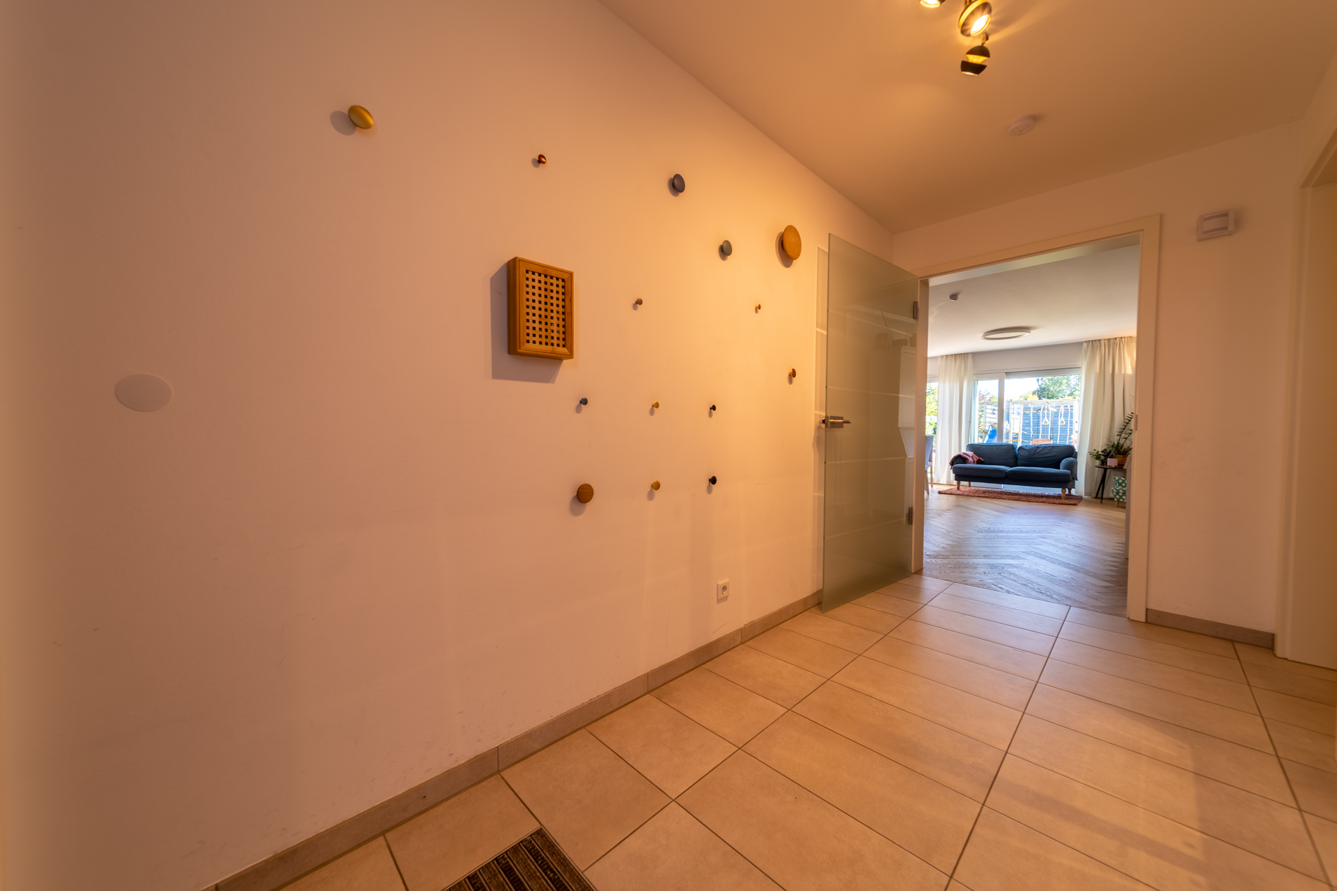 Auch technisch ist das Haus ideal für die Zukunft ausgestattet: Alle Räume verfügen über CAT-Netzwerkverkabelung, die im Haustechnikraum zusammenlaufen. Elektrische Rollläden sorgen für Komfort – sogar im Dachgeschoss -, im Erdgeschoss zur Gartenseite wurden Raffstores verbaut. Die Heizungsversorgung erfolgt über eine Erdwärmepumpe und liefert über die Fußbodenheizung im Winter angenehme Wärme und sorgt im Sommer für kühlere Temperaturen. Die Wärmedämmfenster sind 3-fach verglast und das Haus verfügt über eine dezentrale Lüftungsanlage der Firma Airfox. Der Endenergiebedarf liegt bei A+. Eine Photovoltaikanlage auf beiden Dachseiten erzielte im Jahr 2024 einen Ertrag von rund 11.000 kWh – genug, um Wärmepumpen- und Haushaltsstrom abzudecken und zusätzlich eine Einspeisevergütung zu erzielen (verbrauchsabhängig).