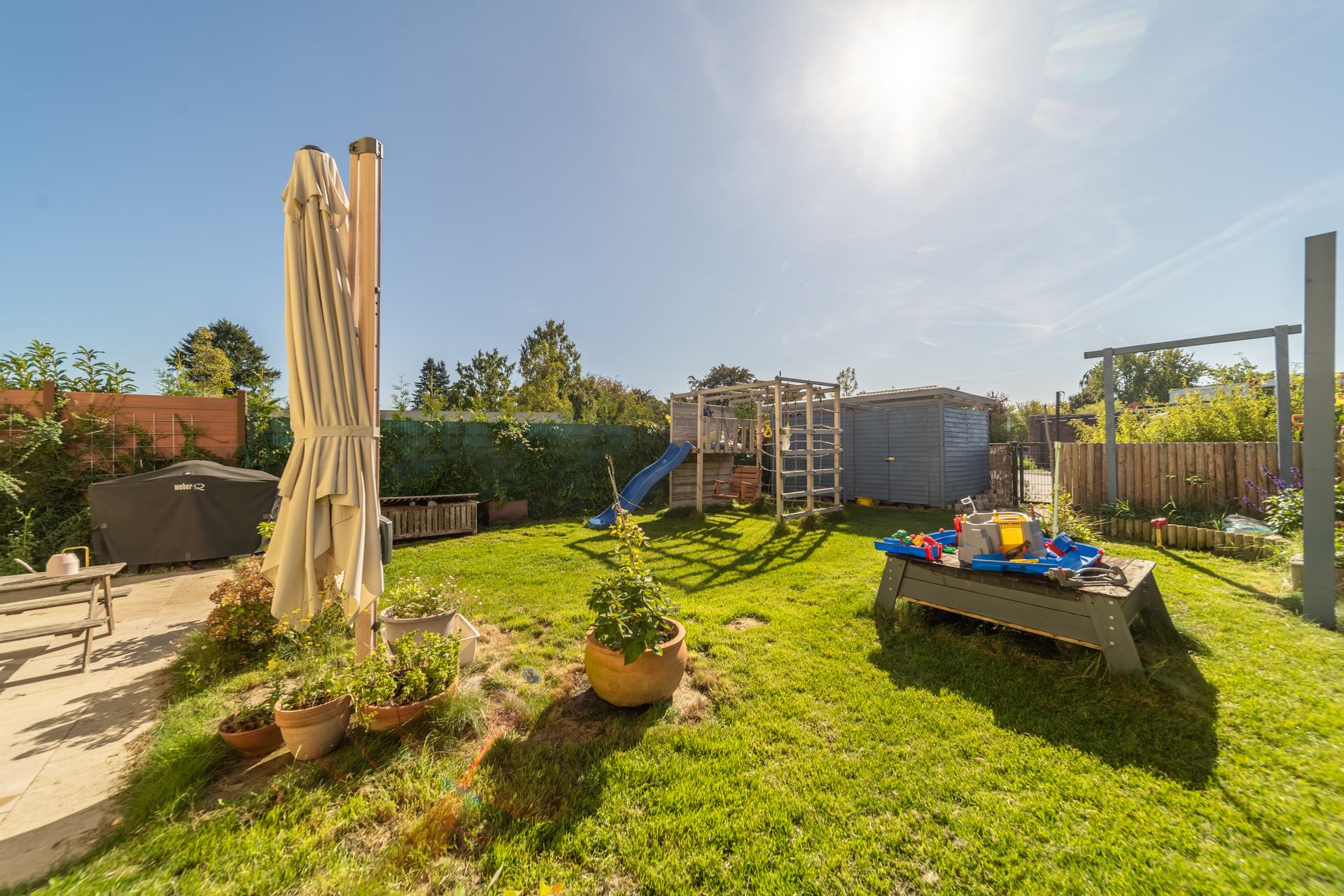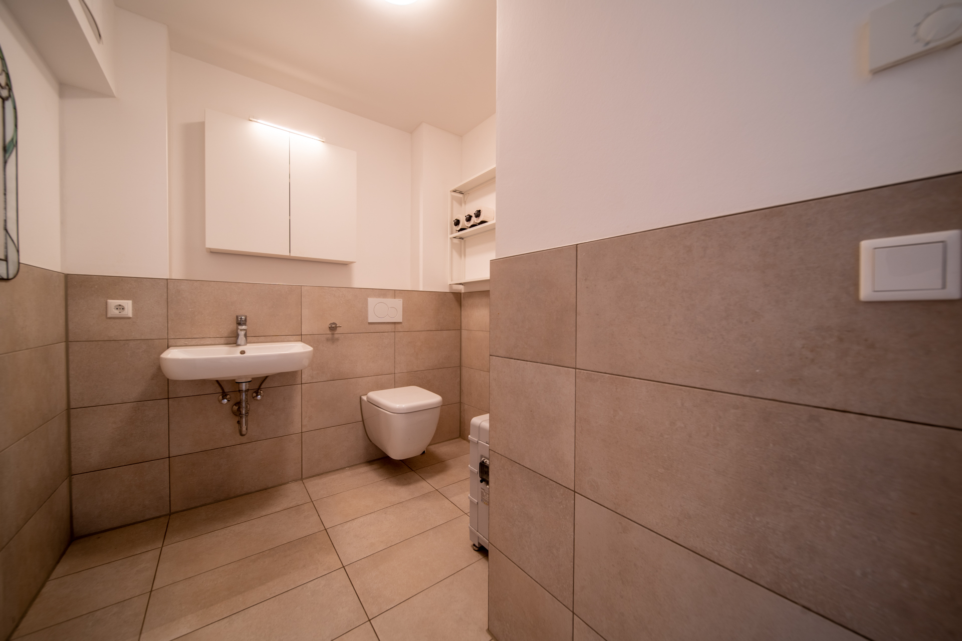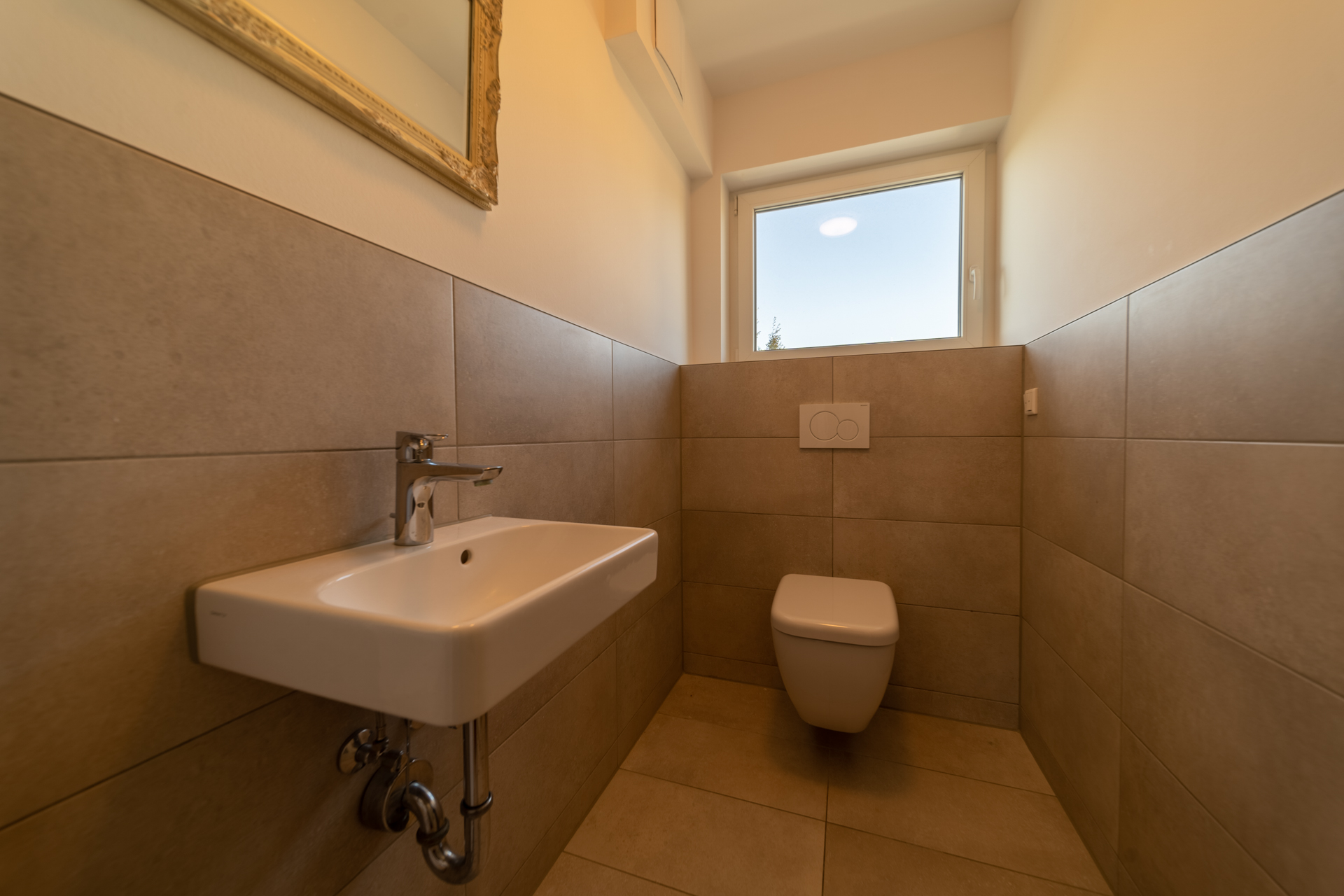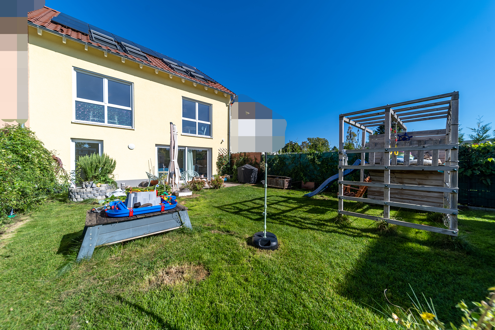 Auch technisch ist das Haus ideal für die Zukunft ausgestattet: Alle Räume verfügen über CAT-Netzwerkverkabelung, die im Haustechnikraum zusammenlaufen. Elektrische Rollläden sorgen für Komfort – sogar im Dachgeschoss -, im Erdgeschoss zur Gartenseite wurden Raffstores verbaut. Die Heizungsversorgung erfolgt über eine Erdwärmepumpe und liefert über die Fußbodenheizung im Winter angenehme Wärme und sorgt im Sommer für kühlere Temperaturen. Die Wärmedämmfenster sind 3-fach verglast und das Haus verfügt über eine dezentrale Lüftungsanlage der Firma Airfox. Der Endenergiebedarf liegt bei A+. Eine Photovoltaikanlage auf beiden Dachseiten erzielte im Jahr 2024 einen Ertrag von rund 11.000 kWh – genug, um Wärmepumpen- und Haushaltsstrom abzudecken und zusätzlich eine Einspeisevergütung zu erzielen (verbrauchsabhängig).