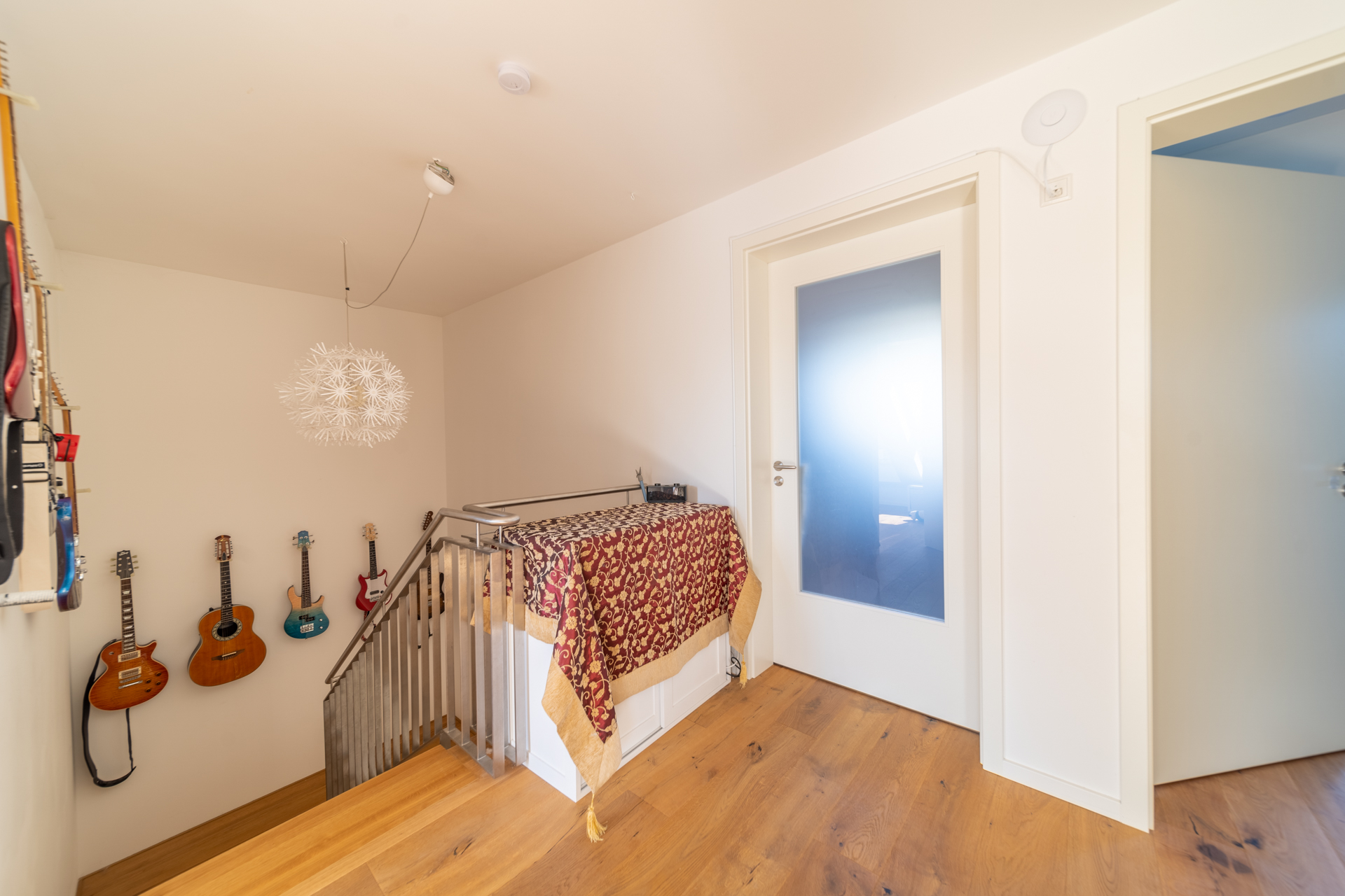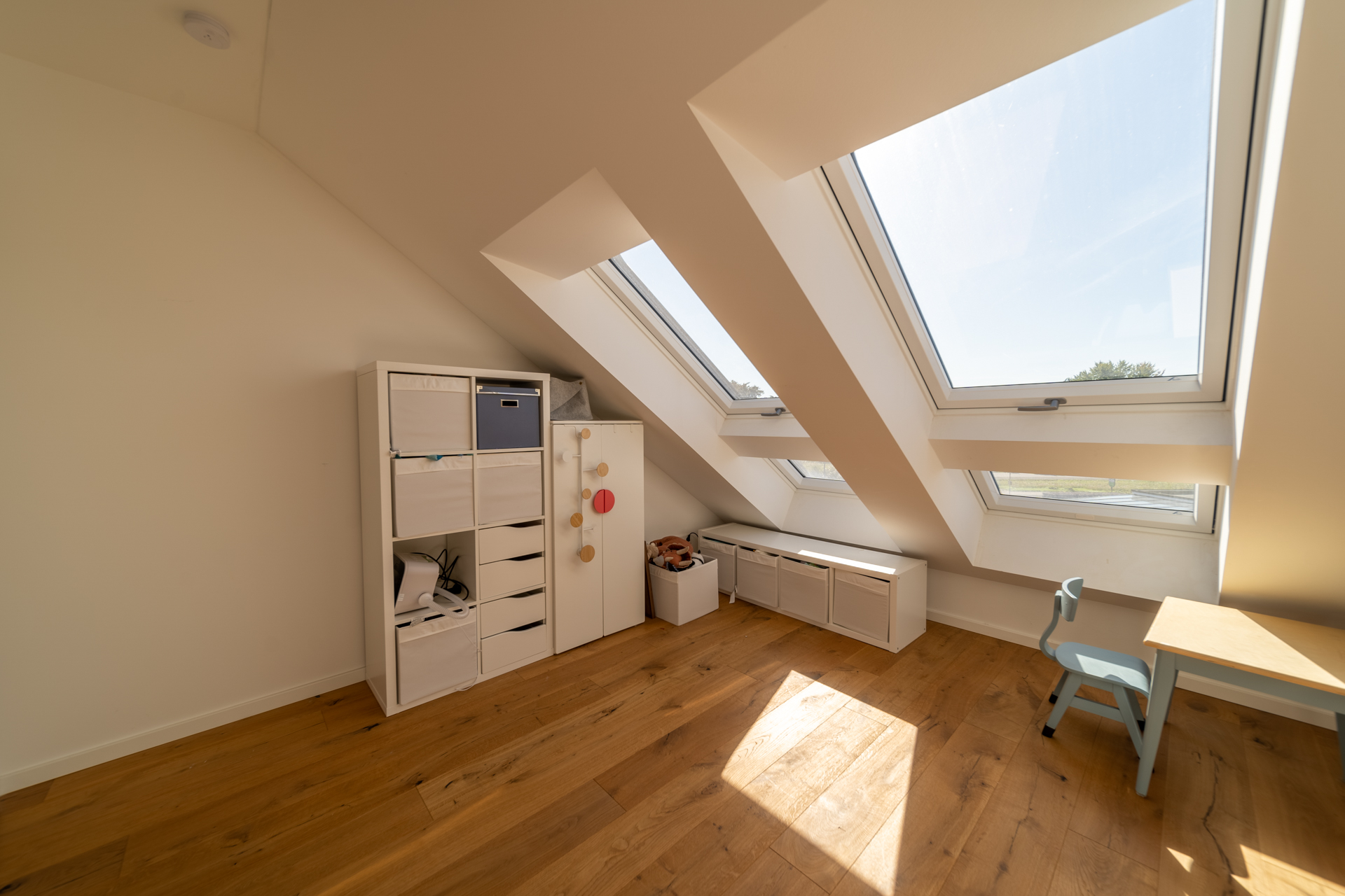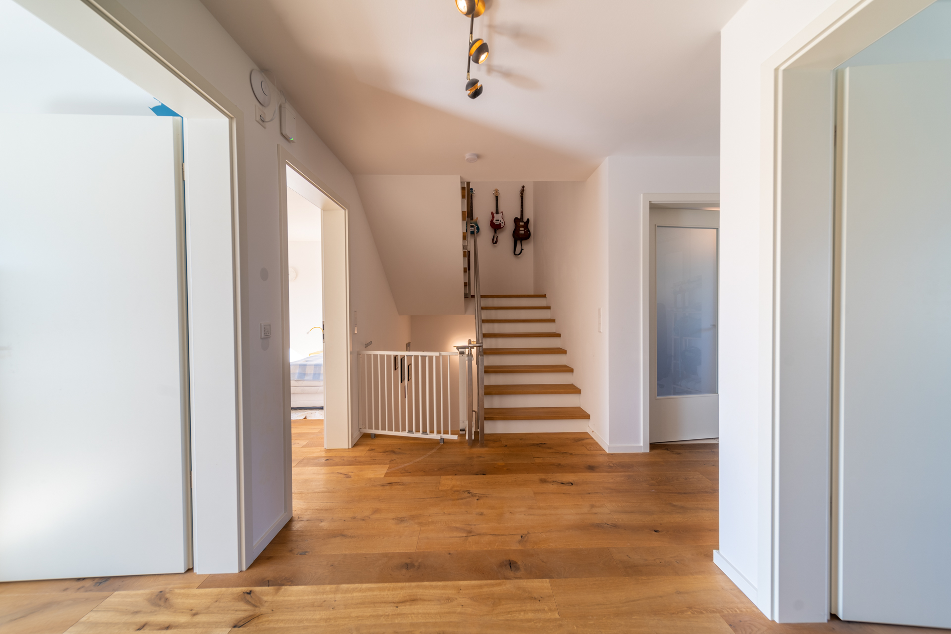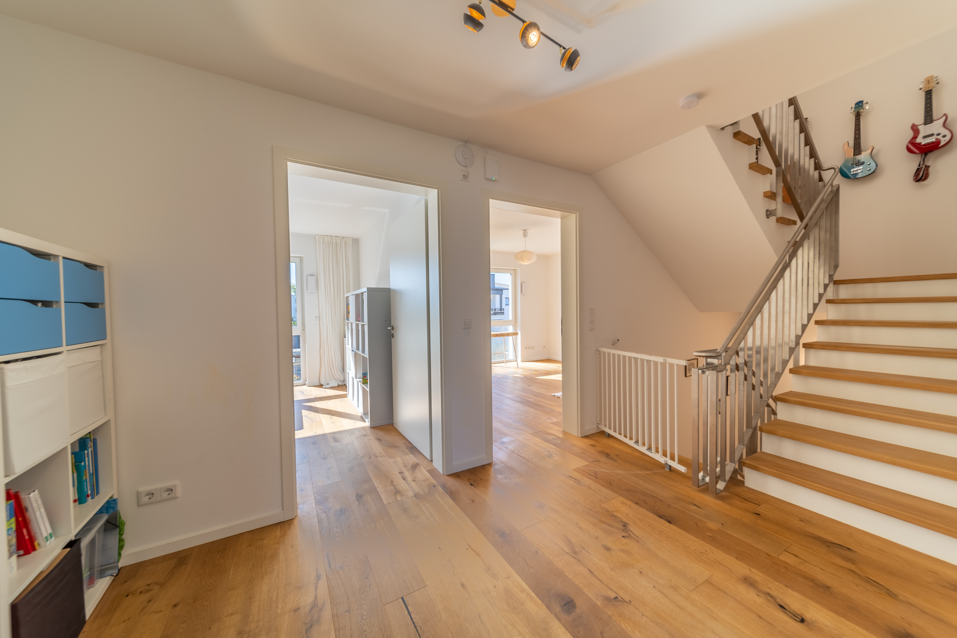 Im Dachgeschoss befinden sich drei weitere Zimmer sowie ein Bad mit ebenerdig gefliester Dusche und Anschlüssen für Waschmaschine und Trockner. Die Schlafzimmer verfügen über verlängerte Dachfenster, die auch hier viel Tageslicht in die Räume bringen. Der offene Flurbereich bietet zusätzlichen Platz für individuelle Nutzung – aktuell als Sportfläche gestaltet. Auch im Dachgeschoss wurde Landhausdielenparkett in Eiche verlegt.