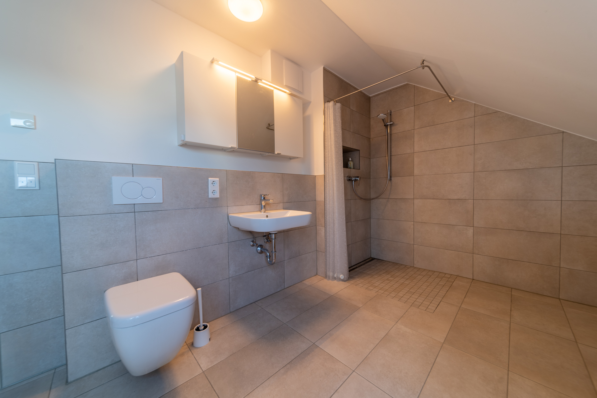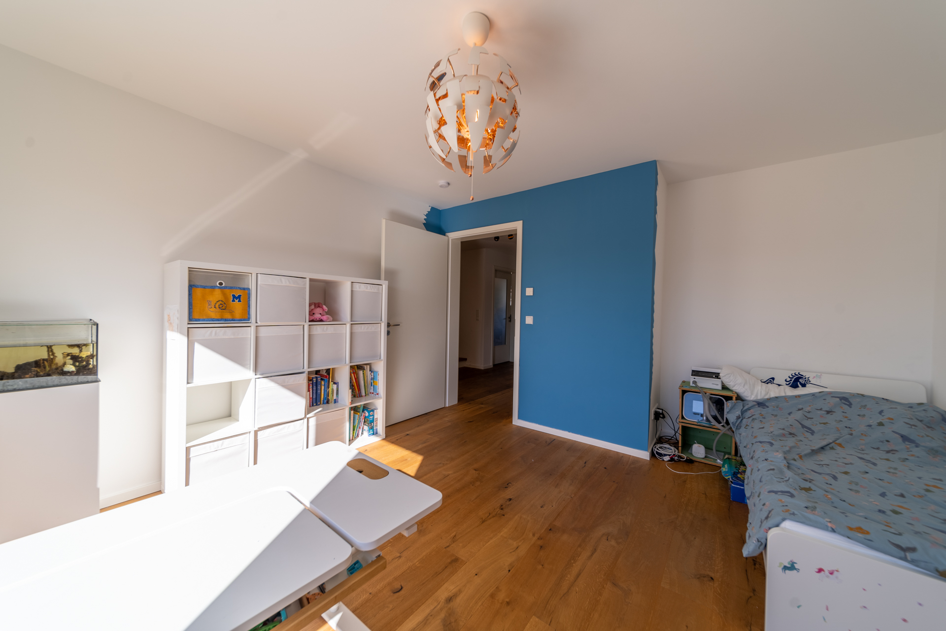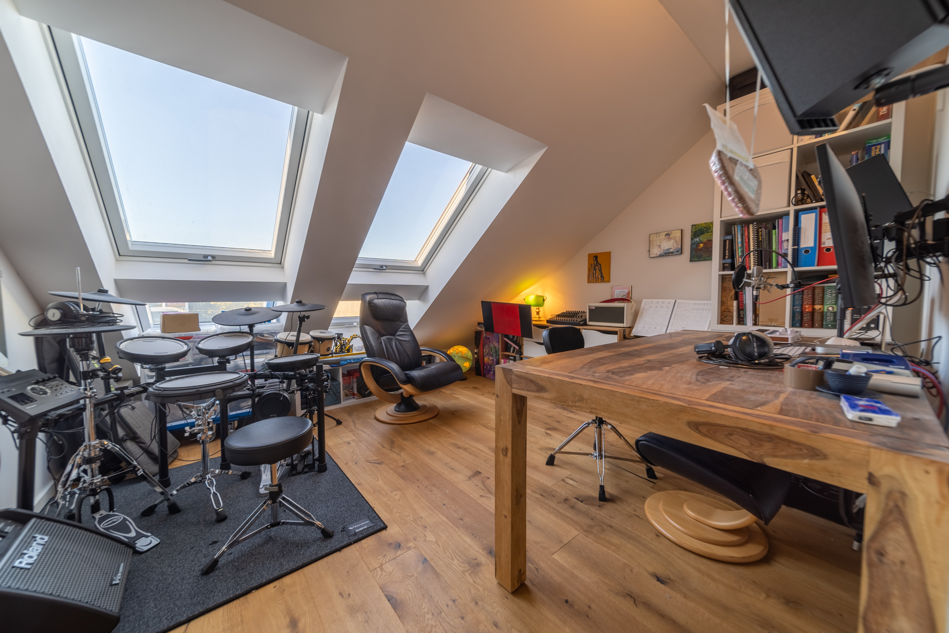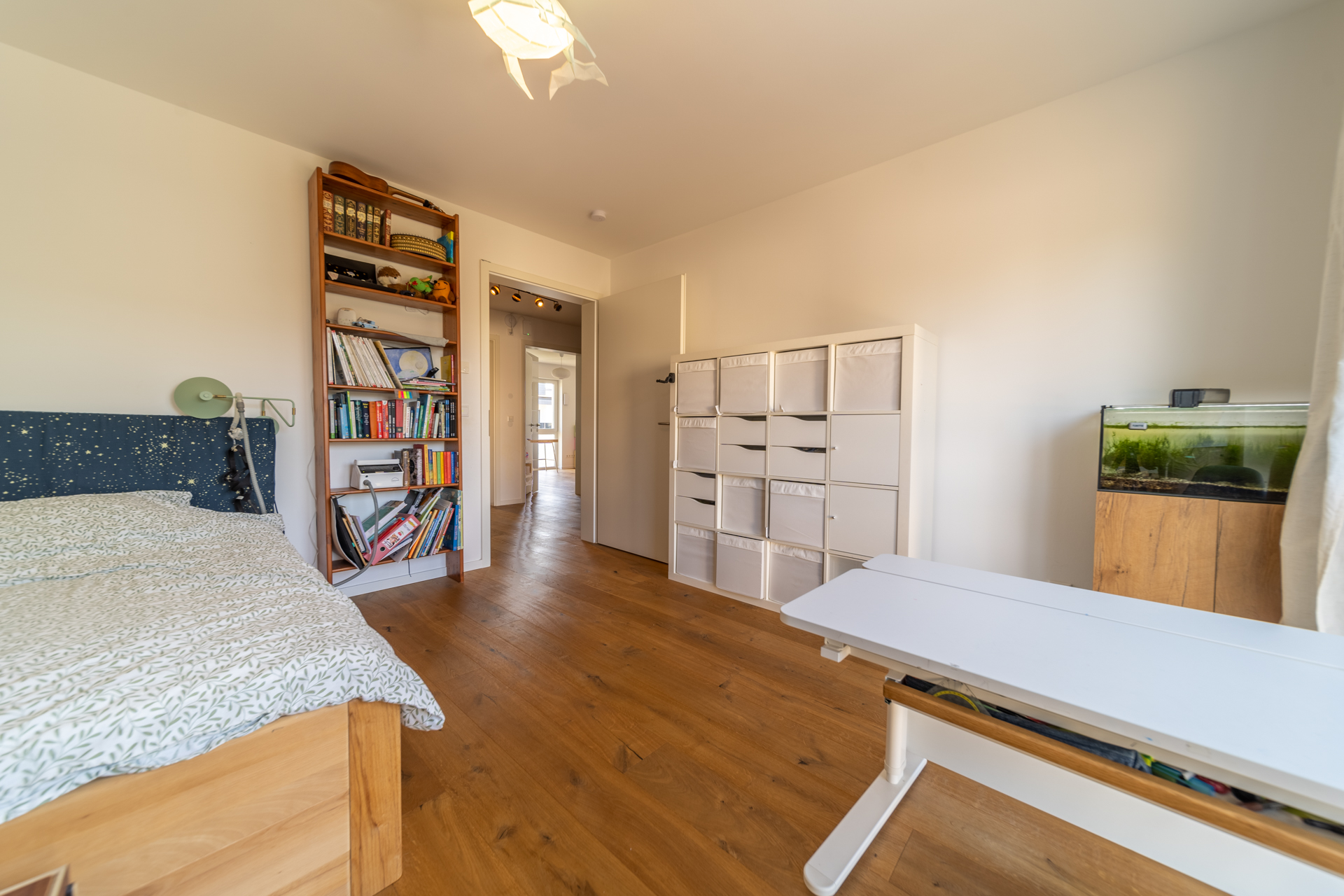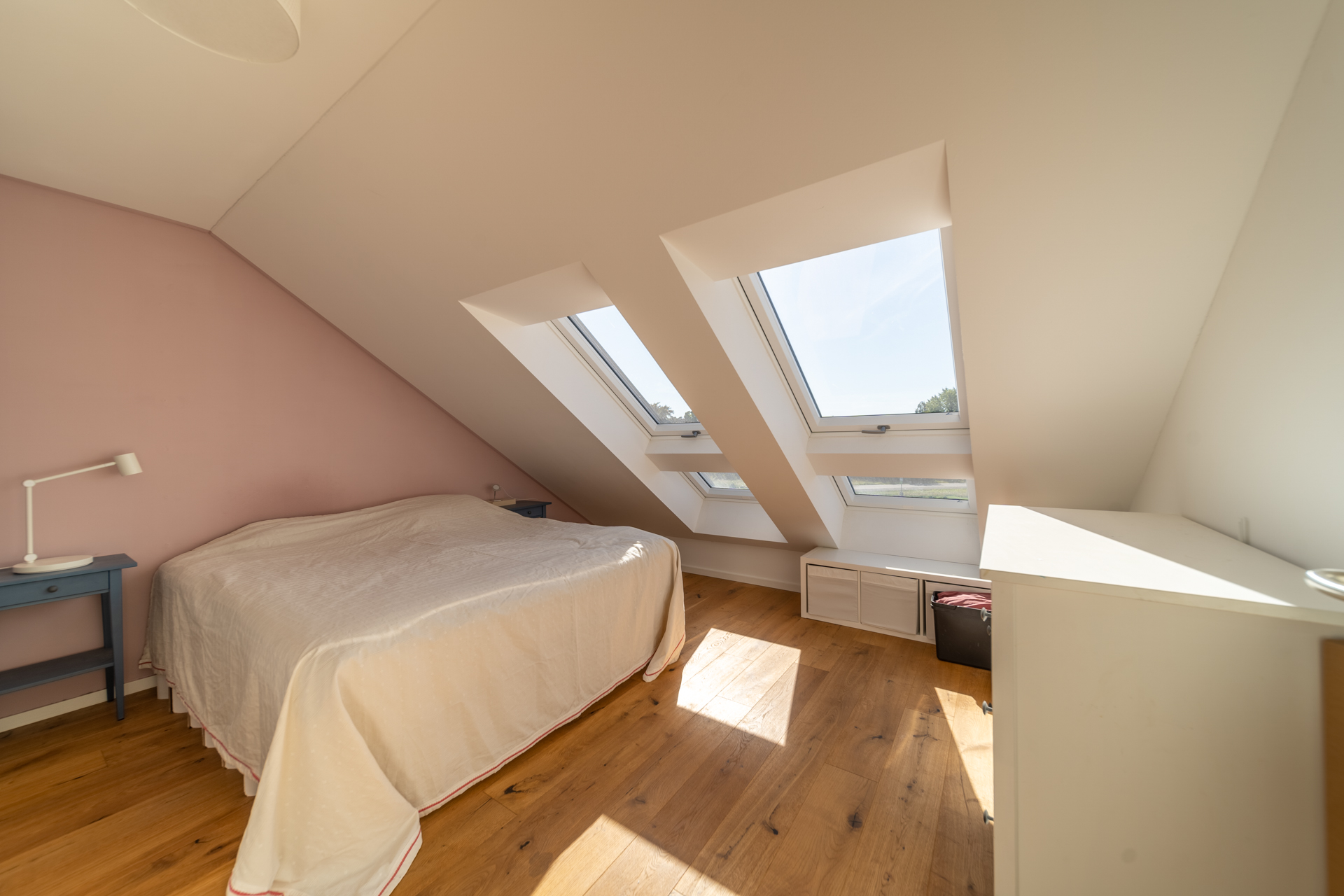 Im Dachgeschoss befinden sich drei weitere Zimmer sowie ein Bad mit ebenerdig gefliester Dusche und Anschlüssen für Waschmaschine und Trockner. Die Schlafzimmer verfügen über verlängerte Dachfenster, die auch hier viel Tageslicht in die Räume bringen. Der offene Flurbereich bietet zusätzlichen Platz für individuelle Nutzung – aktuell als Sportfläche gestaltet. Auch im Dachgeschoss wurde Landhausdielenparkett in Eiche verlegt.