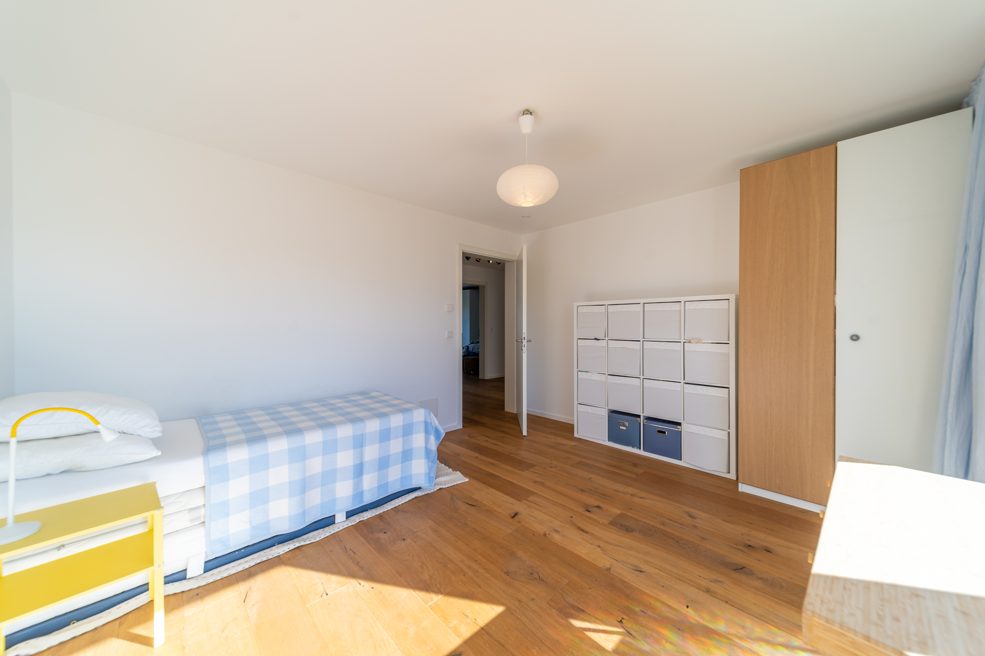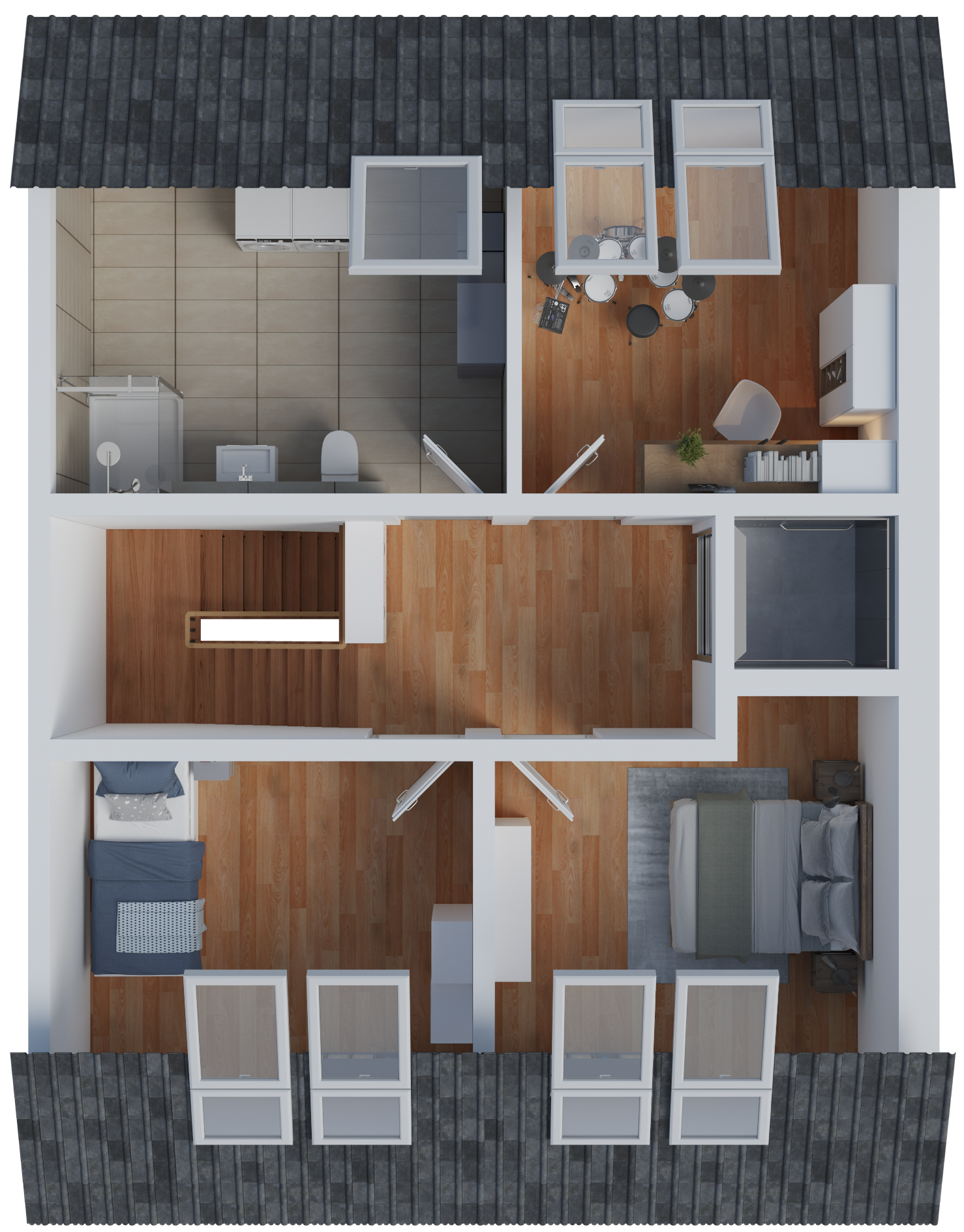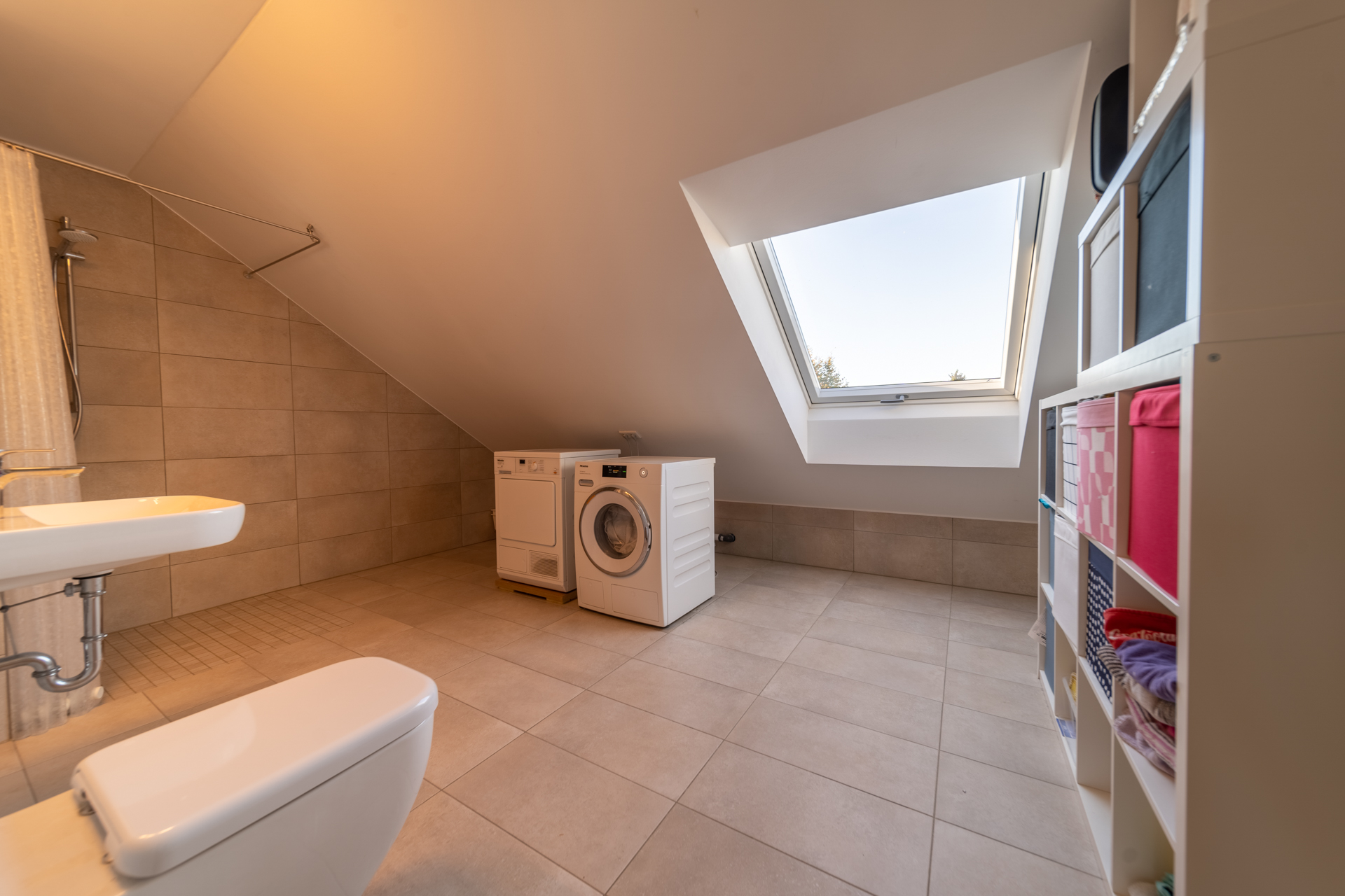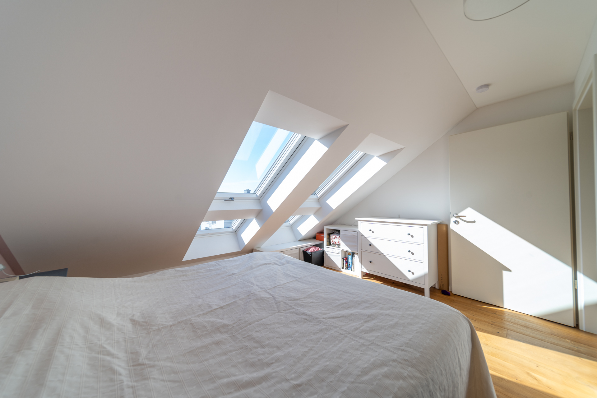 Im Dachgeschoss befinden sich drei weitere Zimmer sowie ein Bad mit ebenerdig gefliester Dusche und Anschlüssen für Waschmaschine und Trockner. Die Schlafzimmer verfügen über verlängerte Dachfenster, die auch hier viel Tageslicht in die Räume bringen. Der offene Flurbereich bietet zusätzlichen Platz für individuelle Nutzung – aktuell als Sportfläche gestaltet. Auch im Dachgeschoss wurde Landhausdielenparkett in Eiche verlegt.