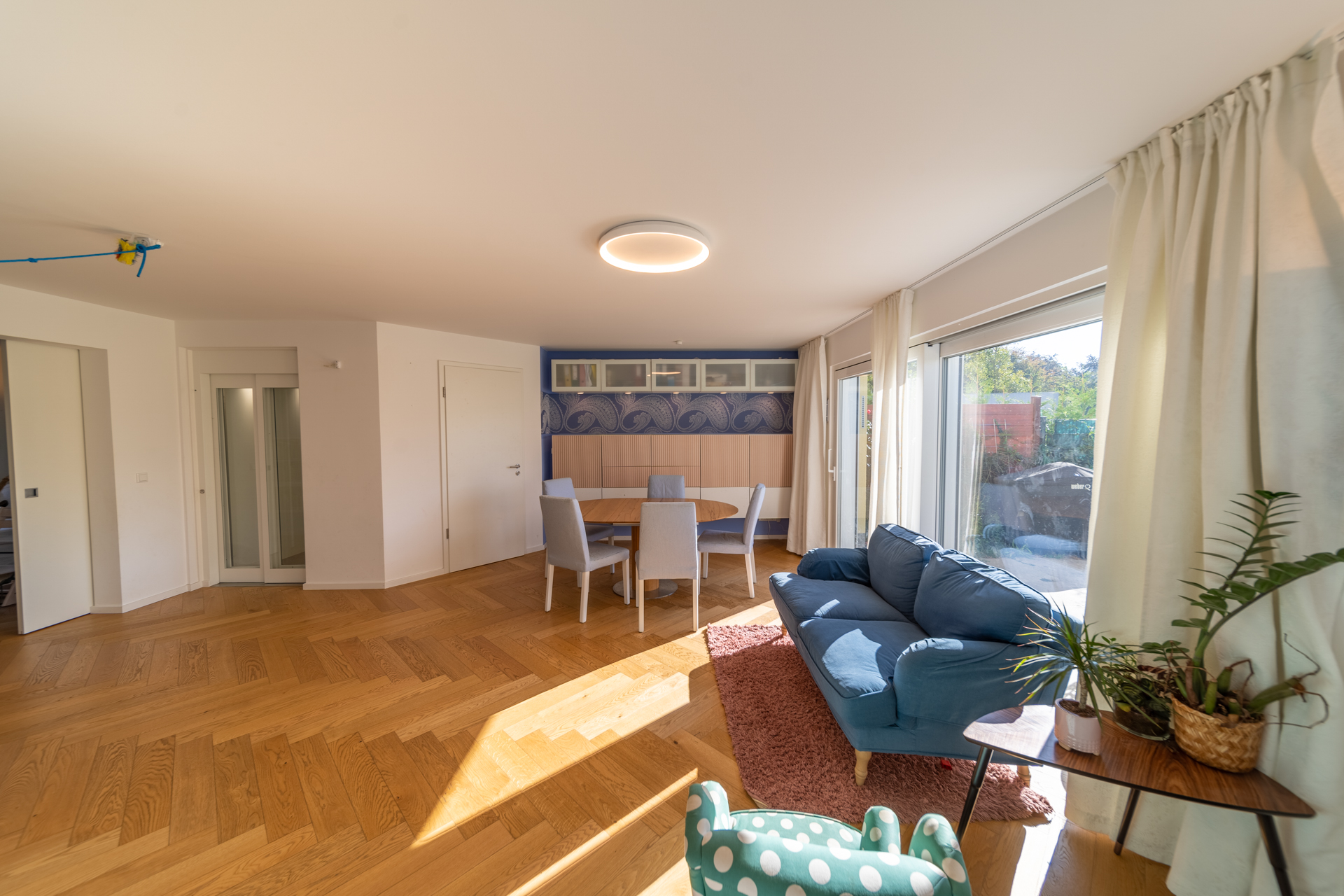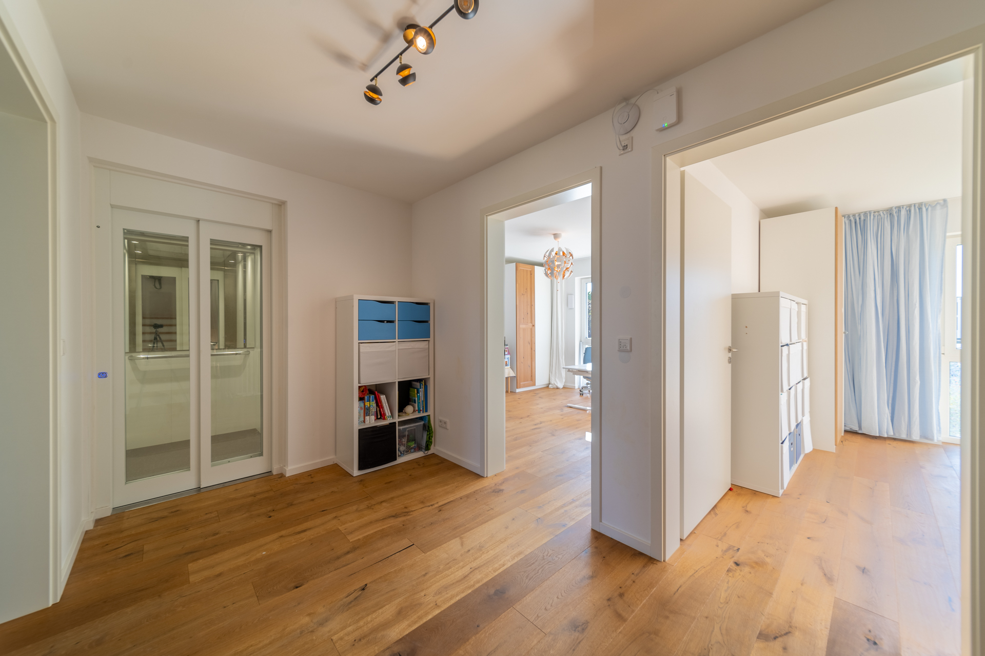 Neben der klaren Aufteilung überzeugt das Haus mit besonderen Highlights: Der beleuchtete Aufzug verbindet alle Etagen miteinander und ist mit 400 kg Tragkraft, Glastüren, Spiegel zur Unterstützung von Rollstuhlfahrern, automatischer Türöffnung und Notabsenkung ausgestattet.