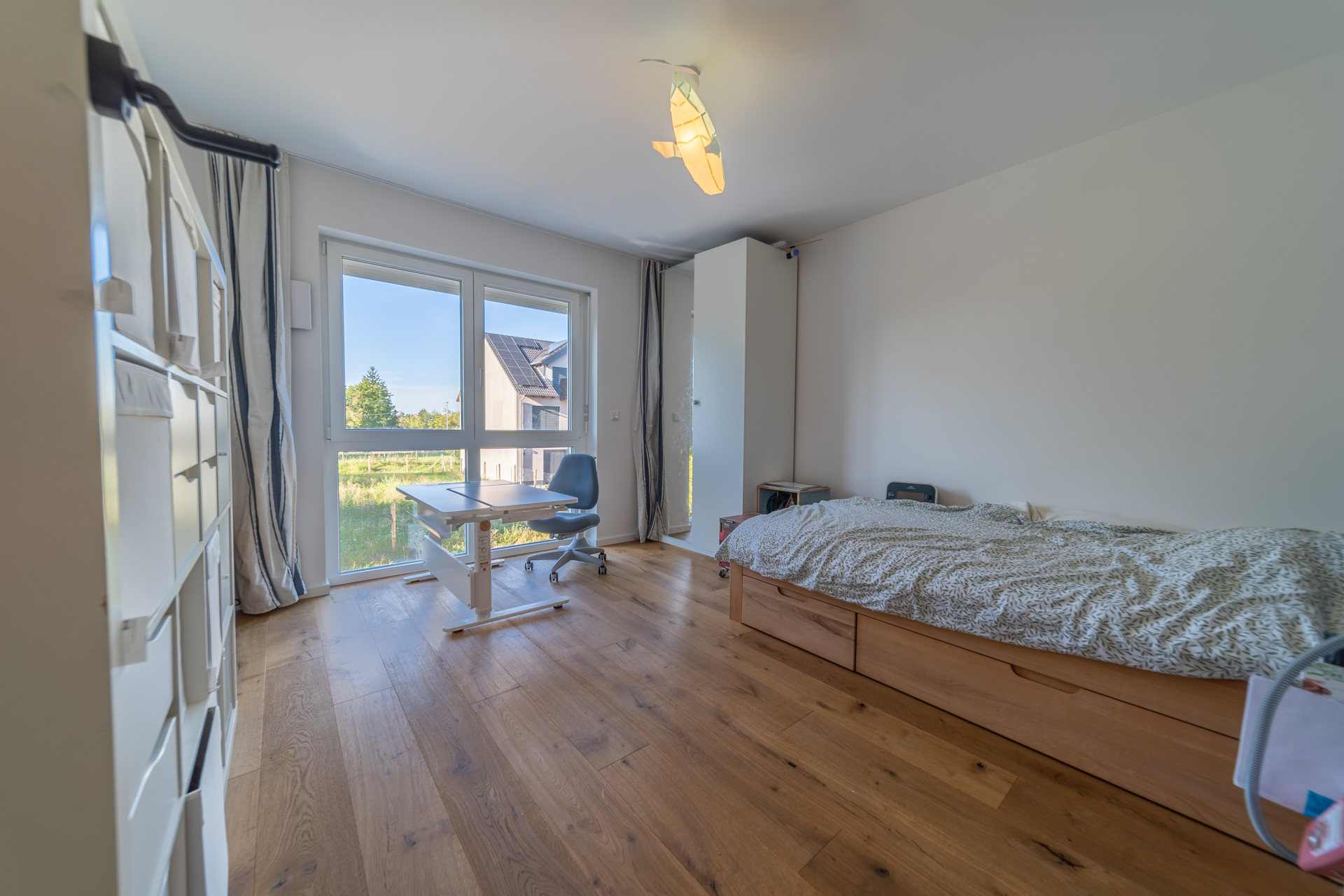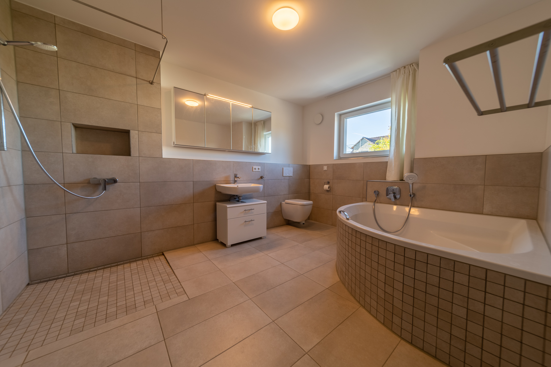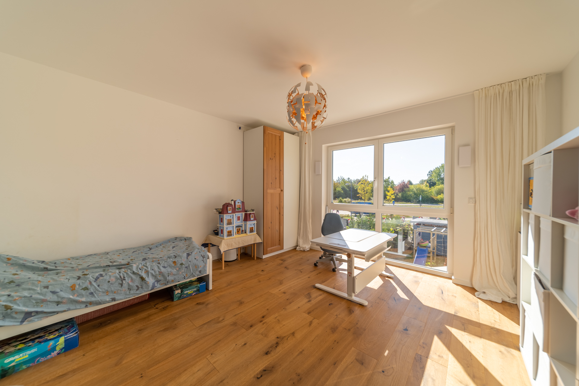 Das Obergeschoss umfasst drei helle Schlafzimmer mit bodentiefen Fenstern, die für viel Licht sorgen. Ein großes Bad mit XXL Eckbadewanne und bodengleich gefliester Dusche sorgt hier für Komfort. Zusätzlich gibt es ein separates weiteres WC. Der Boden ist mit Landhausdielenparkett in Eiche versehen, was den Räumen eine warme Atmosphäre verleiht.