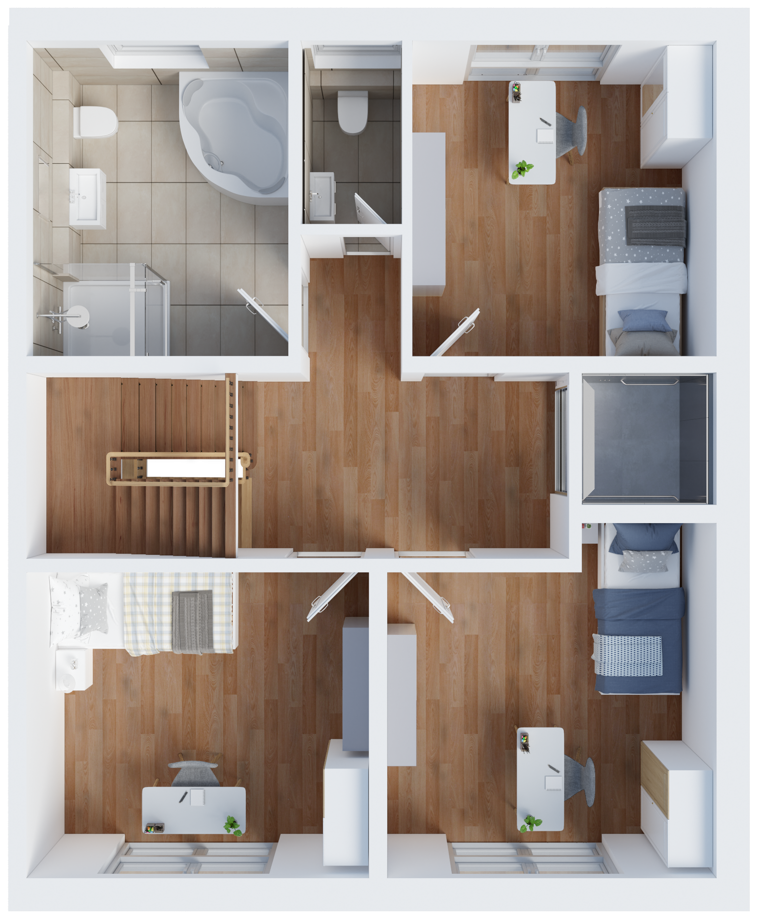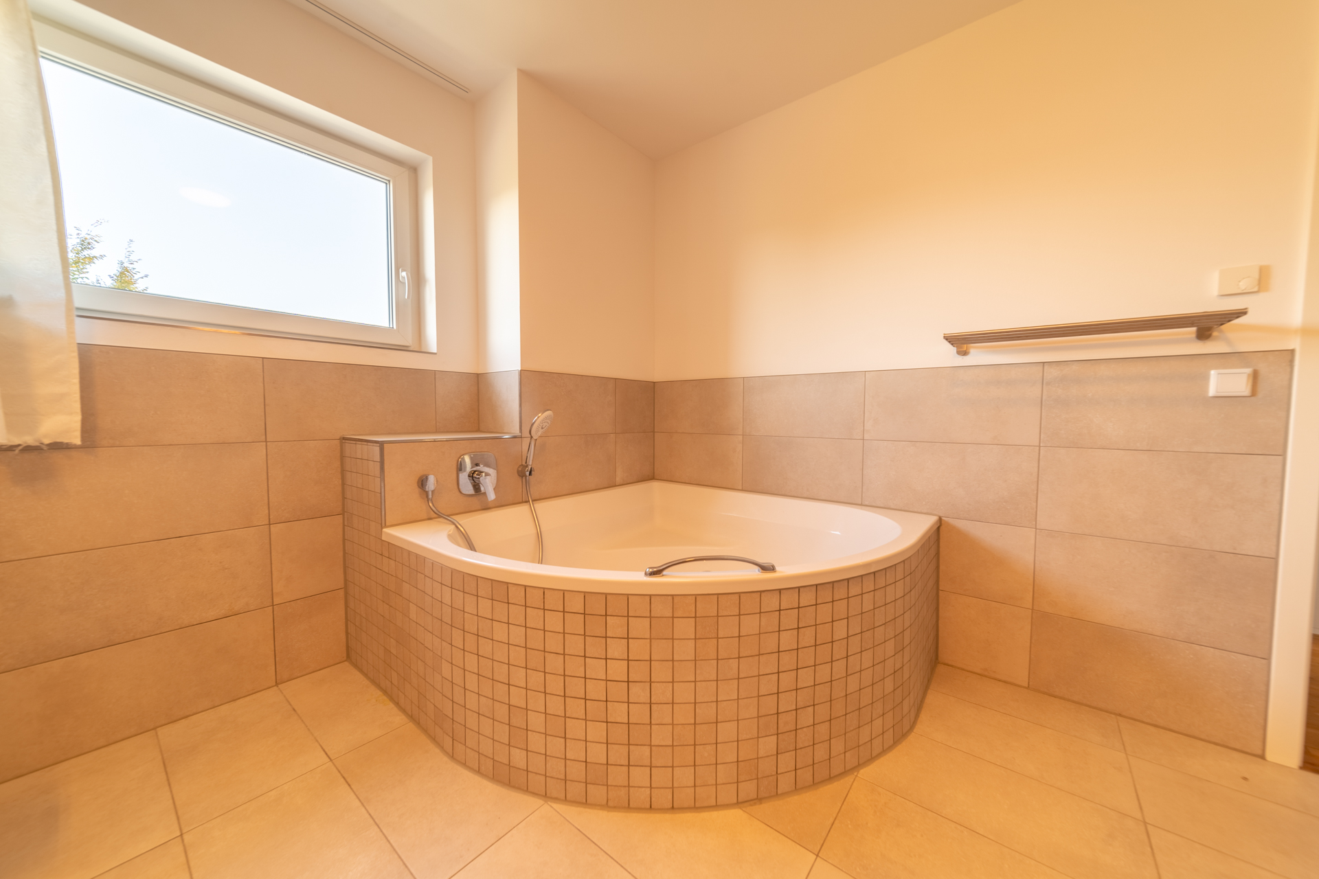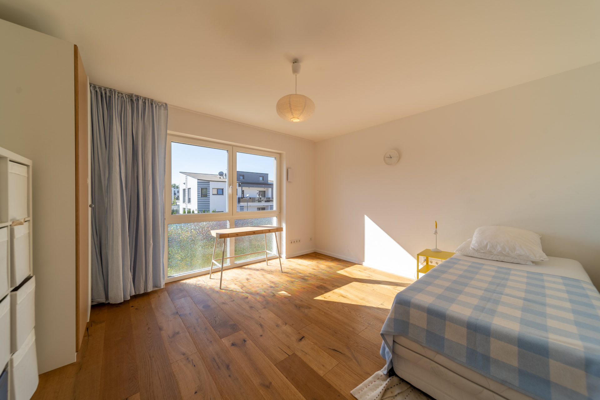 Das Obergeschoss umfasst drei helle Schlafzimmer mit bodentiefen Fenstern, die für viel Licht sorgen. Ein großes Bad mit XXL Eckbadewanne und bodengleich gefliester Dusche sorgt hier für Komfort. Zusätzlich gibt es ein separates weiteres WC. Der Boden ist mit Landhausdielenparkett in Eiche versehen, was den Räumen eine warme Atmosphäre verleiht.