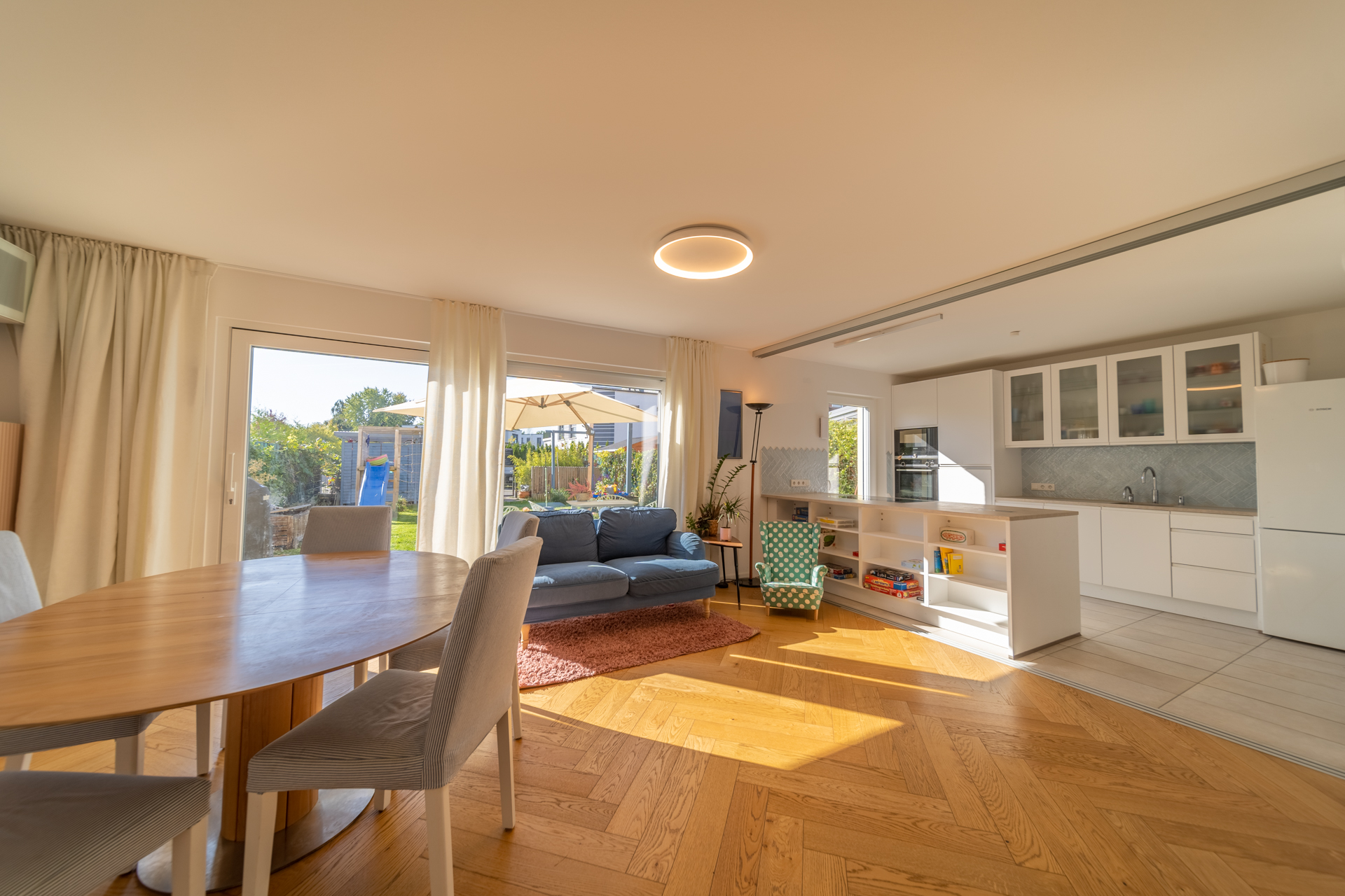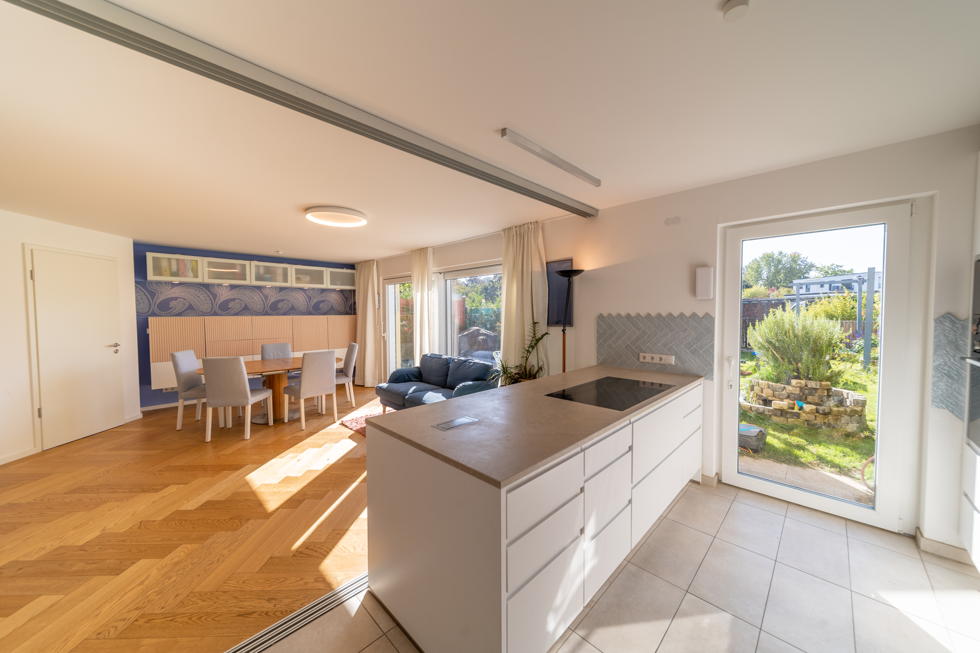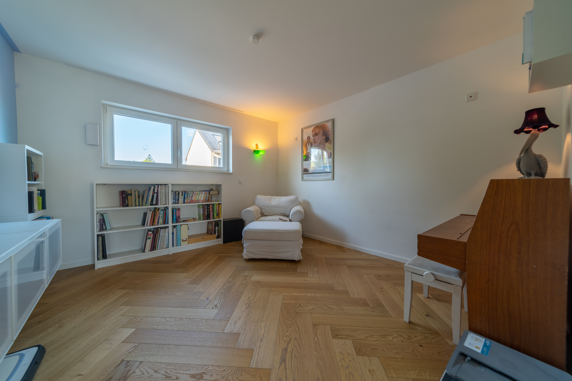 Sie betreten das Haus durch die elektrisch öffnende Haustür mit Fernbedienung. Im Erdgeschoss empfängt Sie ein großzügiger Eingangsbereich mit Gäste-WC und Haustechnikraum. Von hier führt der Weg in den offenen Wohn- und Essbereich, der mit Echtholz-Fischgrätparkett ausgestattet ist. Die offene Küche bietet eine praktische Abstellnische. Über die große Fensterfront des Wohnzimmers gelangt man direkt auf die Terrasse und in den Garten. Dieser ist nach Südosten ausgerichtet, bietet viel Platz für Spielen, Entspannen oder gesellige Runden und verfügt über zwei Gartenschuppen sowie ein Gartentor auf der Rückseite. Ein weiteres Zimmer im Erdgeschoss, aktuell als Musik- und Fernsehzimmer genutzt, lässt sich durch eine Schiebetür bei Bedarf vom Wohnraum trennen.