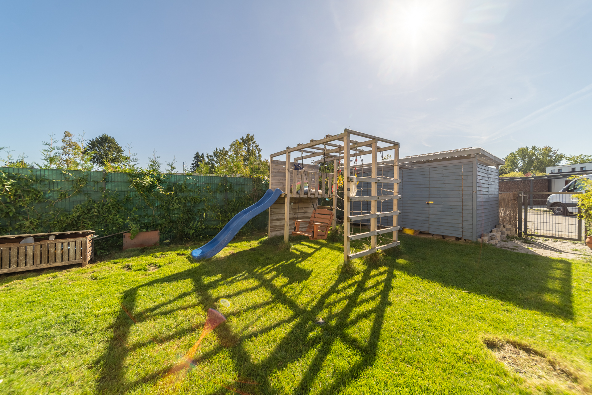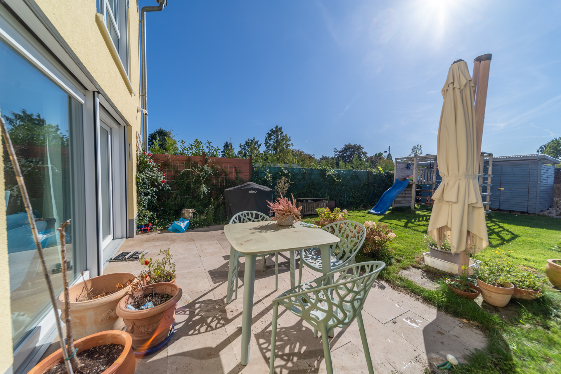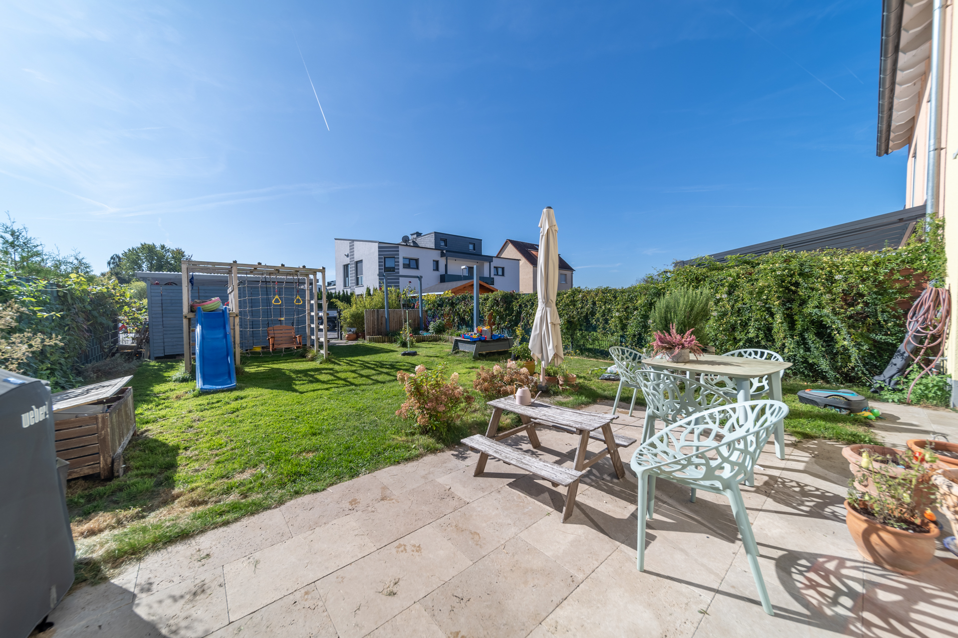 Sie betreten das Haus durch die elektrisch öffnende Haustür mit Fernbedienung. Im Erdgeschoss empfängt Sie ein großzügiger Eingangsbereich mit Gäste-WC und Haustechnikraum. Von hier führt der Weg in den offenen Wohn- und Essbereich, der mit Echtholz-Fischgrätparkett ausgestattet ist. Die offene Küche bietet eine praktische Abstellnische. Über die große Fensterfront des Wohnzimmers gelangt man direkt auf die Terrasse und in den Garten. Dieser ist nach Südosten ausgerichtet, bietet viel Platz für Spielen, Entspannen oder gesellige Runden und verfügt über zwei Gartenschuppen sowie ein Gartentor auf der Rückseite. Ein weiteres Zimmer im Erdgeschoss, aktuell als Musik- und Fernsehzimmer genutzt, lässt sich durch eine Schiebetür bei Bedarf vom Wohnraum trennen.