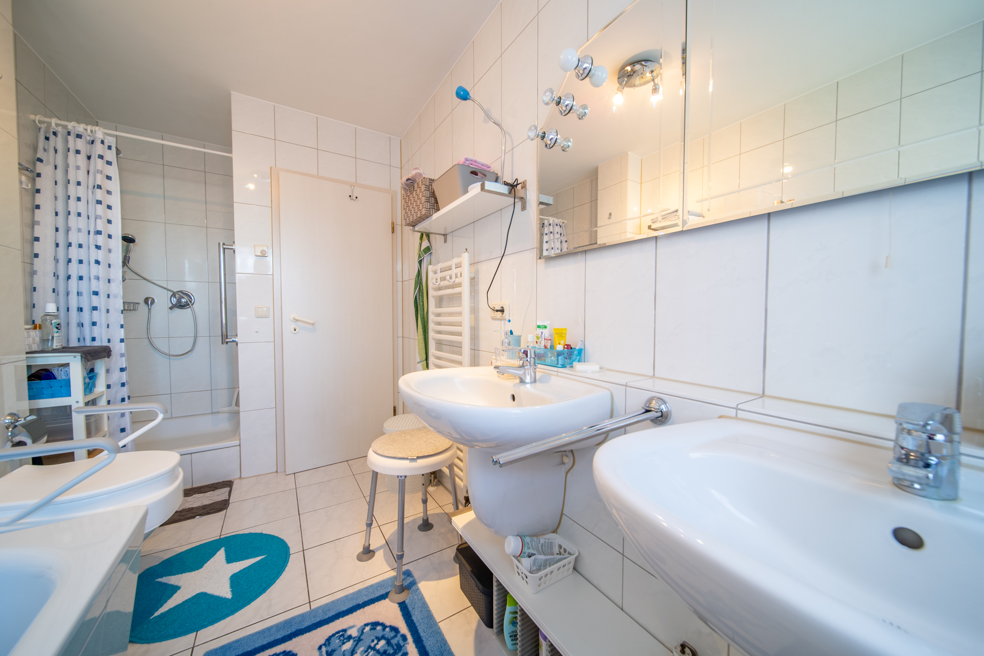Das Badezimmer ist komfortabel ausgestattet mit Doppelwaschbecken, Badewanne und separater Dusche. Ergänzt wird das Raumangebot durch ein praktisches Gäste-WC.