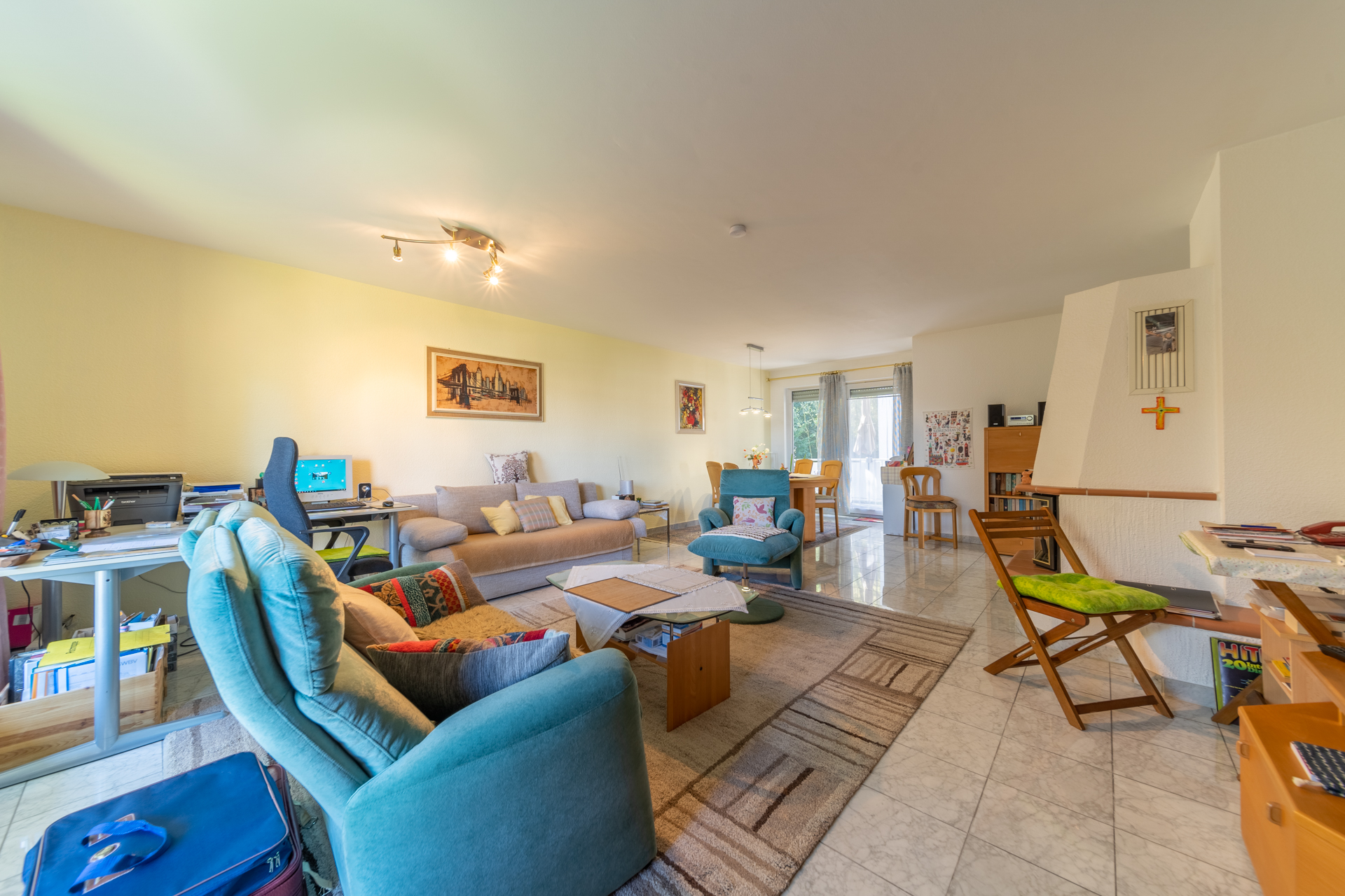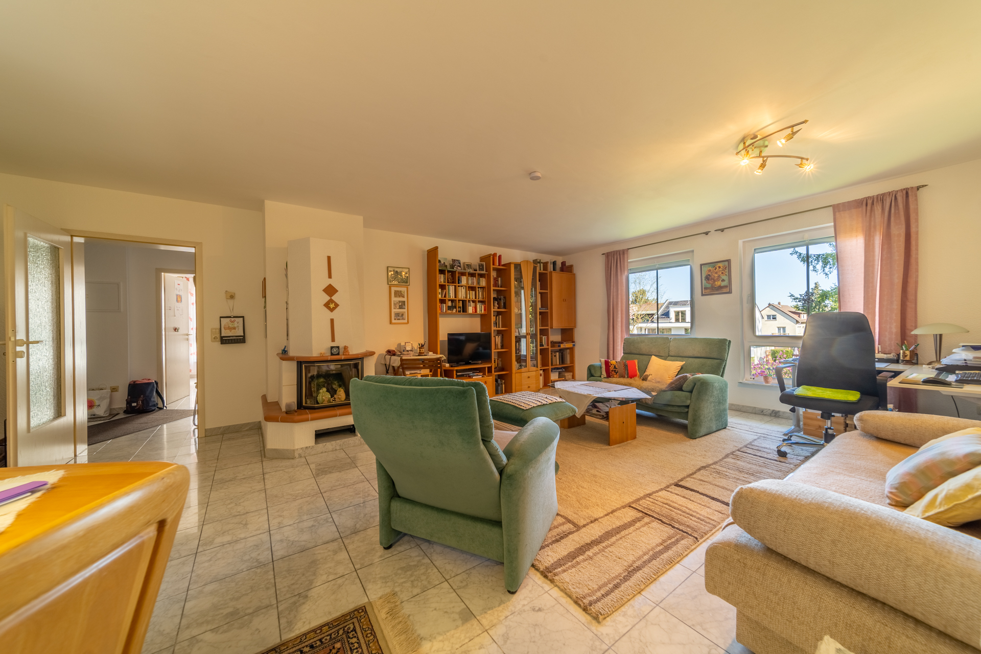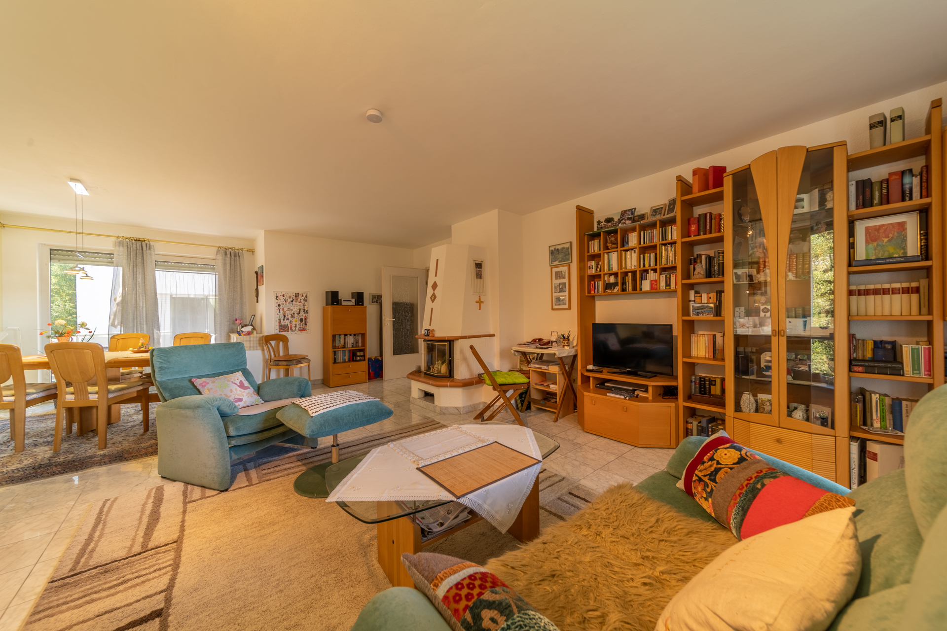 Das Herzstück der Wohnung bildet das großzügige Wohnzimmer mit knapp 36 m², das durch seine Weitläufigkeit und den schönen Blick in den gemeinschaftlich genutzten Garten überzeugt. Ein vorhandener Kamin ist derzeit stillgelegt, könnte jedoch, vorbehaltlich einer Abstimmung mit dem zuständigen Schornsteinfeger sowie unter Einhaltung der aktuell geltenden Vorschriften und Emissionsgrenzwerte, wieder in Betrieb genommen werden und bietet somit zusätzliches Potenzial für eine besondere Wohnatmosphäre.