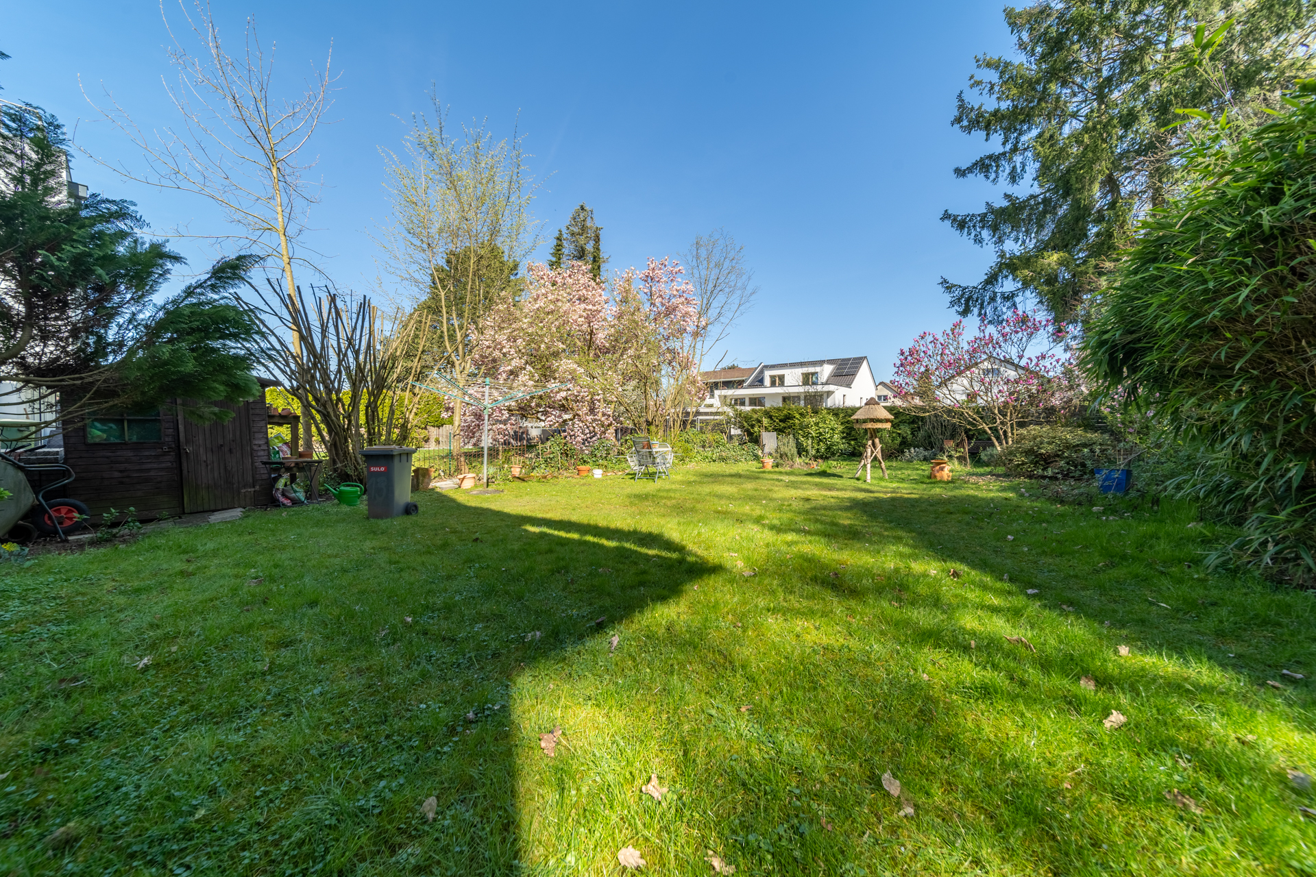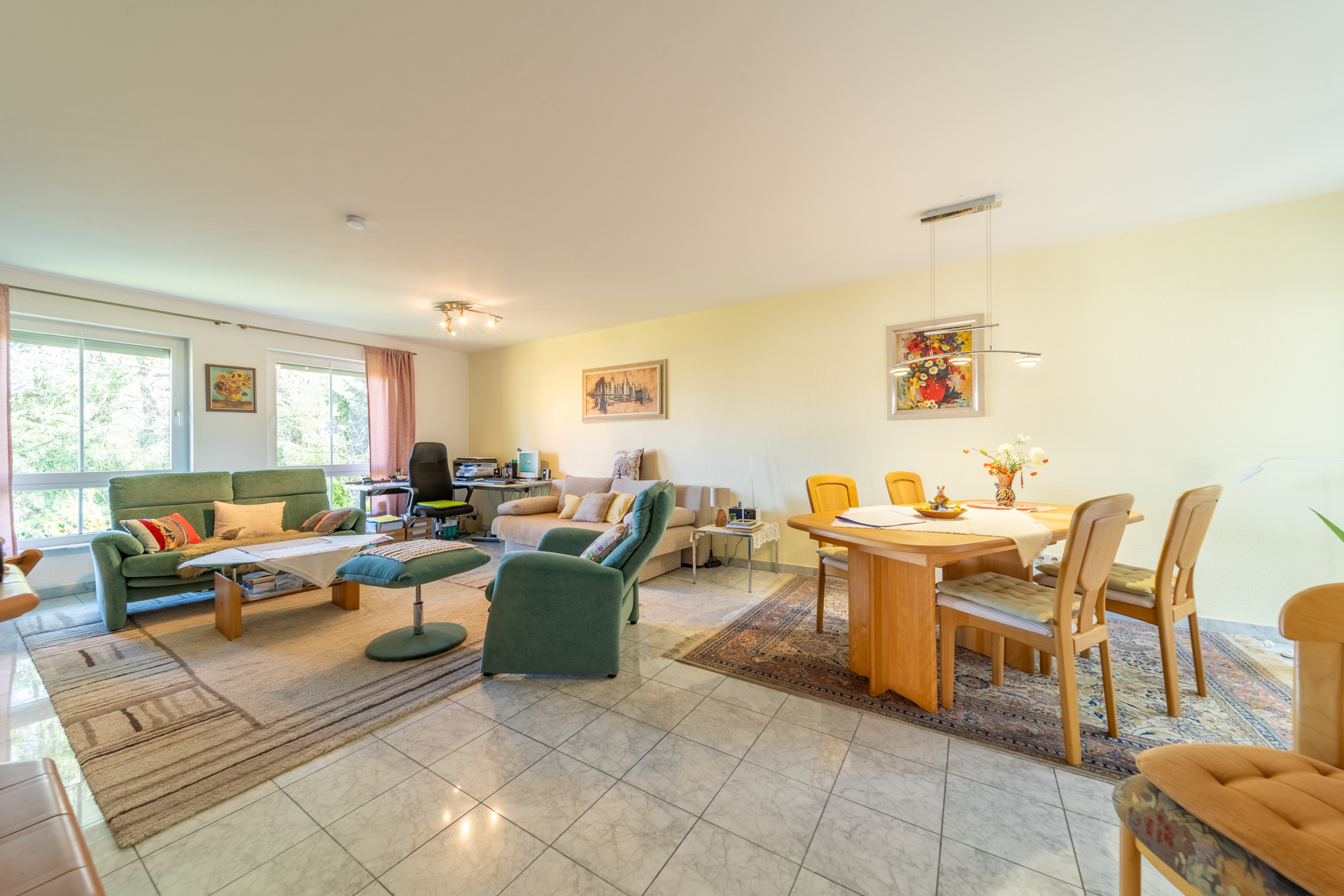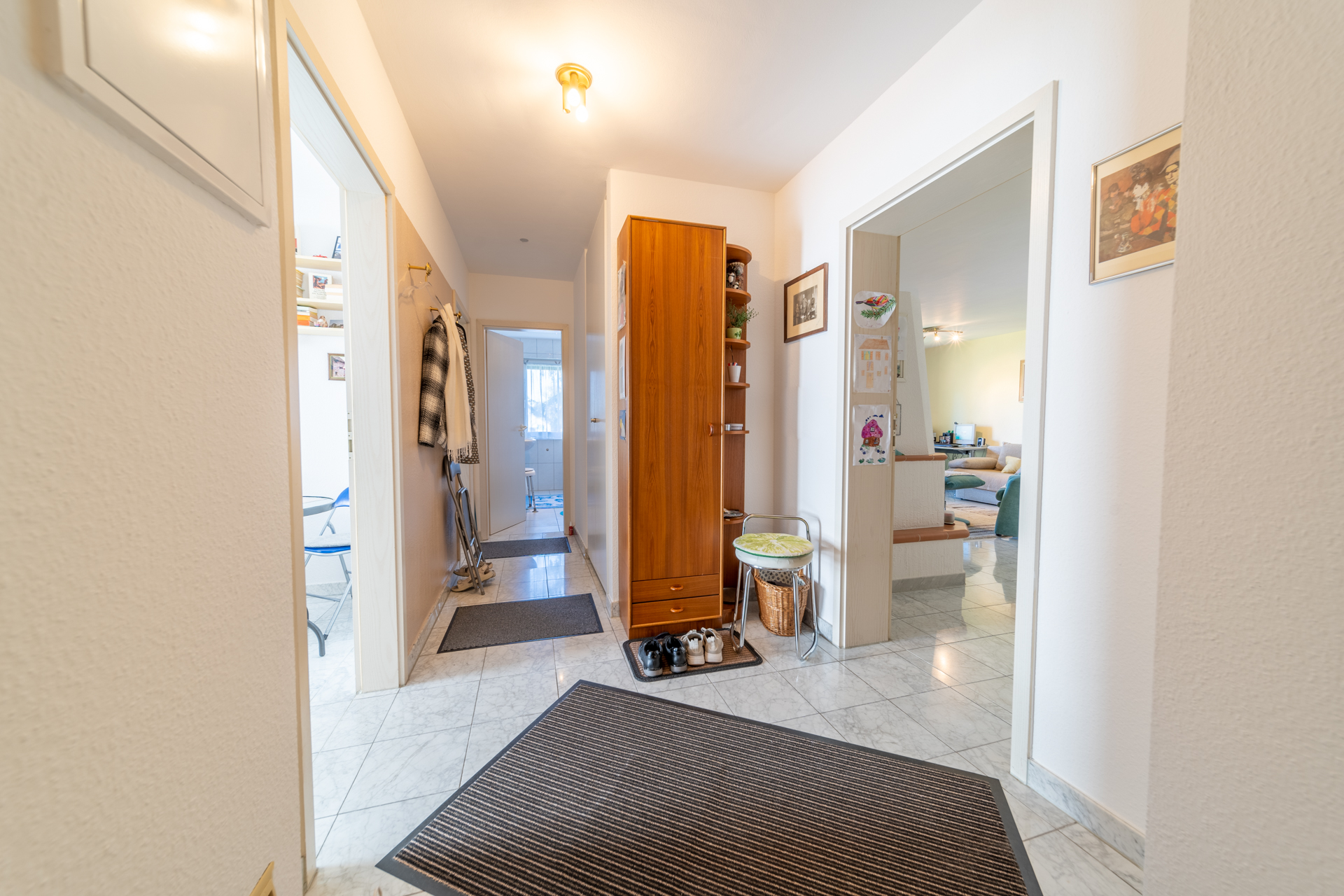 Das Herzstück der Wohnung bildet das großzügige Wohnzimmer mit knapp 36 m², das durch seine Weitläufigkeit und den schönen Blick in den gemeinschaftlich genutzten Garten überzeugt. Ein vorhandener Kamin ist derzeit stillgelegt, könnte jedoch, vorbehaltlich einer Abstimmung mit dem zuständigen Schornsteinfeger sowie unter Einhaltung der aktuell geltenden Vorschriften und Emissionsgrenzwerte, wieder in Betrieb genommen werden und bietet somit zusätzliches Potenzial für eine besondere Wohnatmosphäre.