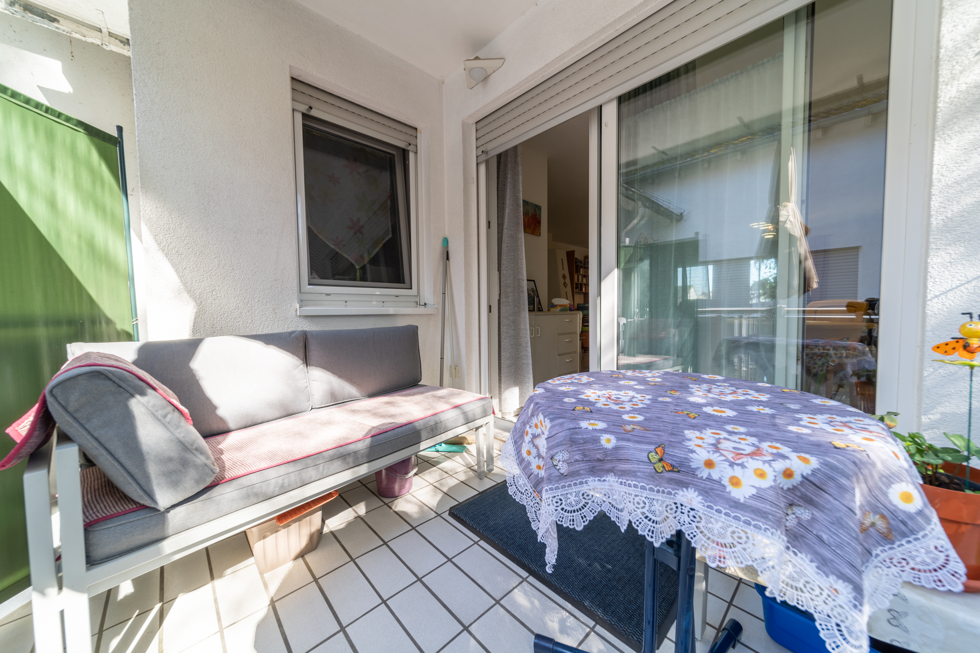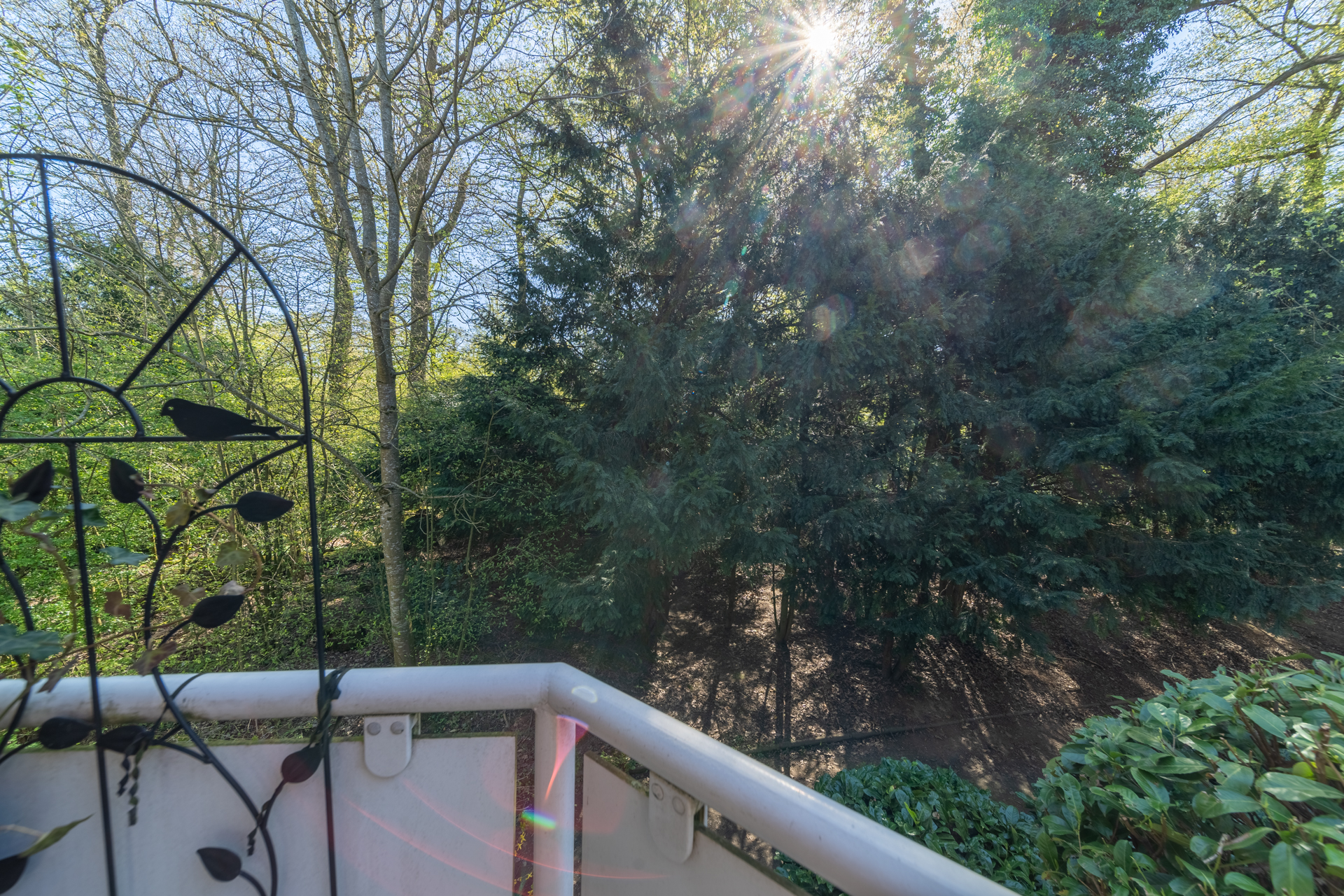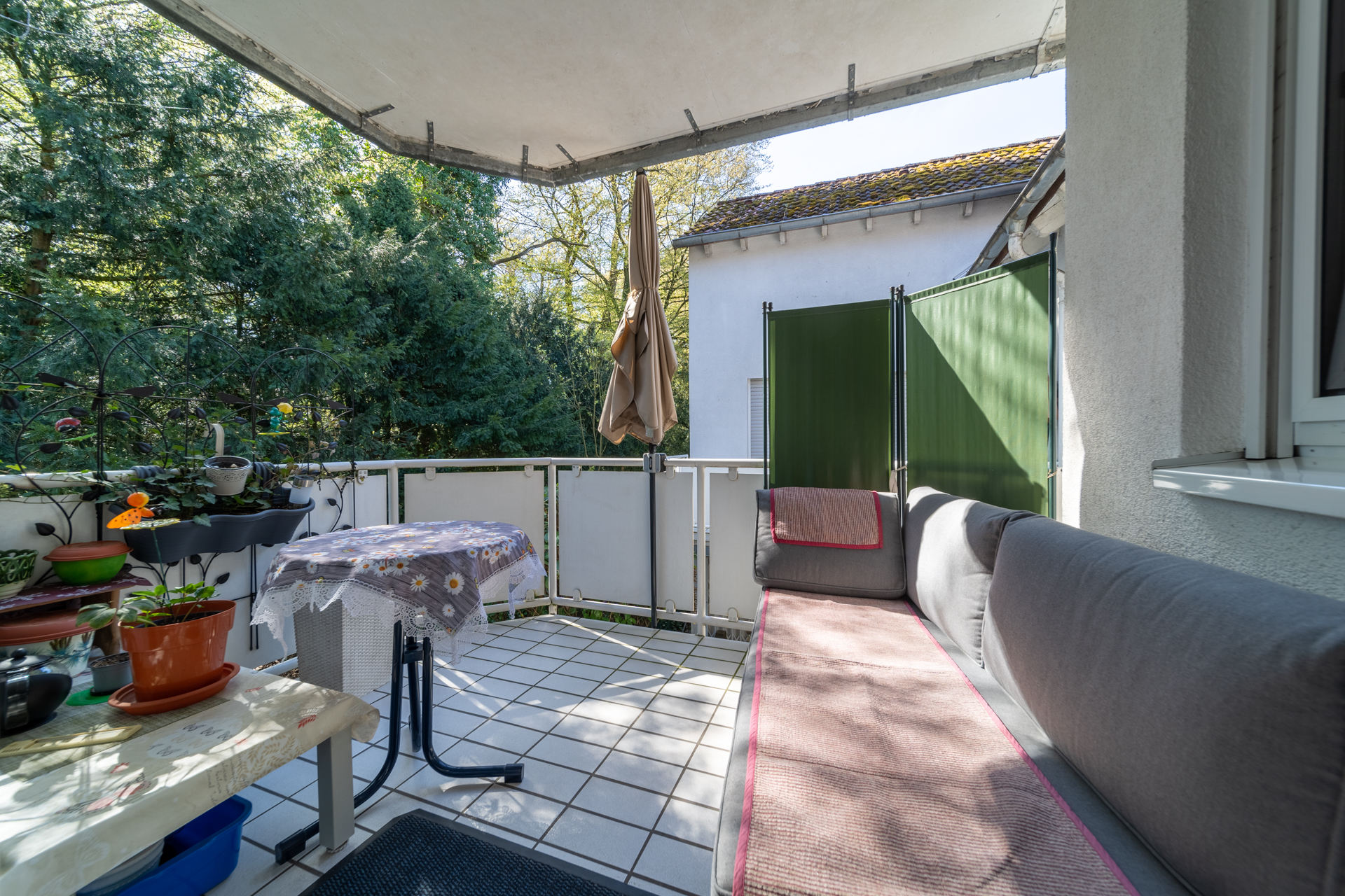 Ein Balkon lädt zum Verweilen im Freien ein und rundet das Wohnangebot ab. Die naturnahe Lage sowie der Blick ins Grüne unterstreichen den wohnlichen Charakter der Immobilie.