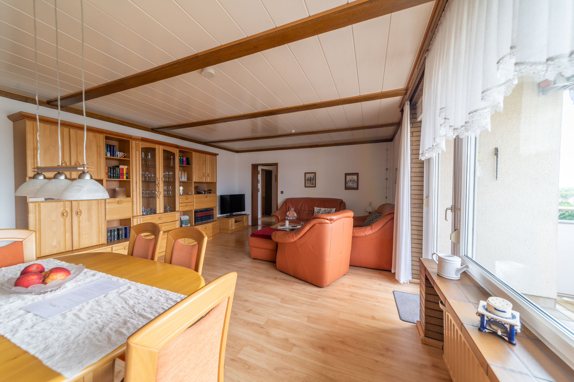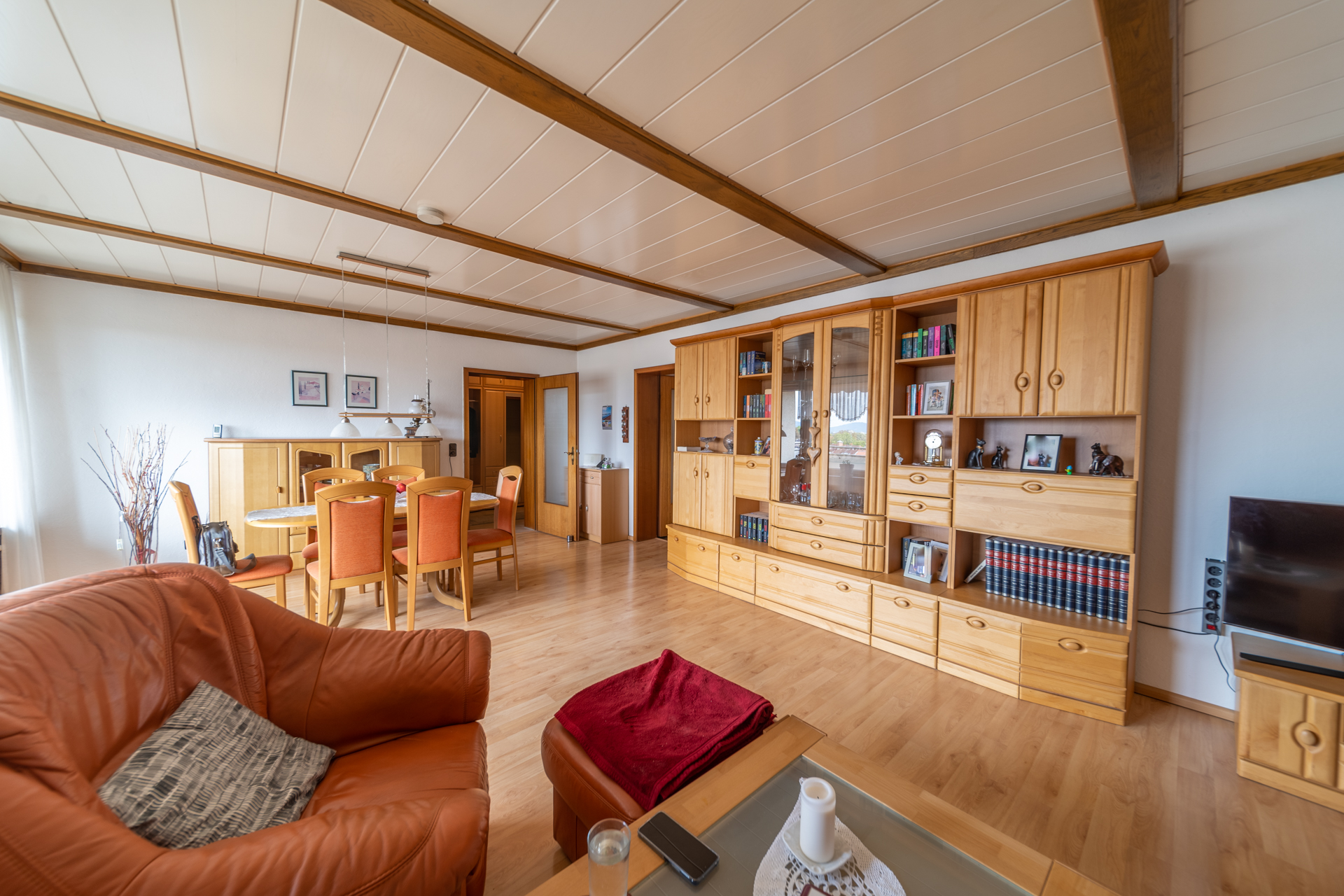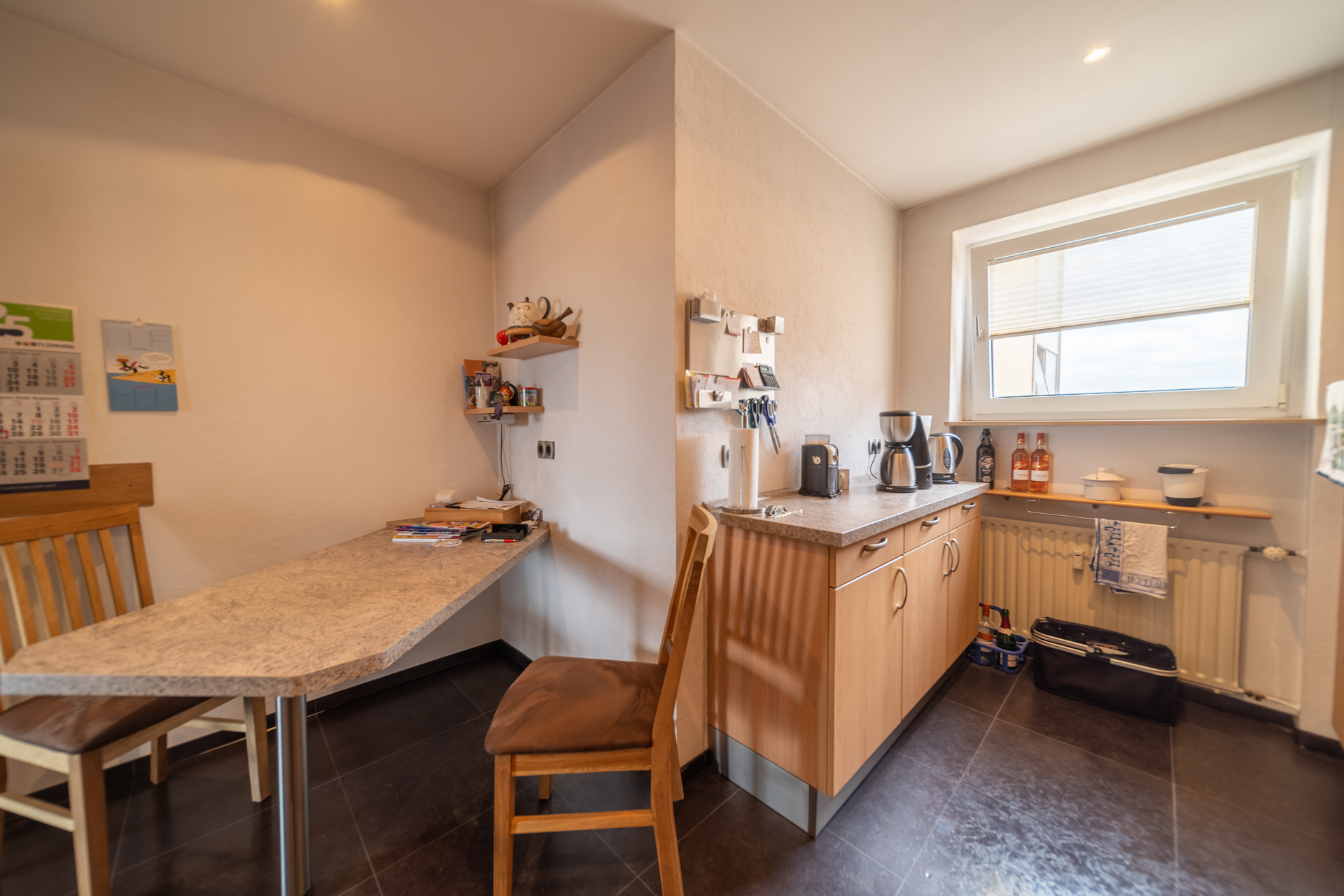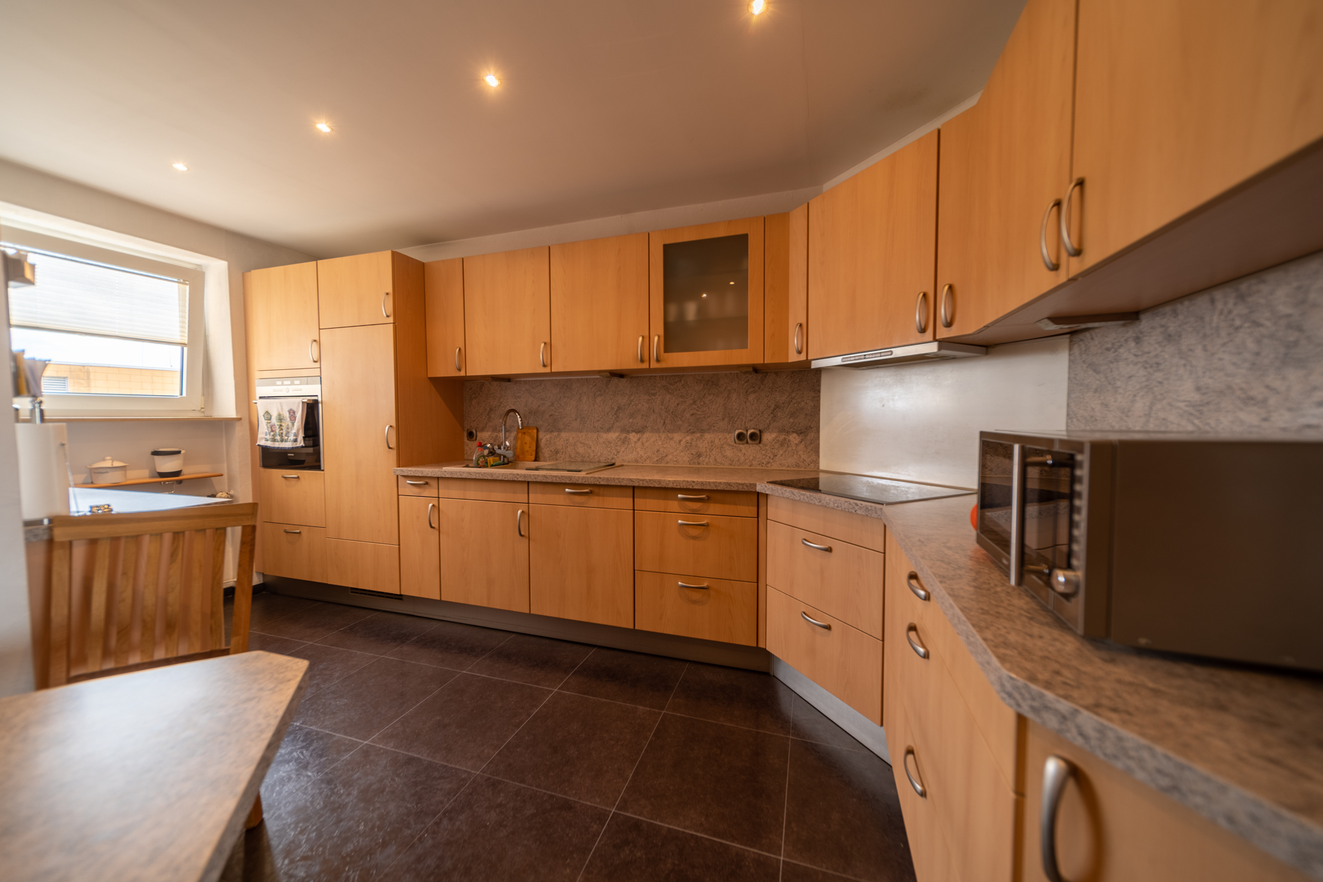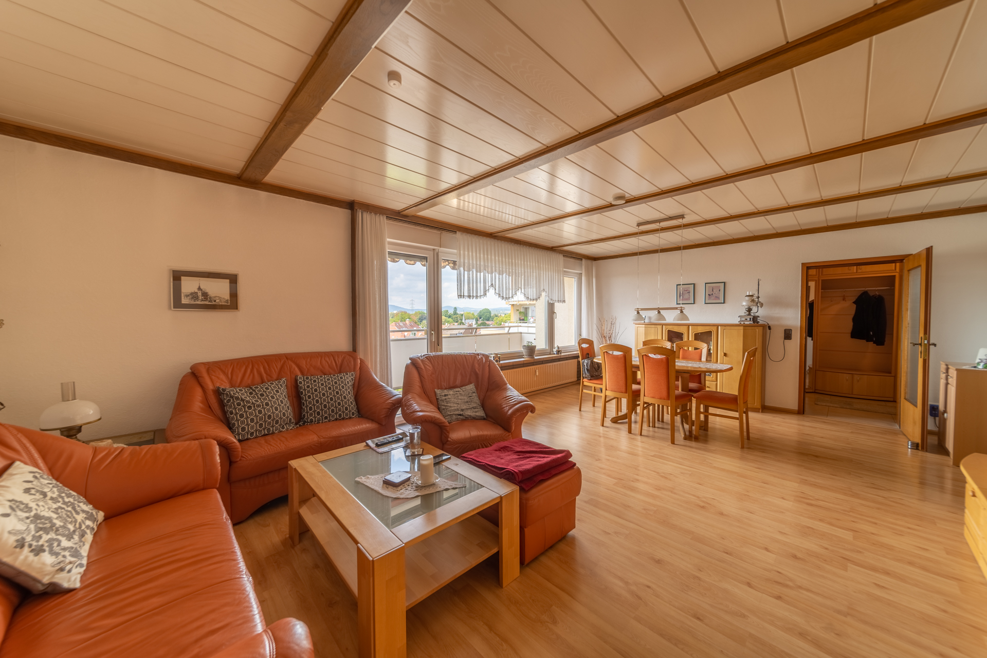 Das Herzstück der Wohnung ist das rund 31 m² große Wohnzimmer mit Zugang zum überdachten Balkon in westlicher Ausrichtung – ideal, um den Feierabend bei Sonnenuntergang zu genießen. Nebenan liegt die geräumige Küche, die zusätzlich Platz für eine Frühstücksecke bietet.