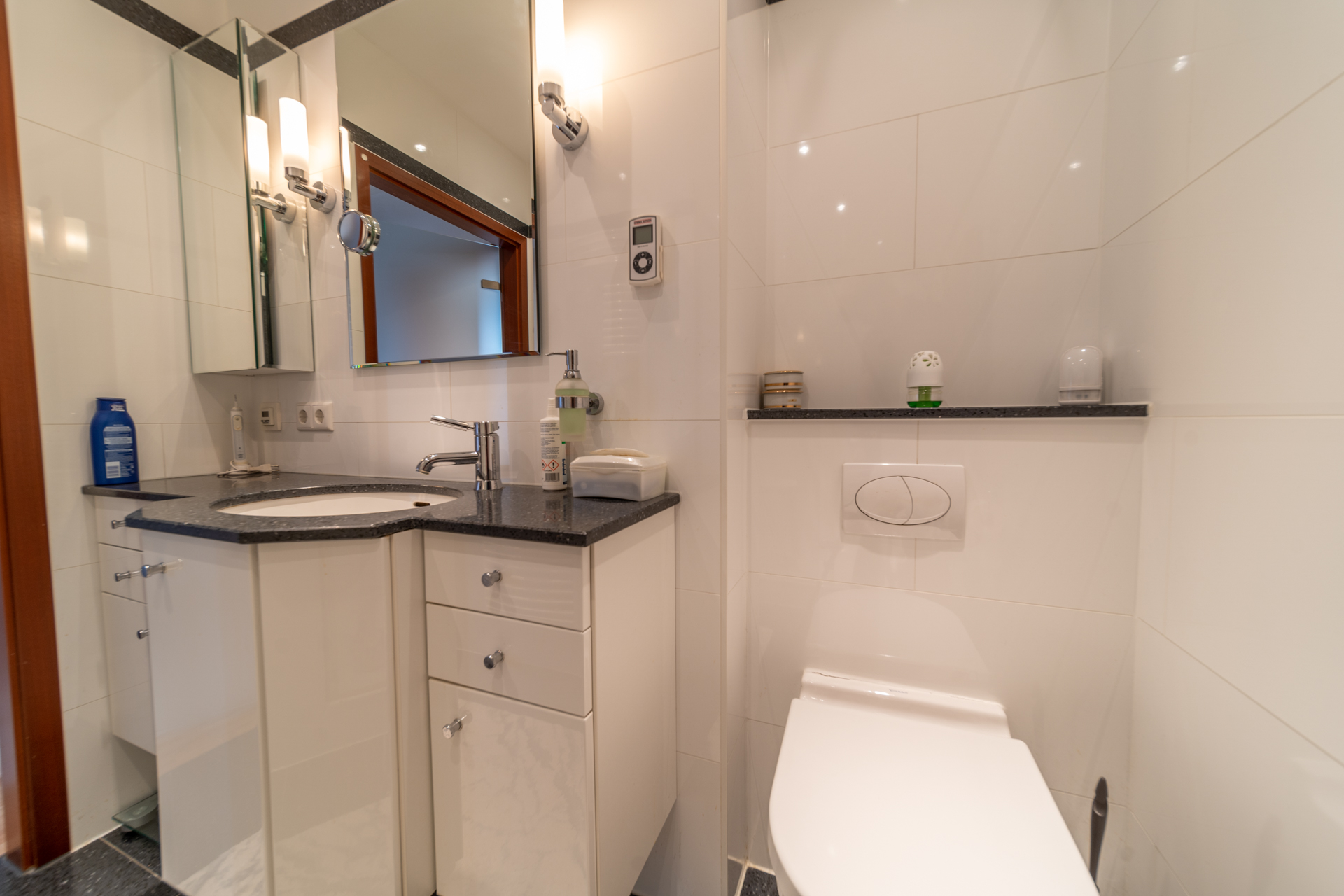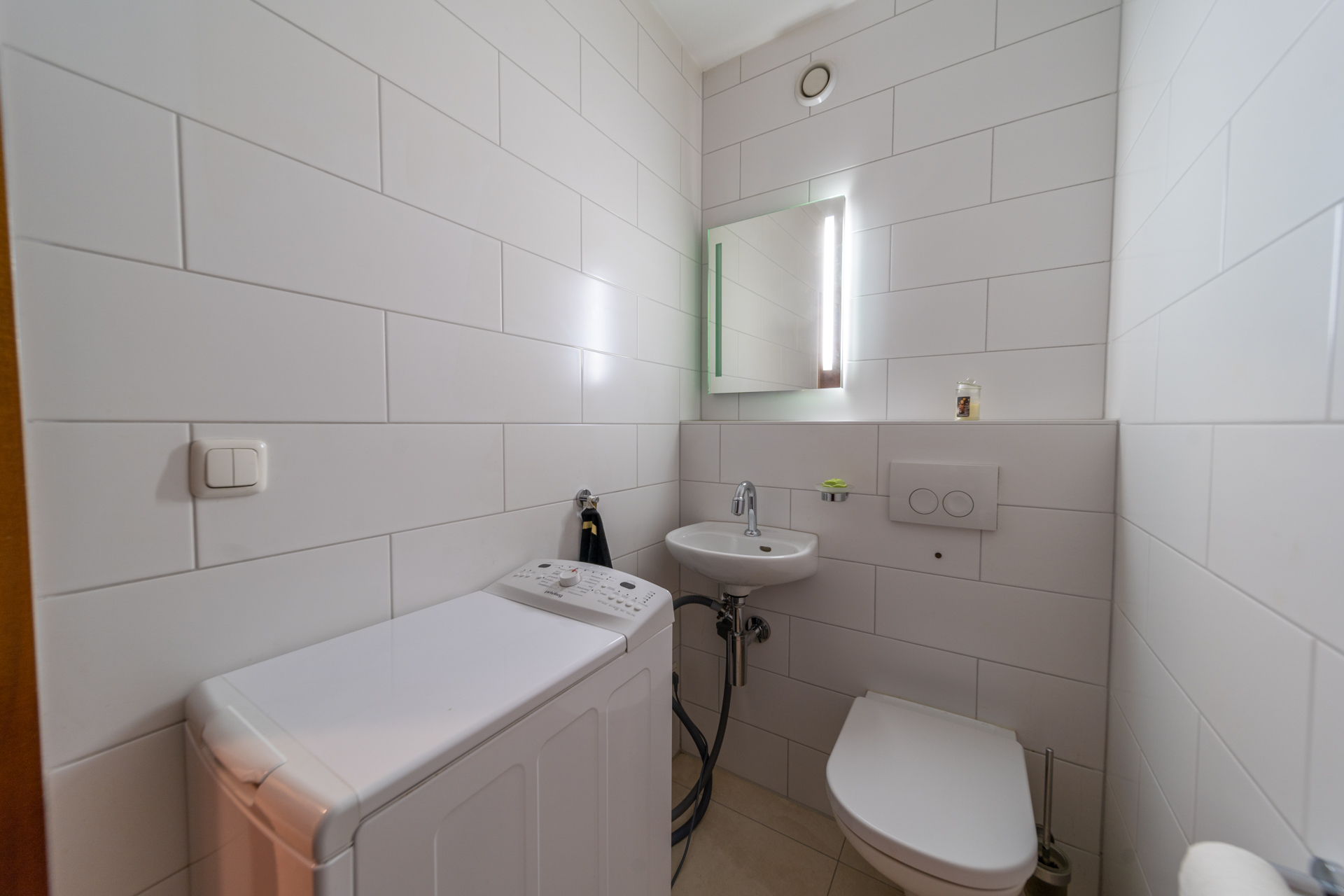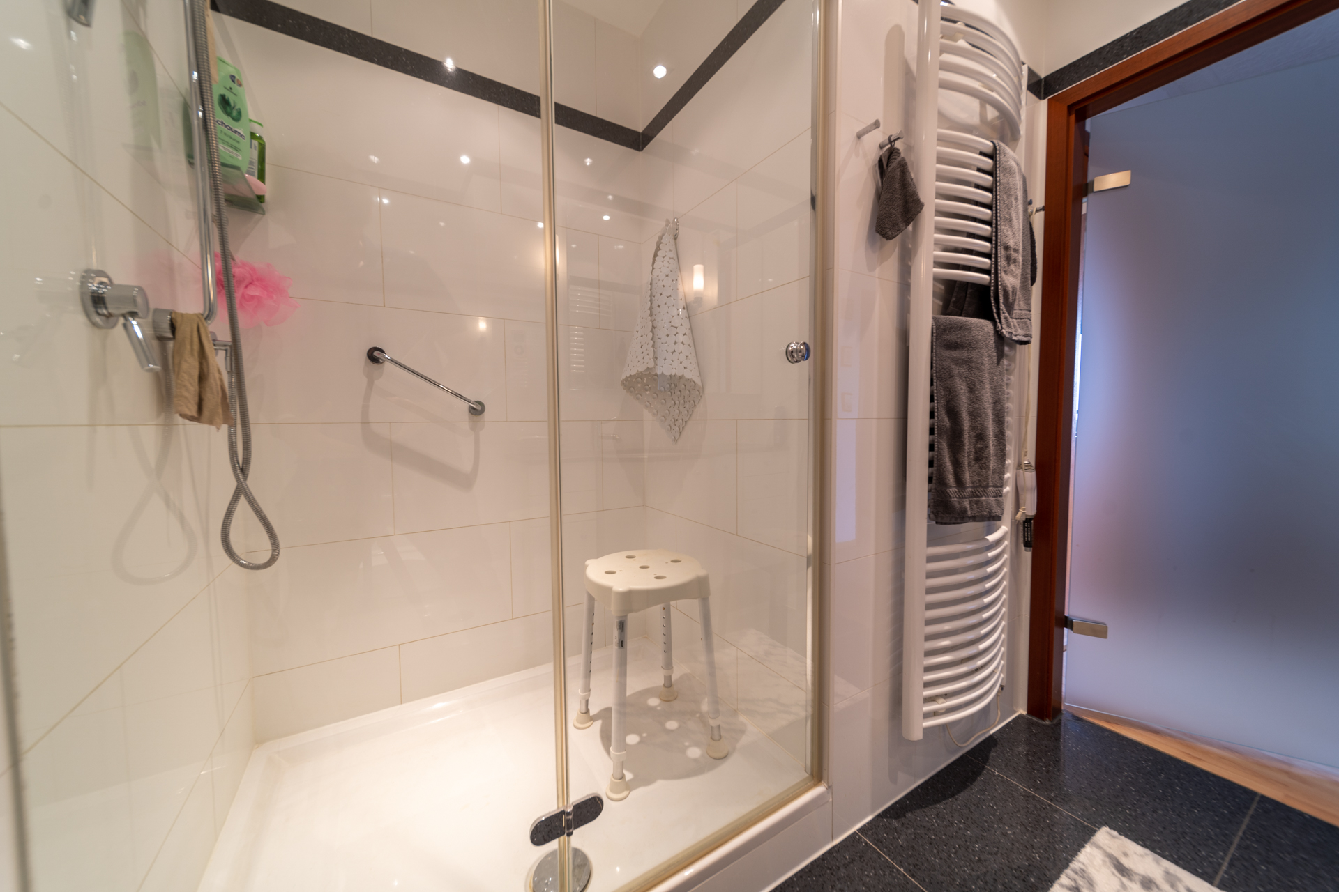 Ein Gäste-WC sowie ein modern gestaltetes Badezimmer mit großer Dusche und Handtuchheizung runden das Raumangebot ab. Der großzügige Eingangsbereich bietet zudem viel Platz für Garderobe und Stauraum.