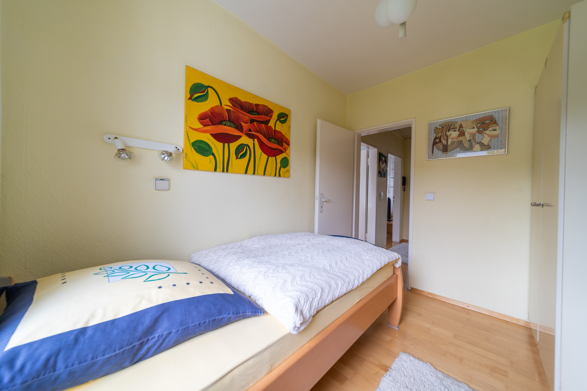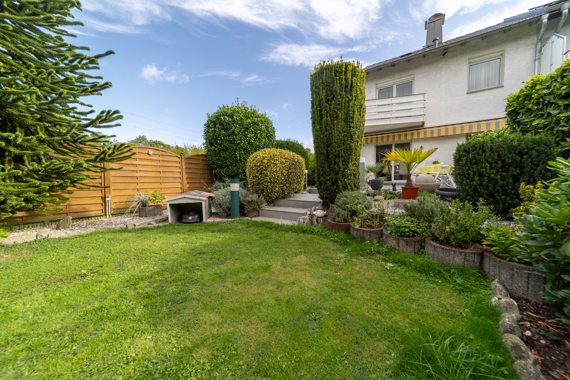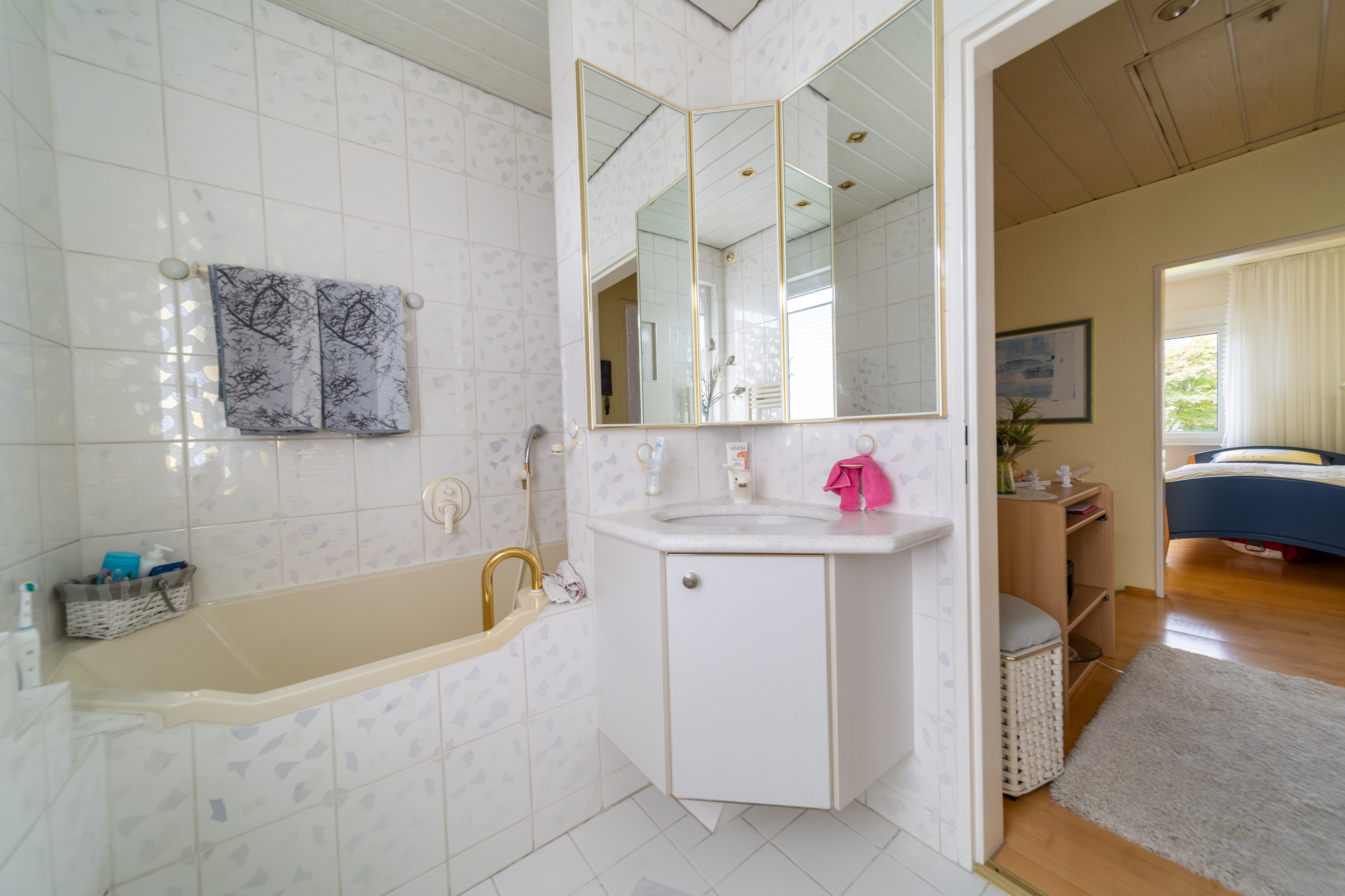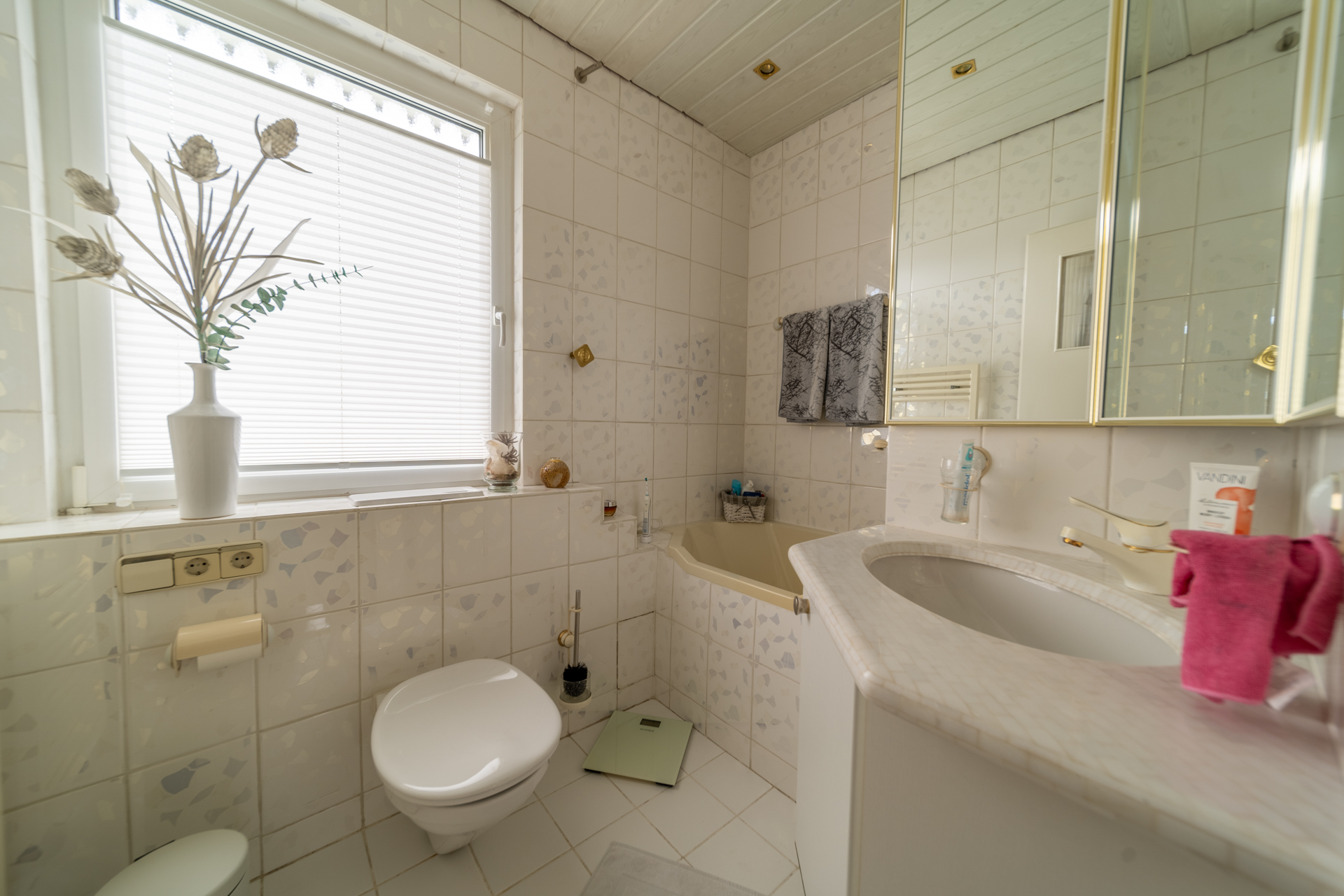 Das Tageslichtbad mit Duschwanne sorgt für einen guten Start in den Tag. Besonders schön: Ein Schlafzimmer verfügt über einen Balkon mit Blick in den grünen Garten.