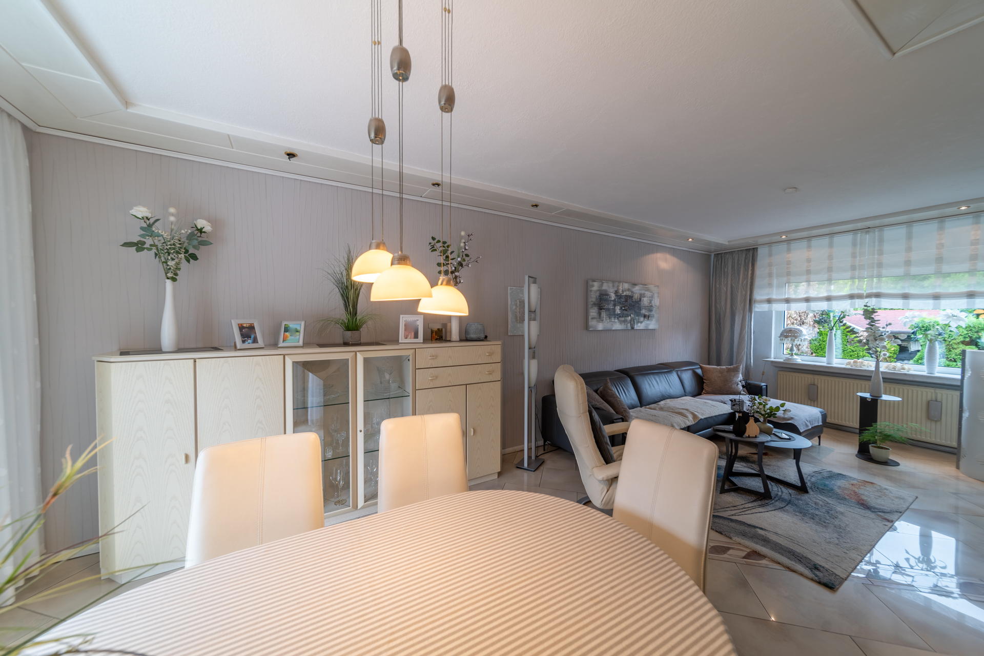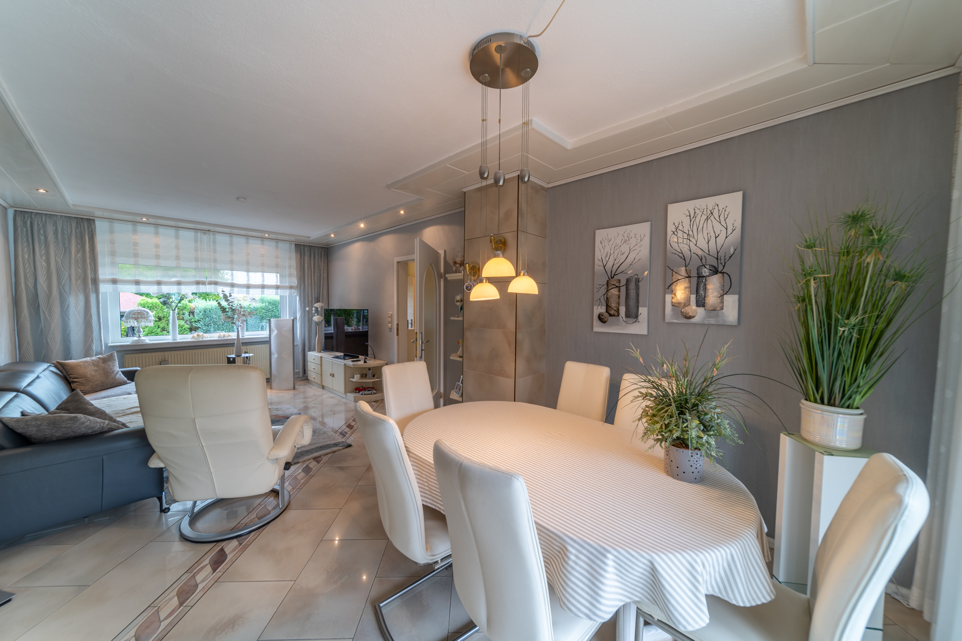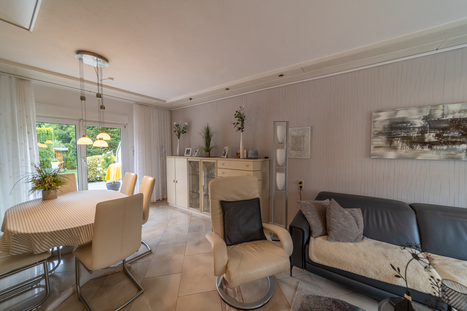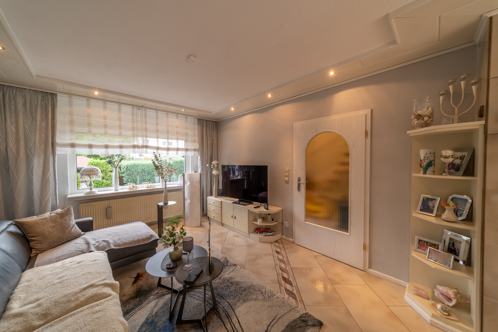 Im Erdgeschoss erwartet Sie ein großzügiger Wohn- und Essbereich, der das Herzstück des Hauses bildet. Hier hat die ganze Familie Platz, um gemeinsam Zeit zu verbringen. Die angrenzende Küche ermöglicht kurze Wege und eine offene Verbindung zum Geschehen. Von Wohnzimmer und Essbereich gelangen Sie direkt auf die geflieste Terrasse – perfekt für Mahlzeiten im Freien oder entspannte Nachmittage. Der schön angelegte Garten mit Südwestausrichtung bietet Kindern viel Platz zum Spielen und lädt Erwachsene gleichermaßen zum Entspannen ein. Eine Gartenhütte ergänzt das Familienparadies praktisch und charmant.