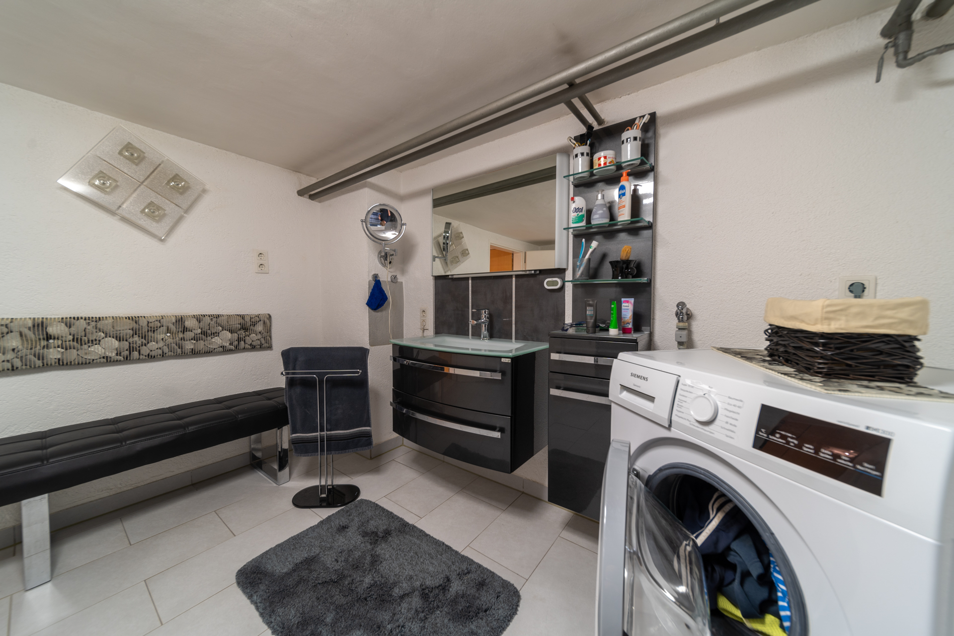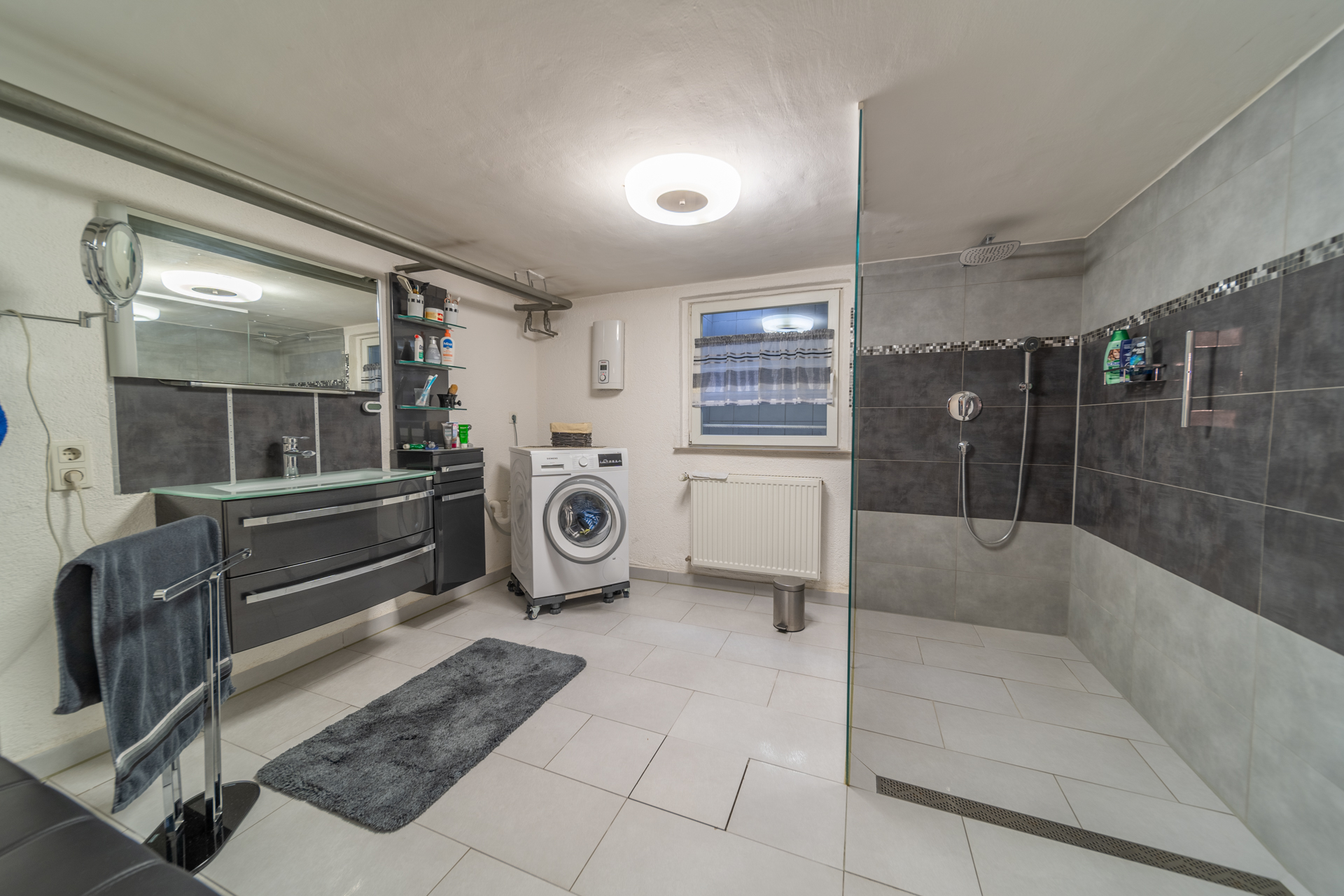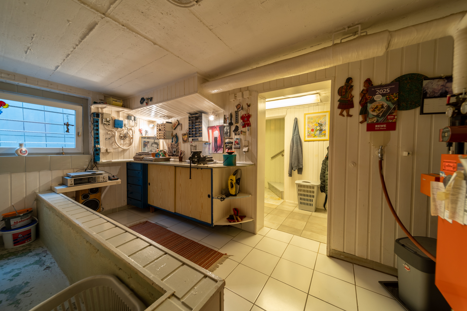 Das Haus ist voll unterkellert und bietet damit wertvolle Zusatzfläche. Neben einem Lagerraum gibt es eine Waschküche mit einer weiteren ebenerdigen Dusche sowie den Heizraum mit Öltank und kleiner Werkbank – praktisch für Hobbys oder kleinere Reparaturen. Beheizt wird das Haus über eine zentrale Ölheizung.