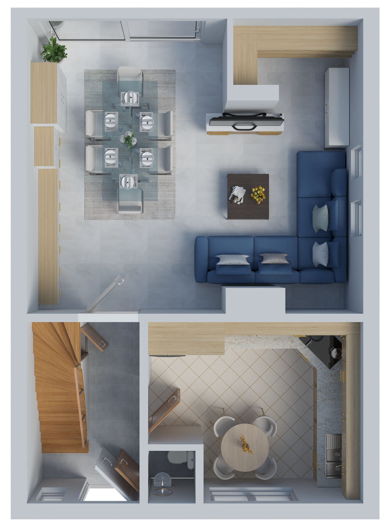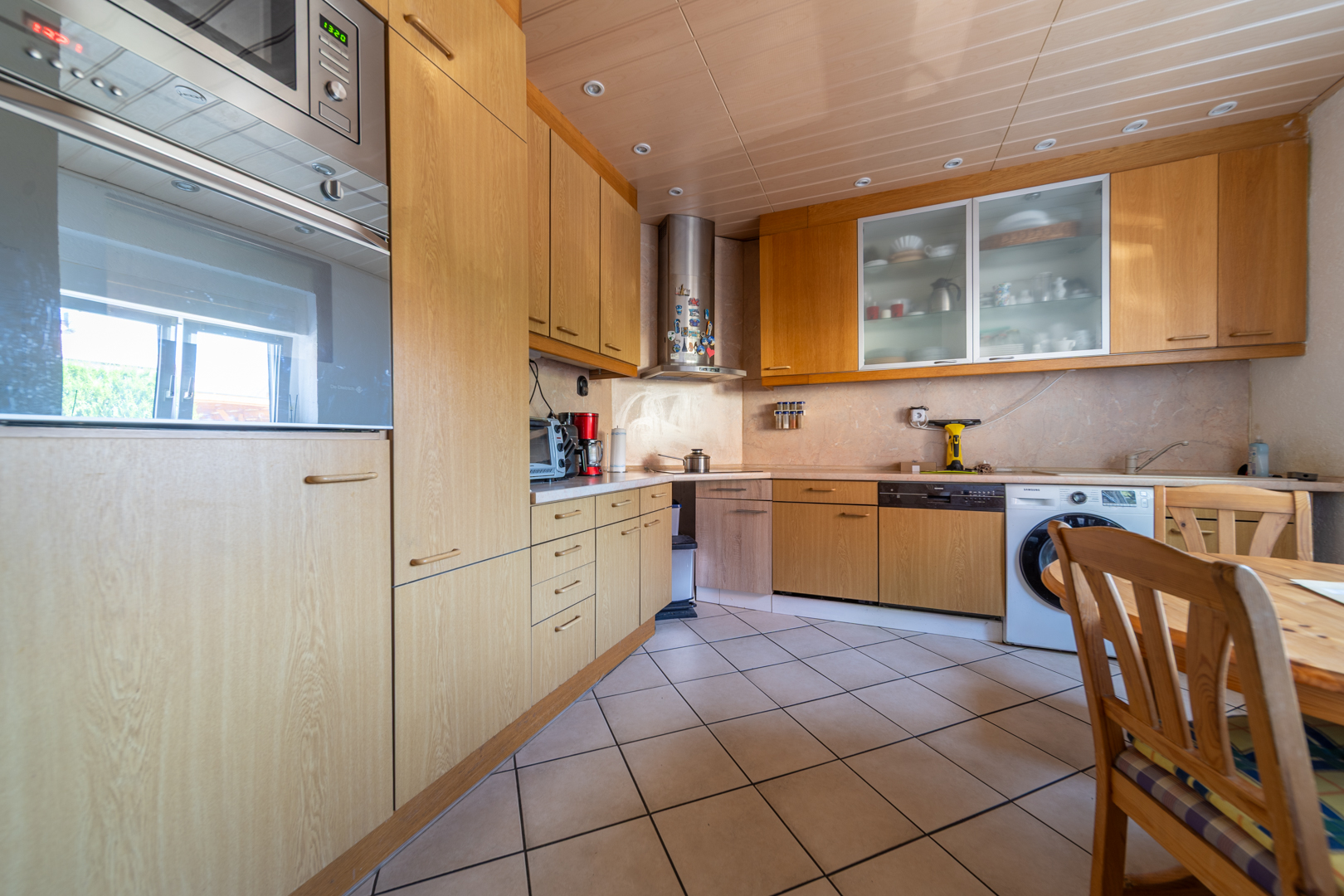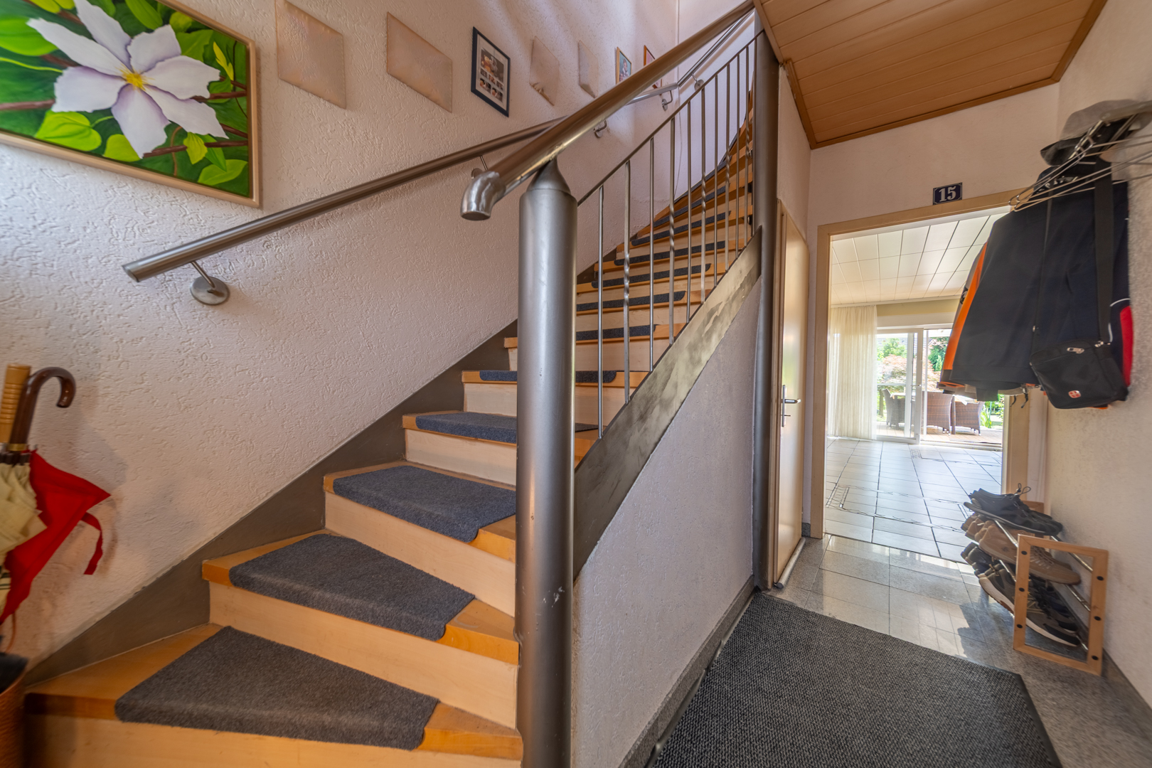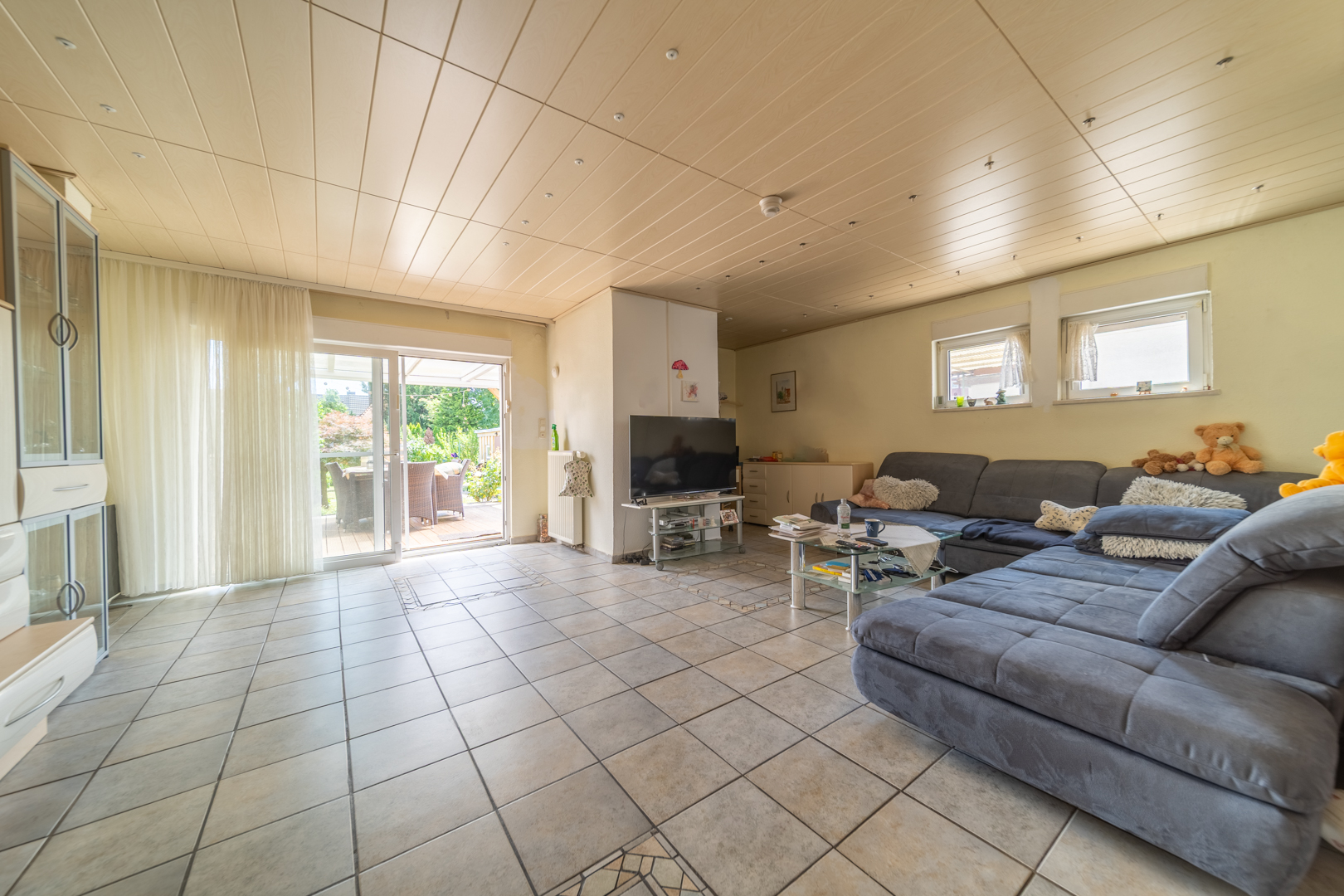Im Erdgeschoss empfängt Sie ein großzügig geschnittenes Wohnzimmer mit direktem Zugang zur überdachten Terrasse – der perfekte Ort, um den Garten mit seinen vielen Grünflächen in vollen Zügen zu genießen. Die angrenzende Küche ist funktional ausgestattet mit allen gängigen Elektrogeräten und bietet zusätzlich einen Anschluss für die Waschmaschine. Ein Gäste-WC komplettiert das Raumangebot auf dieser Etage.