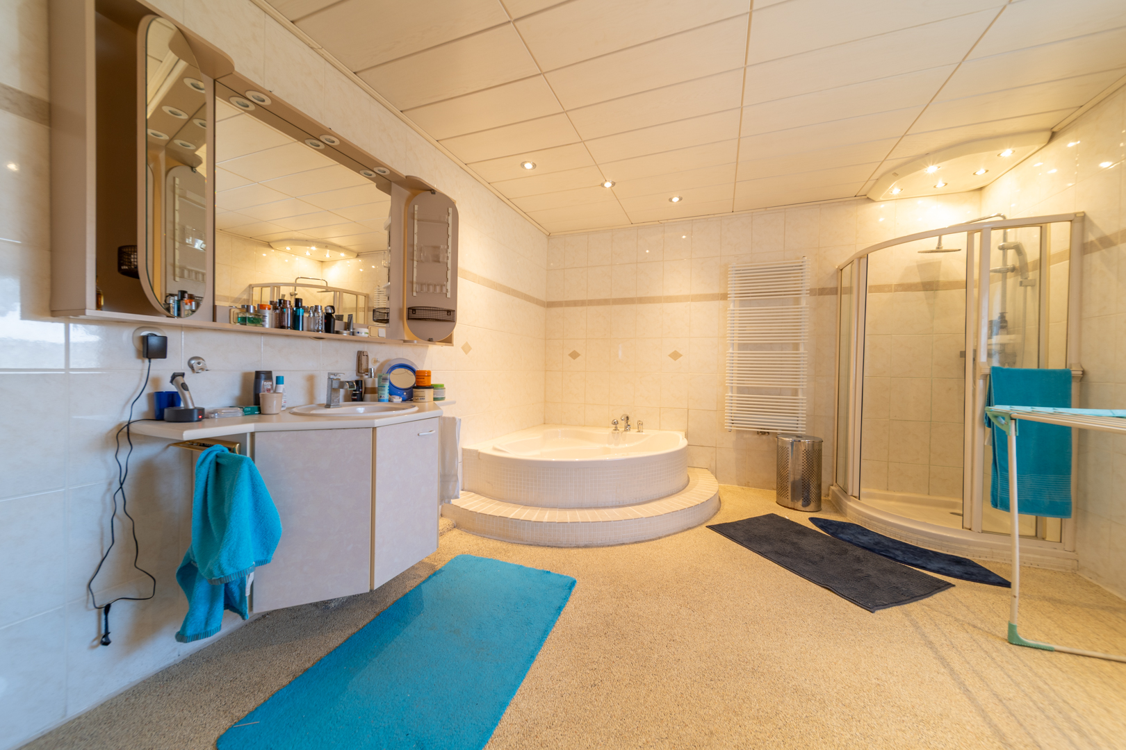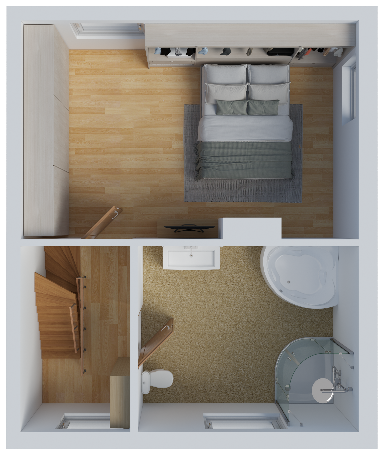 Über eine offene Treppe gelangen Sie in das Obergeschoss, wo ein sehr geräumiges Schlafzimmer mit südöstlicher Ausrichtung viel Tageslicht bietet. Das ebenfalls großzügige Badezimmer verfügt über sowohl eine Badewanne als auch eine separate Dusche – ideal für den Alltag und entspannte Stunden.
