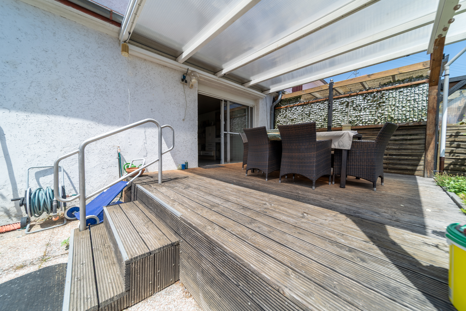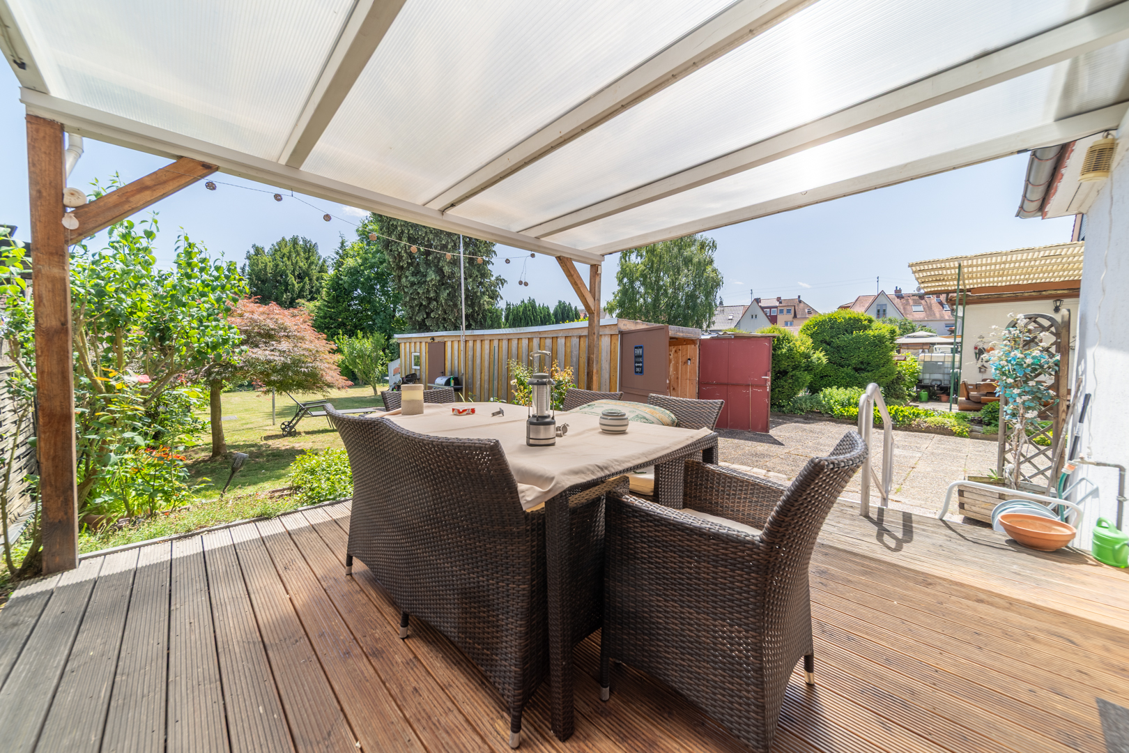 Ein besonderes Highlight ist der Garten: Neben der überdachten Terrasse lädt eine weitläufige Grünfläche zum Verweilen ein – eine echte kleine Wohlfühloase mitten im Alltag.